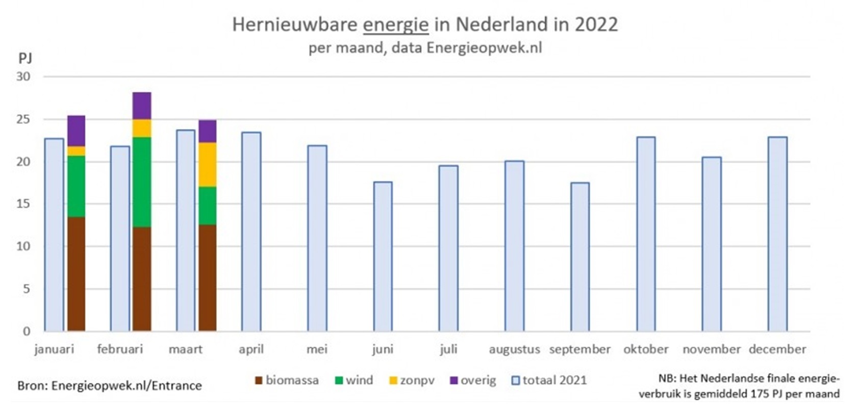 Ondanks de overvloed aan zon in de maand maart groeide de productie van hernieuwbare energie met slechts 5 procent. Dit komt met name doordat de maand maart arm aan wind was, en mild qua temperatuur. Daardoor leverden windmolens en warmtepompen maar een bescheiden bijdrage.