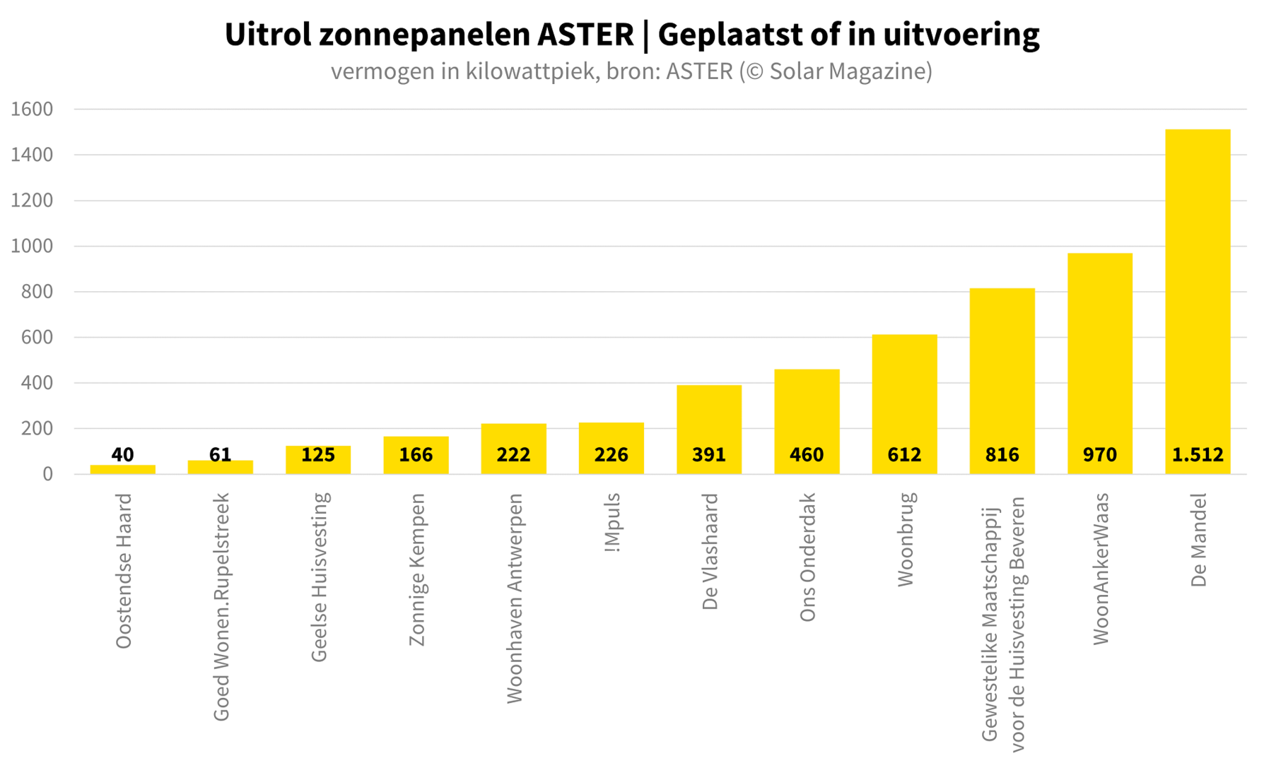ASTER – een initiatief van de Vereniging van Vlaamse Huisvestingsmaatschappijen (VVH) – wil in Vlaanderen tot 2025 honderdduizenden zonnepanelen laten installeren op de daken van meer dan 50.000 sociale huurwoningen. Half oktober werd het startschot gegeven voor de installatie van 150 megawattpiek aan zonnepanelen.