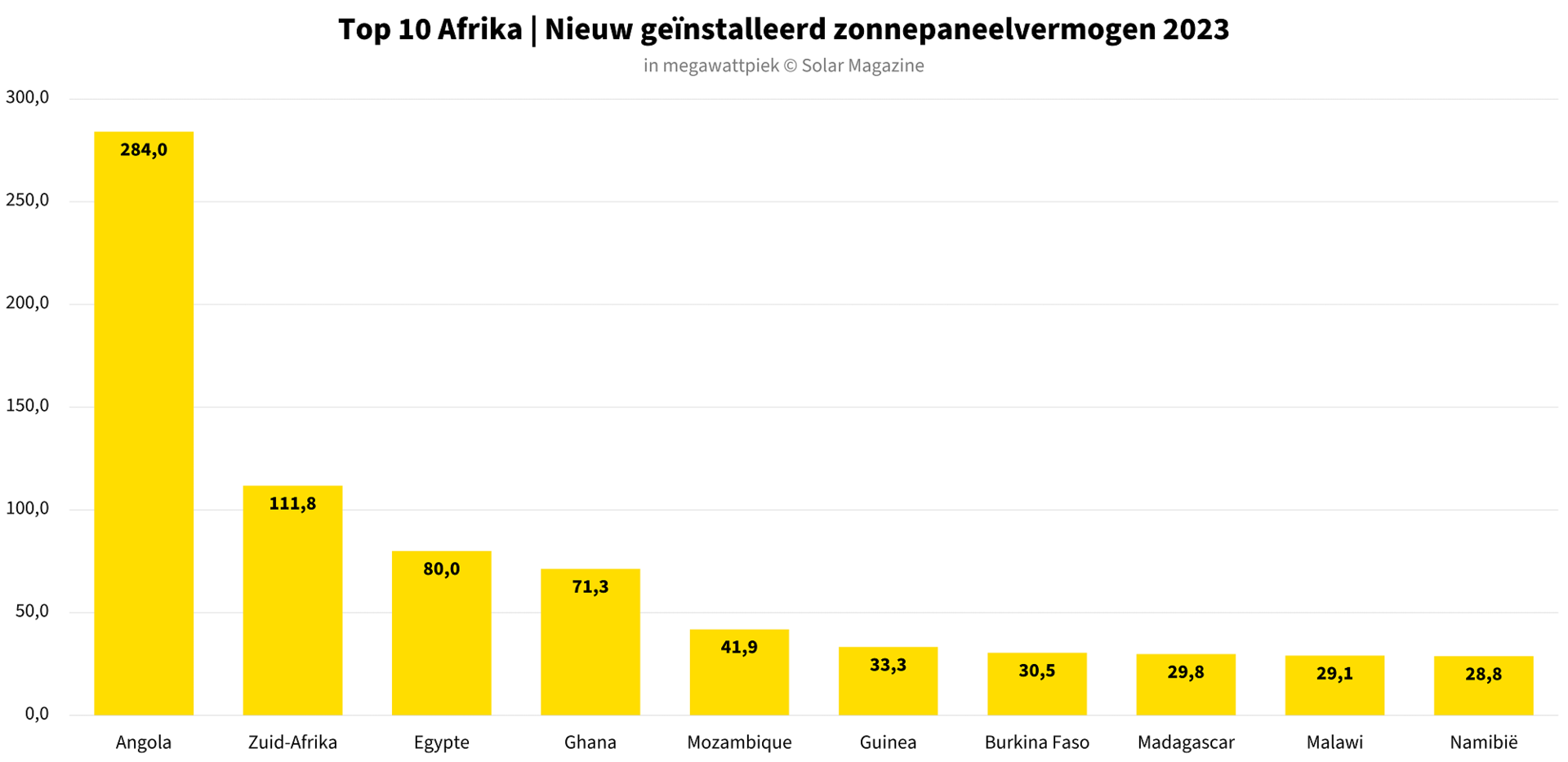 Angola laat runner-up Zuid-Afrika ruimschoots achter zich. Zuid-Afrika is daarbij wel het enige andere land dat afgelopen kalenderjaar meer dan 100 megawattpiek aan zonnepanelen installeerde.