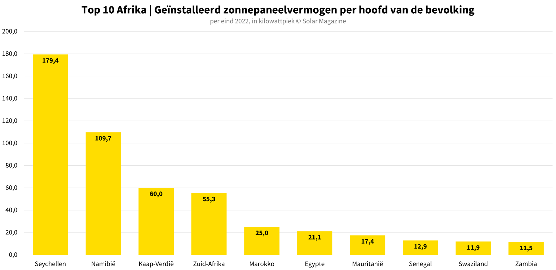 Ter vergelijking: per hoofd van de bevolking tellen de Seychellen 179,4 wattpiek aan zonnepanelen en Nederland 1.044 wattpiek.