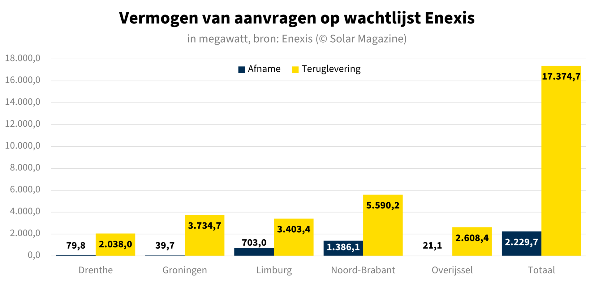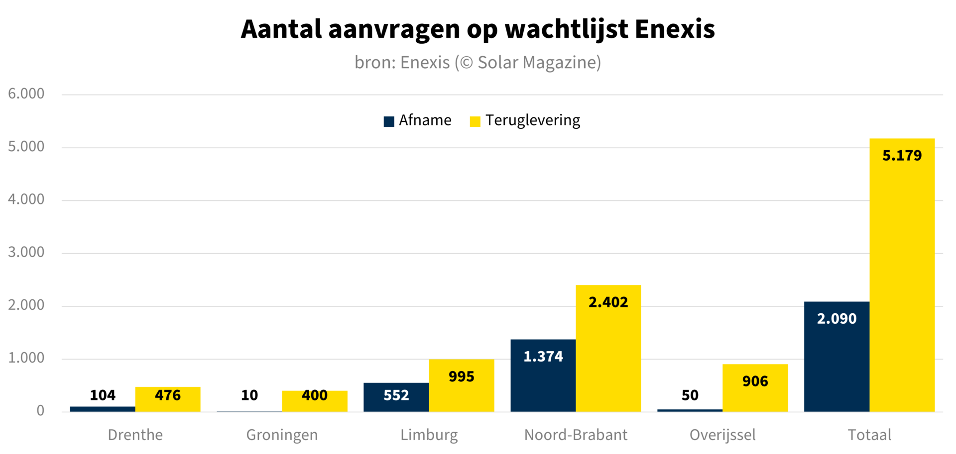 Niet alleen voor de teruglevering van duurzame energie, maar ook voor de afname van stroom kampt Enexis met een lange wachtlijst in de provincies Drenthe, Groningen, Limburg, Noord-Brabant en Overijssel. Zowel de wachtlijst voor afname als voor teruglevering heeft betrekking op grootverbruikers.