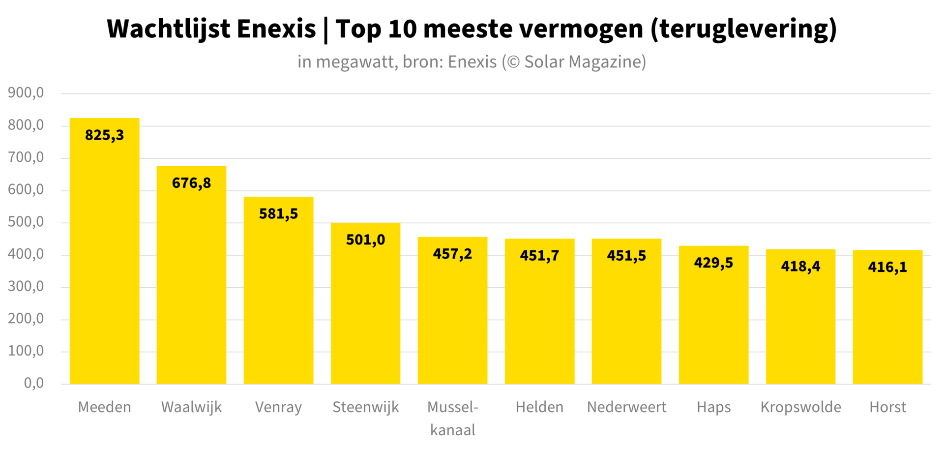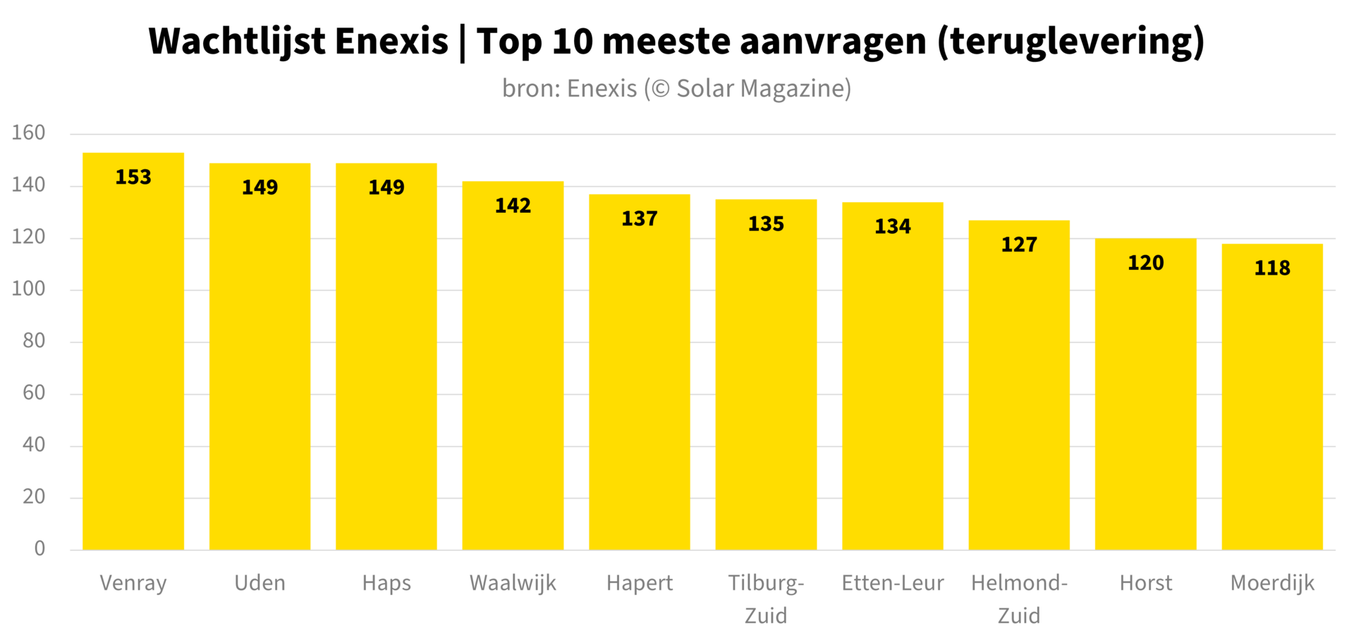 Voor het Limburgse elektriciteitsstation Venray staan nog altijd de meeste aanvragen voor de teruglevering van stroom met windmolens dan wel zonnepanelen op de wachtlijst: 153 in totaal, 2 meer dan 1,5 maand eerder. Het Groningse elektriciteitsstation Meeden heeft echter de twijfelachtige eer om het meeste terugleververmogen op de wachtlijst te hebben: maar liefst 825,3 megawatt verdeeld over 29 aanvragen. Er is in de afgelopen periode 1 aanvraag op de wachtlijst bij gekomen.