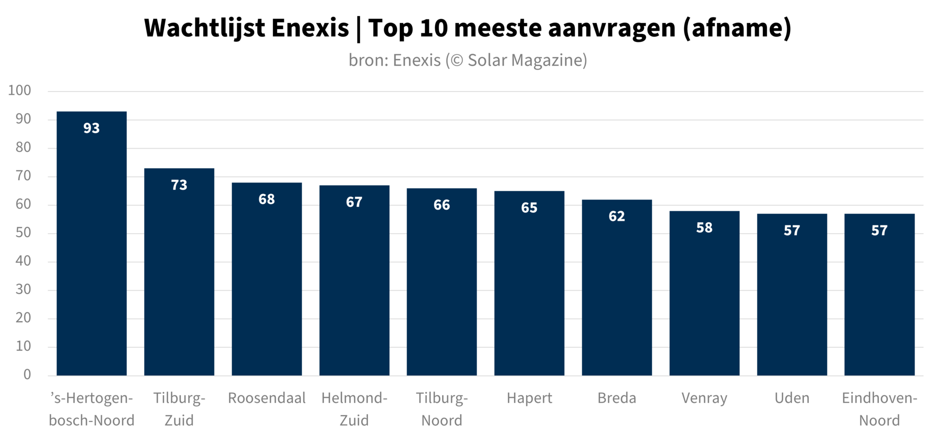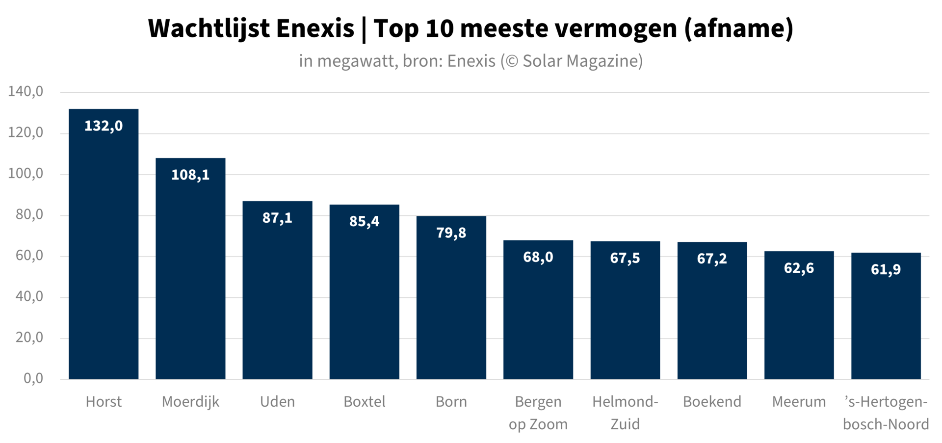 Tot slot kent het Brabantse elektriciteitsstation Den Bosch-Noord in het werkgebied van Enexis de langste wachtlijst voor de afname van stroom, terwijl het Limburgse station Horst het grootste vermogen op de afnamewachtlijst heeft.