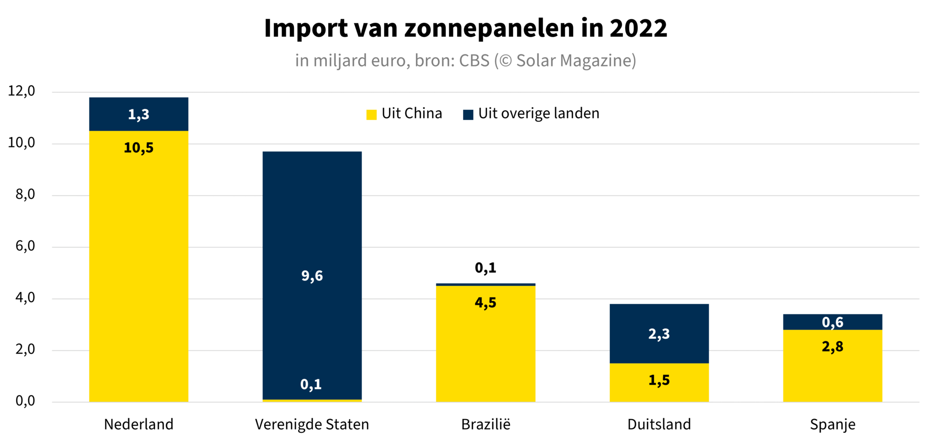 Het CBS meldt dat 89 procent van de zonnepanelen uit China afkomstig is. Ongeveer 60 procent van de door Nederland ingevoerde zonnepanelen gaat na invoer meteen door naar andere landen, meestal binnen de Europese Unie (EU). Circa 40 procent wordt meteen ingezet in Nederland of opgeslagen in voorraad voor later gebruik, in Nederland of in het buitenland.