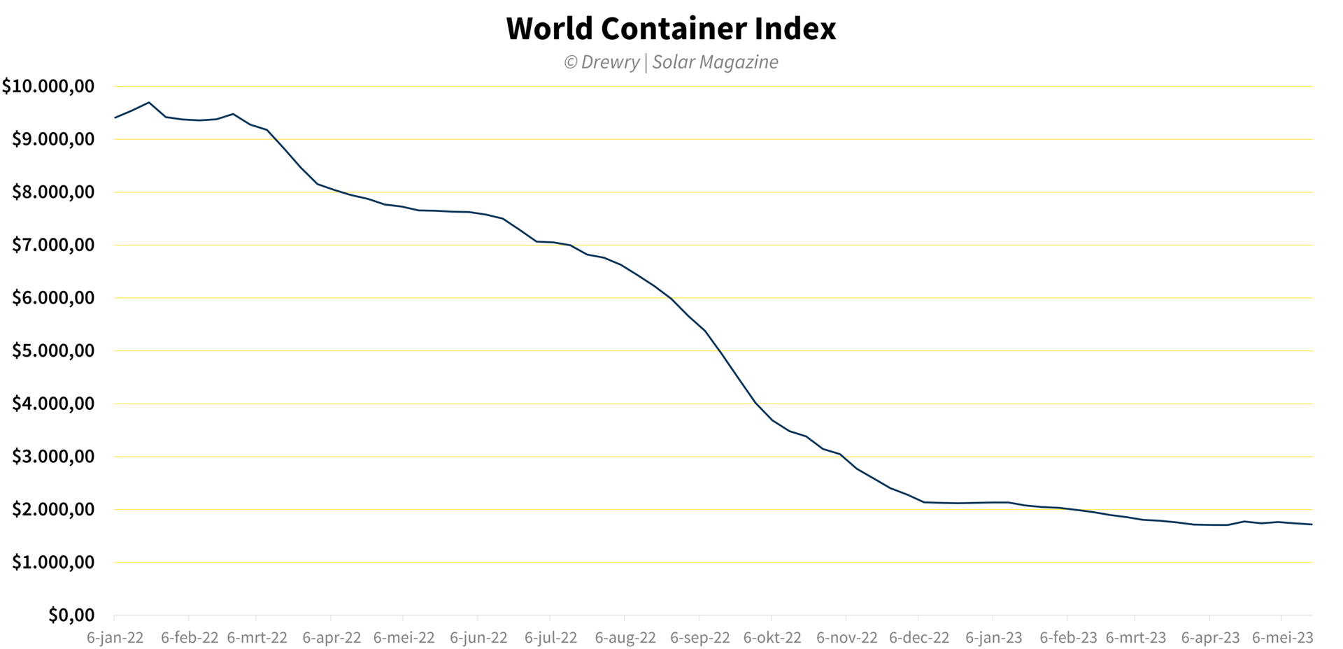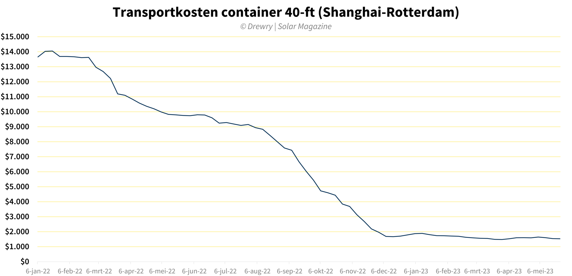 Onderstaande grafiek toont de prijsontwikkeling van het transport van een container van 40 voet van Shanghai naar Rotterdam. Afgelopen week daalden de kosten met 10 procent, te weten met 150 Amerikaanse dollar tot 1.299 Amerikaanse dollar. Die prijs is 81 procent lager dan vorig jaar. Per container van 40 voet vervoeren Chinese fabrikanten zo’n 800 tot 900 zonnepanelen. Van grootformaatzonnepanelen met hogere vermogens gaan er zelfs maar zo’n 600 tot 700 in een container. Tijdens de coronacrisis stegen de transportkosten explosief en op het hoogtepunt lagen ze per zonnepaneel circa 20 Amerikaanse dollar hoger. Inmiddels zijn de precoronaprijzen echter weer bereikt.