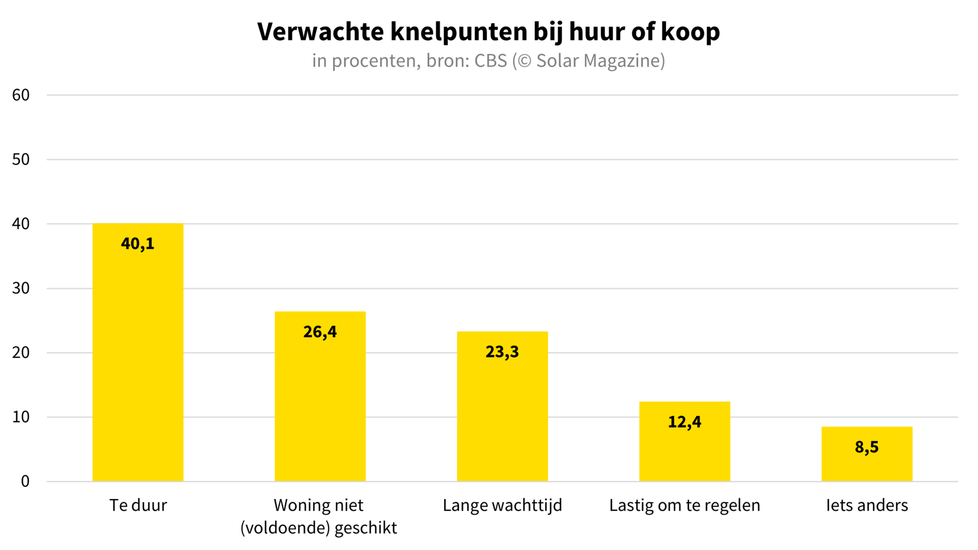 Het CBS heeft van de 1 op de 4 ondervraagden die de komende 2 jaar wél verwacht zonnepanelen te installeren de verwachte knelpunten in kaart gebracht.