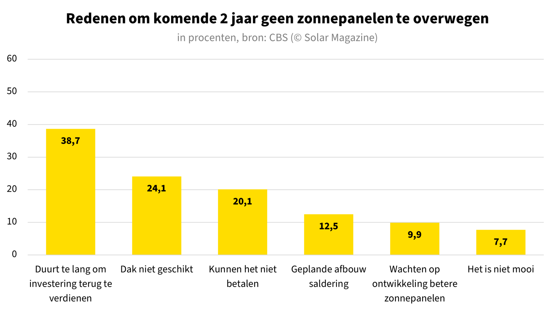Slechts 2,4 procent van de betrokkenen – 12,5 procent van de 19,4 procent van de woningeigenaren die de komende 2 jaar geen zonnepanelen wil installeren – noemt de afbouw van de salderingsregeling als reden.