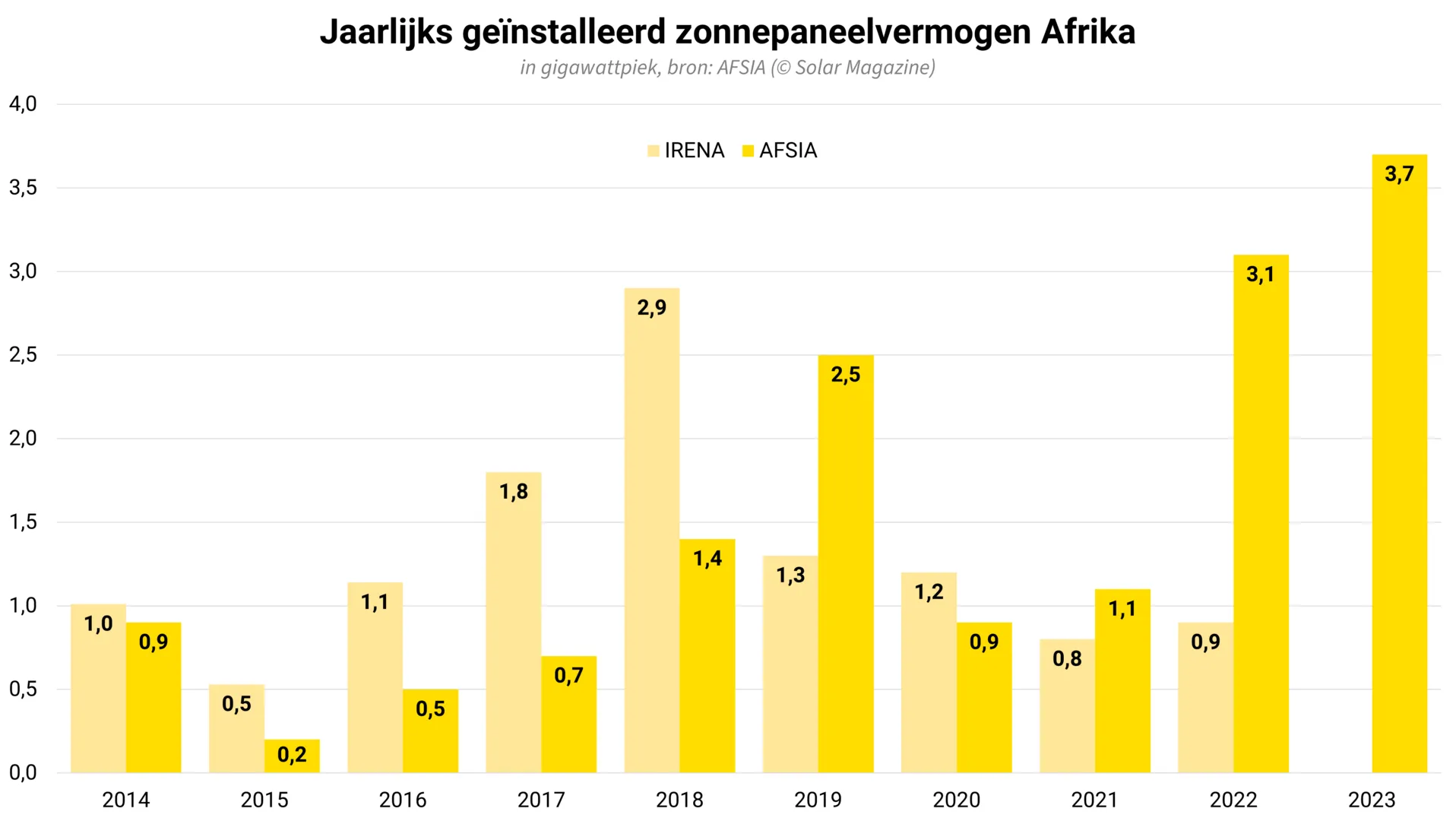 Volgens de nieuwste cijfers van AFSIA beschikt Afrika per eind vorig jaar over 15,3 gigawattpiek aan zonnepanelen, waarbij het internationaal agentschap voor hernieuwbare energie IRENA per eind 2022 spreekt over 12,4 gigawattpiek. Waar IRENA voor het geïnstalleerde vermogen importcijfers van zonnepanelen hanteert, telt AFSIA enkel de daadwerkelijk als opgeleverd geregistreerde projecten mee. Daarbij heeft de Afrikaanse brancheorganisatie 1.006 megawattpiek (red. behorend tot de genoemde 15,3 gigawattpiek) aan pv-installaties in haar database waarvoor het realisatiejaar onbekend is.