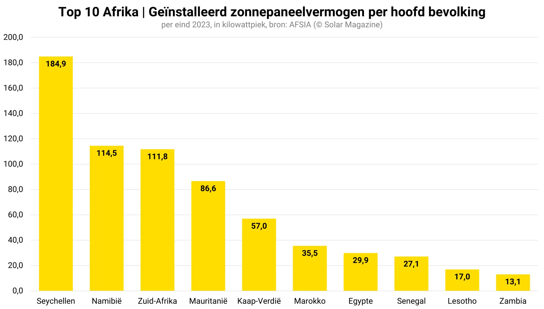 Tegelijkertijd geeft de top 10 qua nieuw geïnstalleerd vermogen nog altijd een vertekend beeld. Want berekend naar hoofd van de bevolking is Zuid-Afrika slechts op de derde plaats in de top 10 terug te vinden qua cumulatief geïnstalleerd vermogen. Daar zijn het de Seychellen die de dans leiden. De eilandengroep – die zo’n 100.000 inwoners telt – dankt die koppositie vooral aan het zonnepark van 5 megawattpiek op het kunstmatige eiland Romainville, zo’n kilometer uit de kust van de hoofdstad Victoria. De zonneweide is aangesloten op een batterij met een opslagcapaciteit van 3,3 megawattuur.