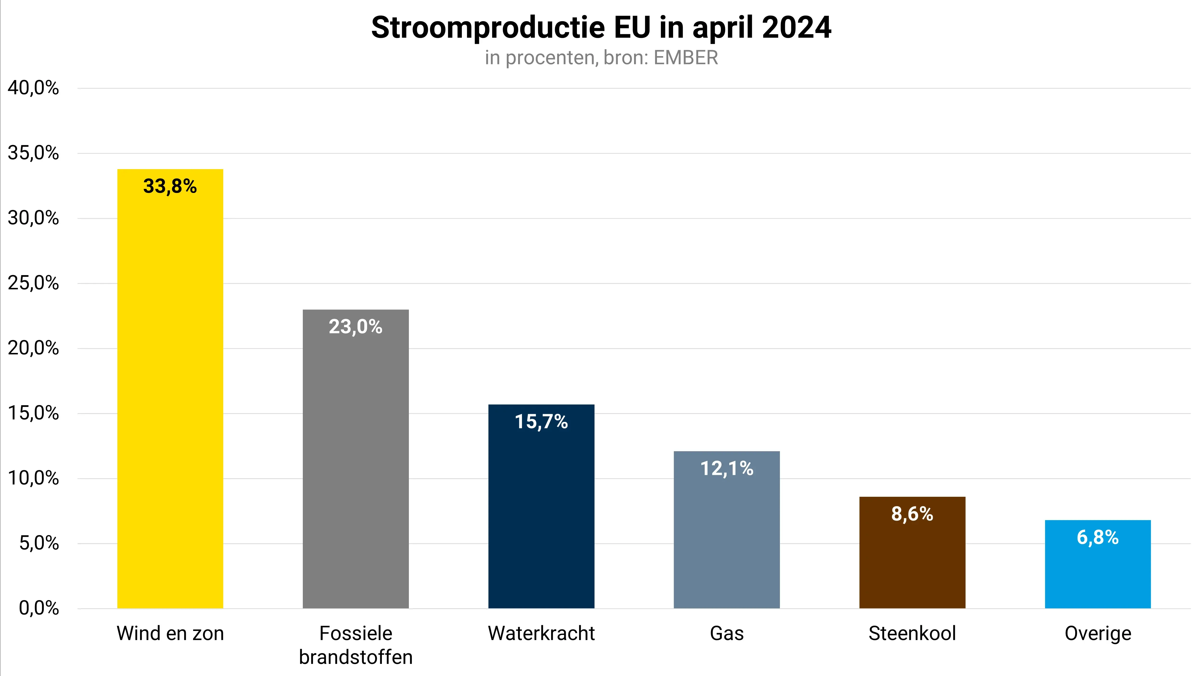 In april 2024 daalde in de Europese Unie (EU) de elektriciteitsproductie met fossiele brandstoffen tot een niveau van 23 procent, dat 24 procent lager is dan in april 2023 en dit ondanks dat de vraag naar stroom is toegenomen. Het vorige ‘laagterecord’ was 27 procent uit mei 2023. Afgelopen april werd 14,8 terawattuur minder ‘fossiele’ stroom geproduceerd met een totale stroomproductie uit fossiele brandstoffen van 46 terawattuur.