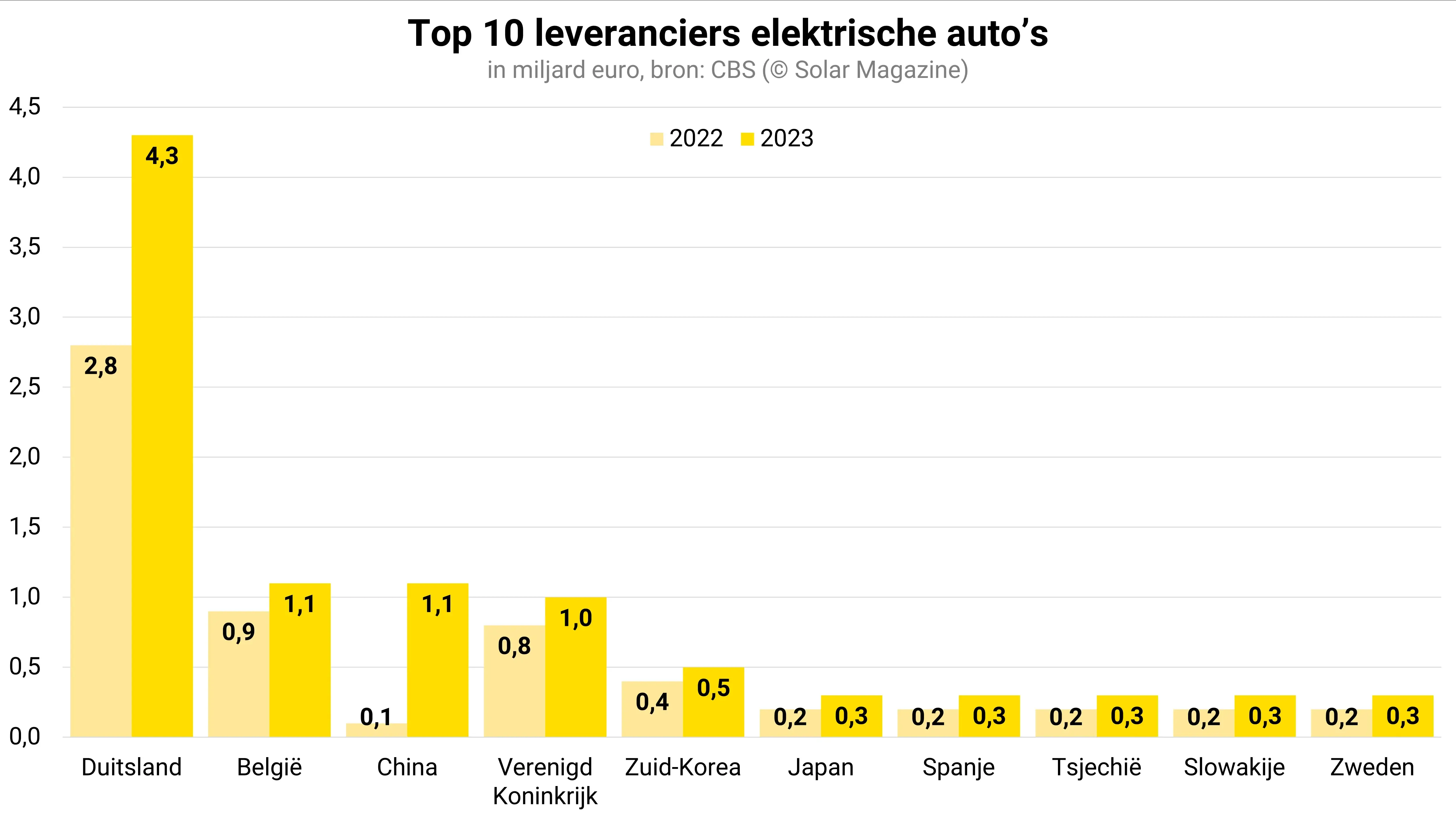 In 2023 importeerde Nederland voor 1,1 miljard euro aan elektrische auto’s uit China. Dat is 13 keer meer dan in 2022. Verreweg de meeste elektrische auto’s kwamen echter uit Duitsland voor een waarde van 4,3 miljard euro. Dat is wel ‘slechts’ zo’n 50 procent meer dan een jaar eerder.