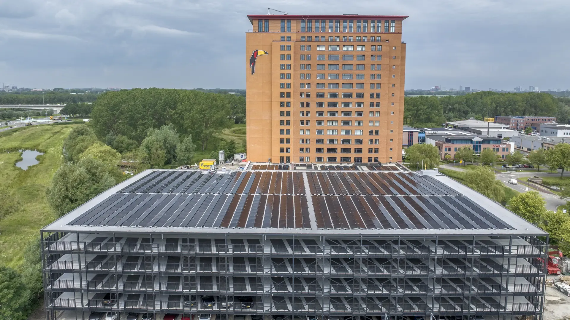 De zonnepanelen van Hotel Van der Valk Houten in cijfers Aantal zonnepanelen: 1.600 stuks Vermogen zonnepanelen: 440 wattpiek per stuk, totaalvermogen van 704 kilowattpiek Fabrikant zonnepanelen: AIKO Aantal omvormers: 3 omvormers van 90 kilowatt en 1 omvormer van 66 kilowatt Aantal power optimizers: 800 optimizers, type S1000 Fabrikant omvormers en power optimizers: SolarEdge Montagesystemen: ValkPro+ van Van der Valk Solar Systems en PVshelters van Conduct Installateur: Beter Duurzaam |