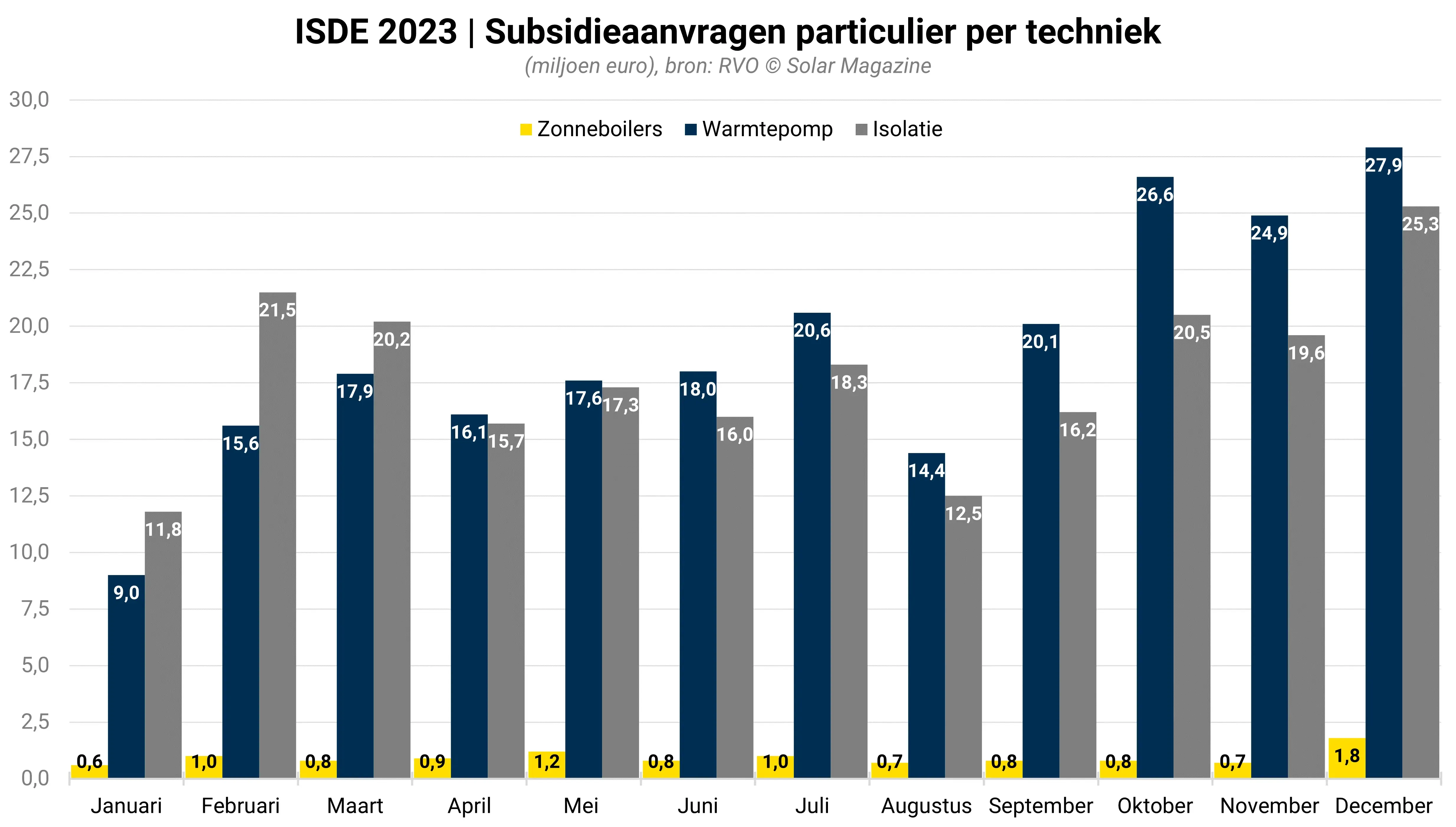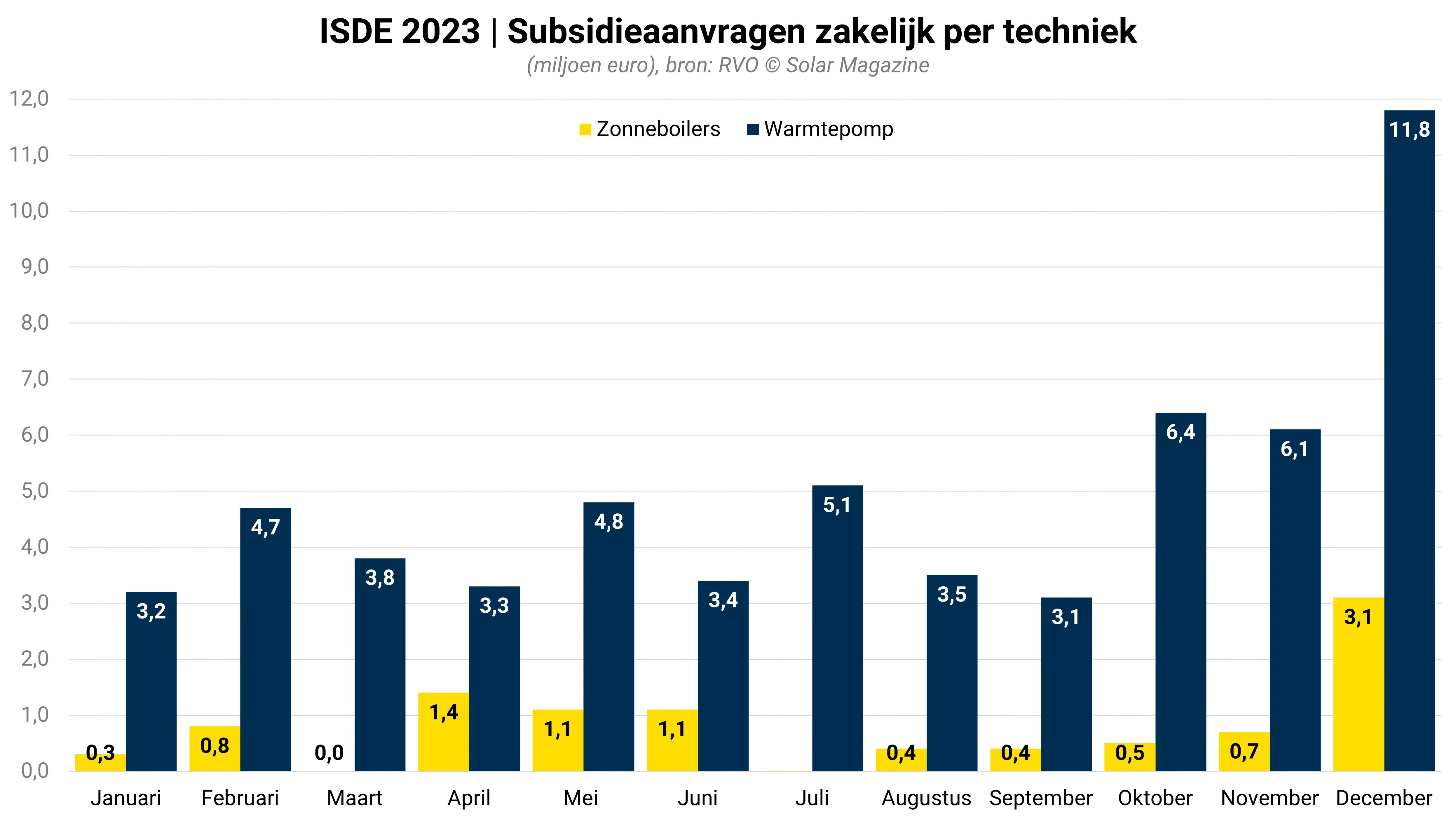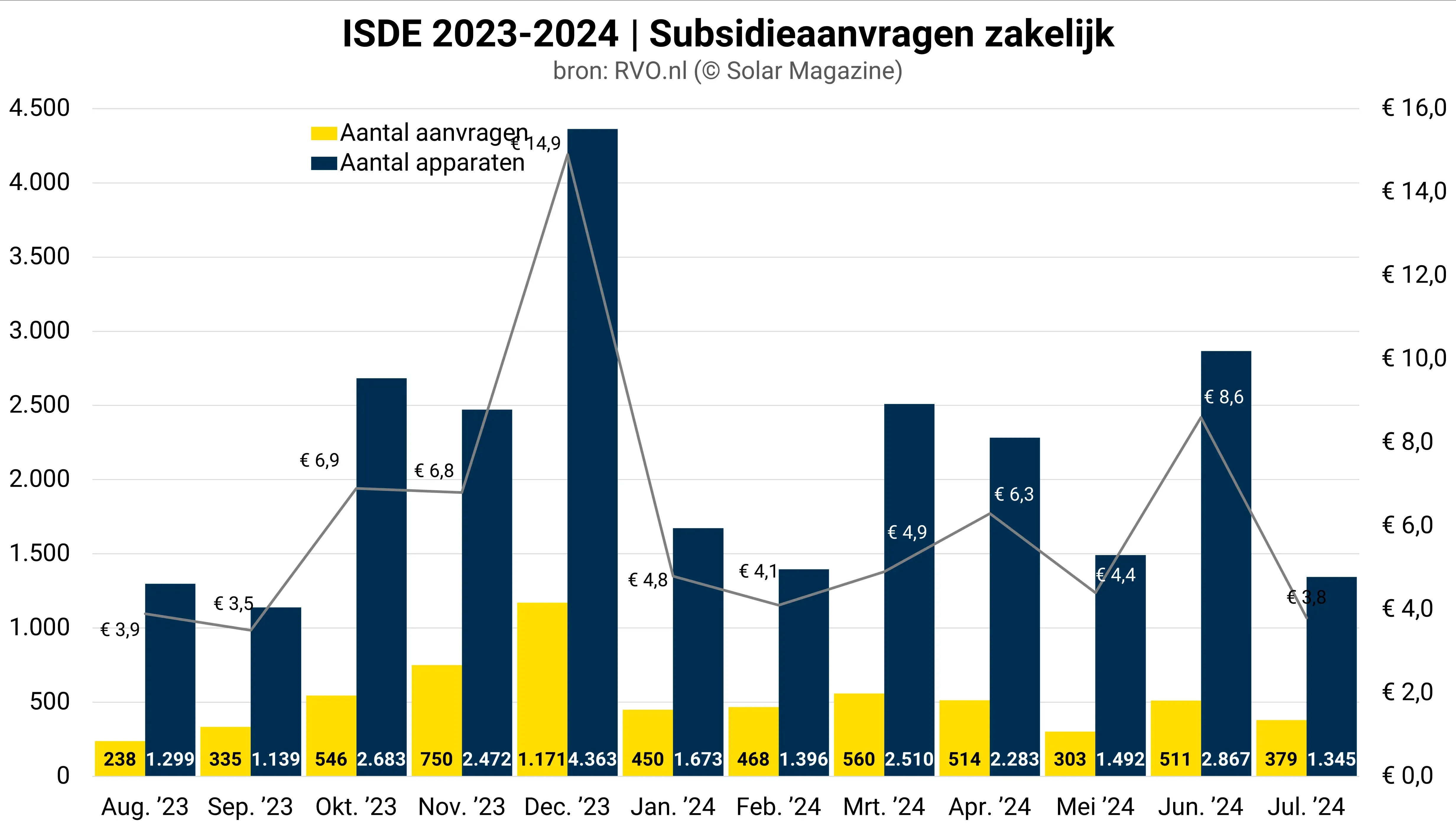 Uit de cijfers met subsidieaanvragen voor de zakelijke markt blijkt dat in juli 100.000 euro subsidie voor zonneboilers is aangevraagd, terwijl de subsidieaanvragen voor warmtepompen zich op het laagste niveau van dit kalenderjaar bevinden. Een maand eerder lagen ze juist nog op het hoogste niveau.