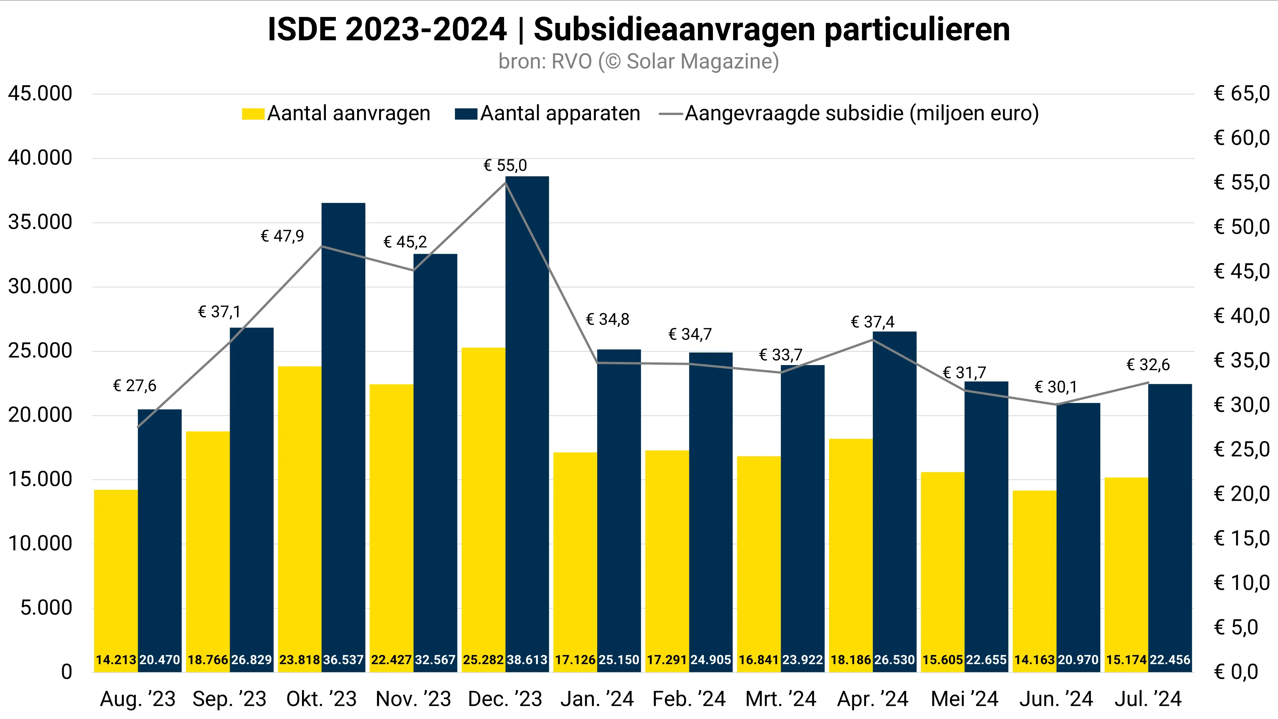 Via de Investeringssubsidie duurzame energie en energiebesparing (ISDE) vroegen consumenten in de maand juli 32,6 miljoen euro subsidie aan. 15.174 consumenten kregen daarbij voor 22.456 apparaten subsidie. Dat is een verbetering ten opzichte van de maand juni, maar nog wel onder het maandelijks gemiddelde. In juli werd daarbij voor zonneboilers wederom slechts 100.000 euro subsidie aangevraagd. Dat is 90 procent minder dan de 1 miljoen euro subsidie die in juli 2024 werd aangevraagd, maar daarbij moet opgemerkt worden dat de subsidie per vierkante meter zonnecollector sinds 1 januari 2024 fors verlaagd is.