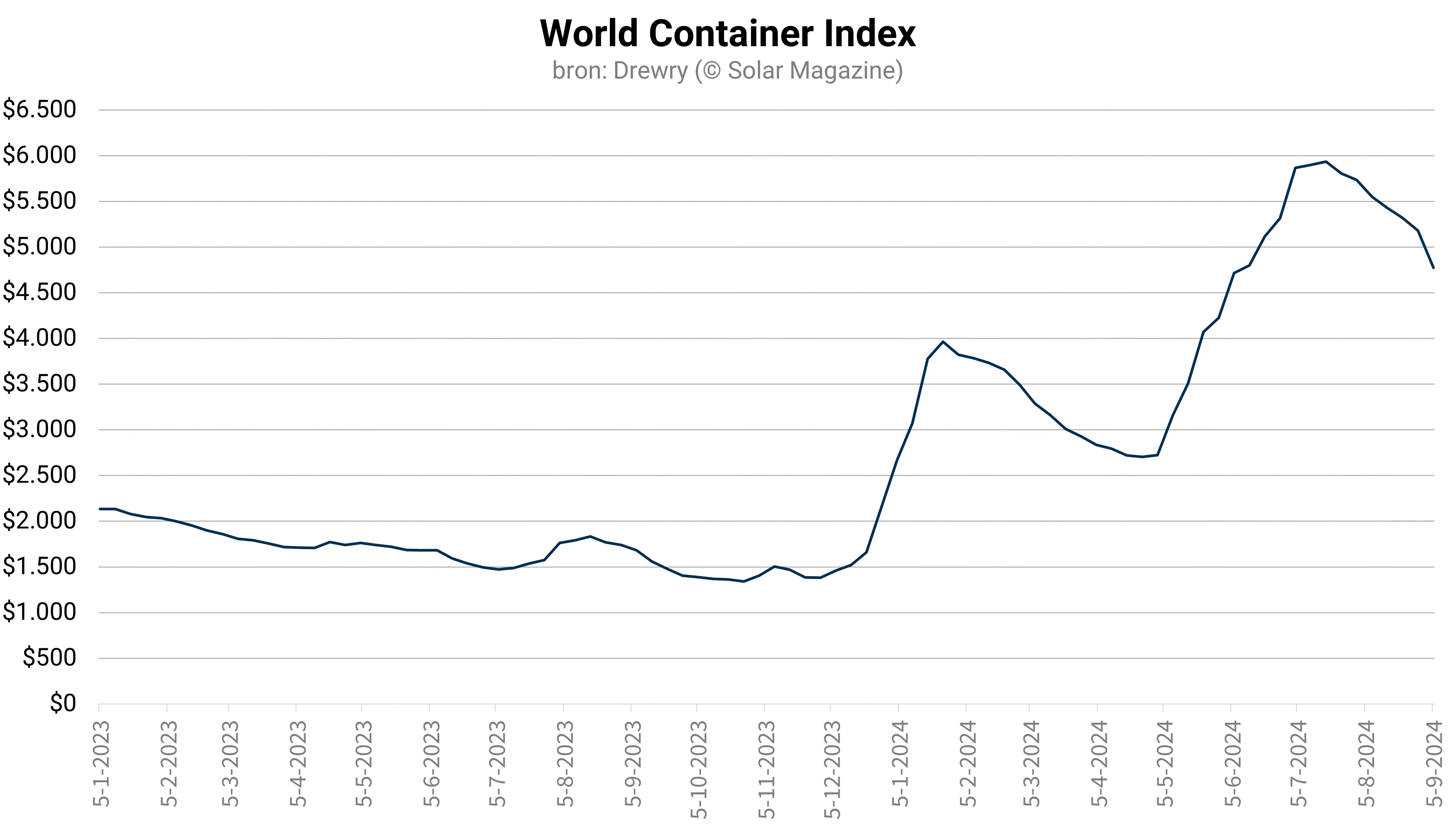Houthi-rebellen die vanaf Jemen containerschepen – die gelieerd zijn aan Israël en op de Rode Zee varen – aanvallen met raketten zorgden er eerder in januari voor dat de transportprijzen het hoogste niveau sinds vorig jaar zomer bereikten. In de maanden februari, maart en april daalden de prijzen echter weer wekelijks met enkele procenten en bereikten eind april het laagste niveau van dit kalenderjaar, waarna een snelle stijging plaatsvond.