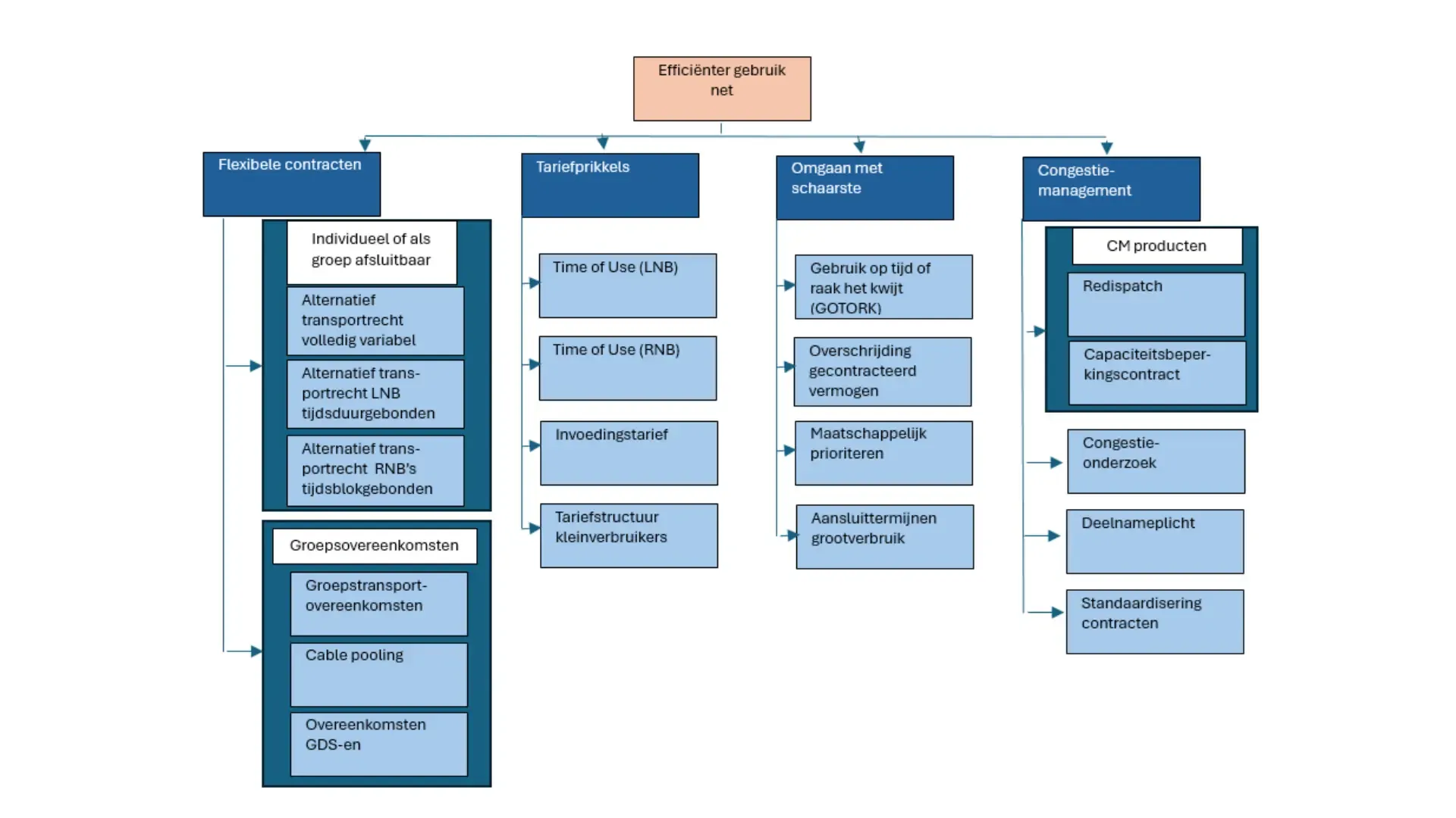 De genoemde maatregelen (red. zie afbeelding) zijn deels al in werking, en deels in voorbereiding. Naast deze maatregelen stelt de ACM op tal van vlakken te onderzoeken of er aanvullende mogelijkheden zijn om op effectieve wijze netcongestie te bestrijden. Hiervoor lopen diverse verkenningen en experimenten.