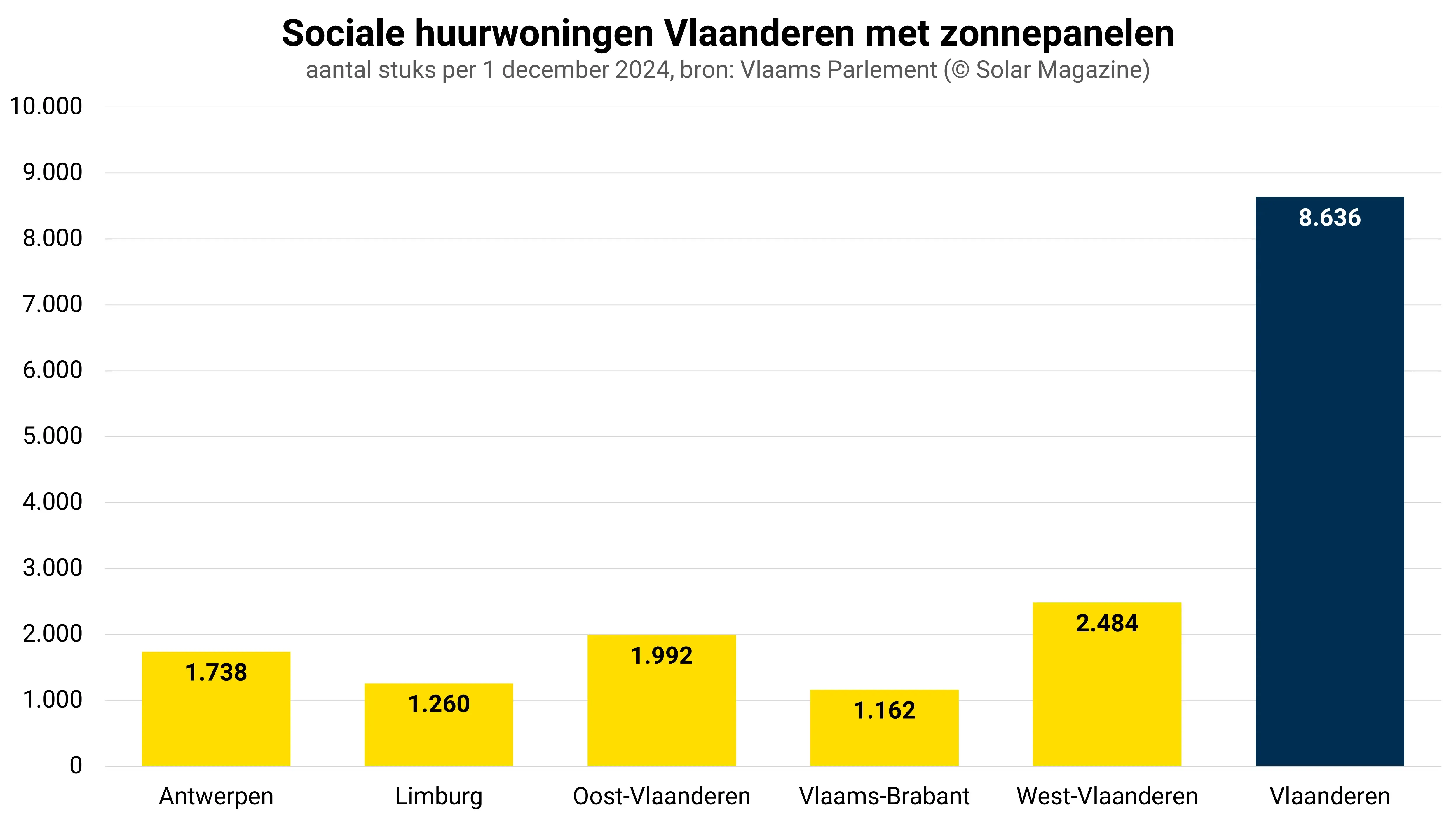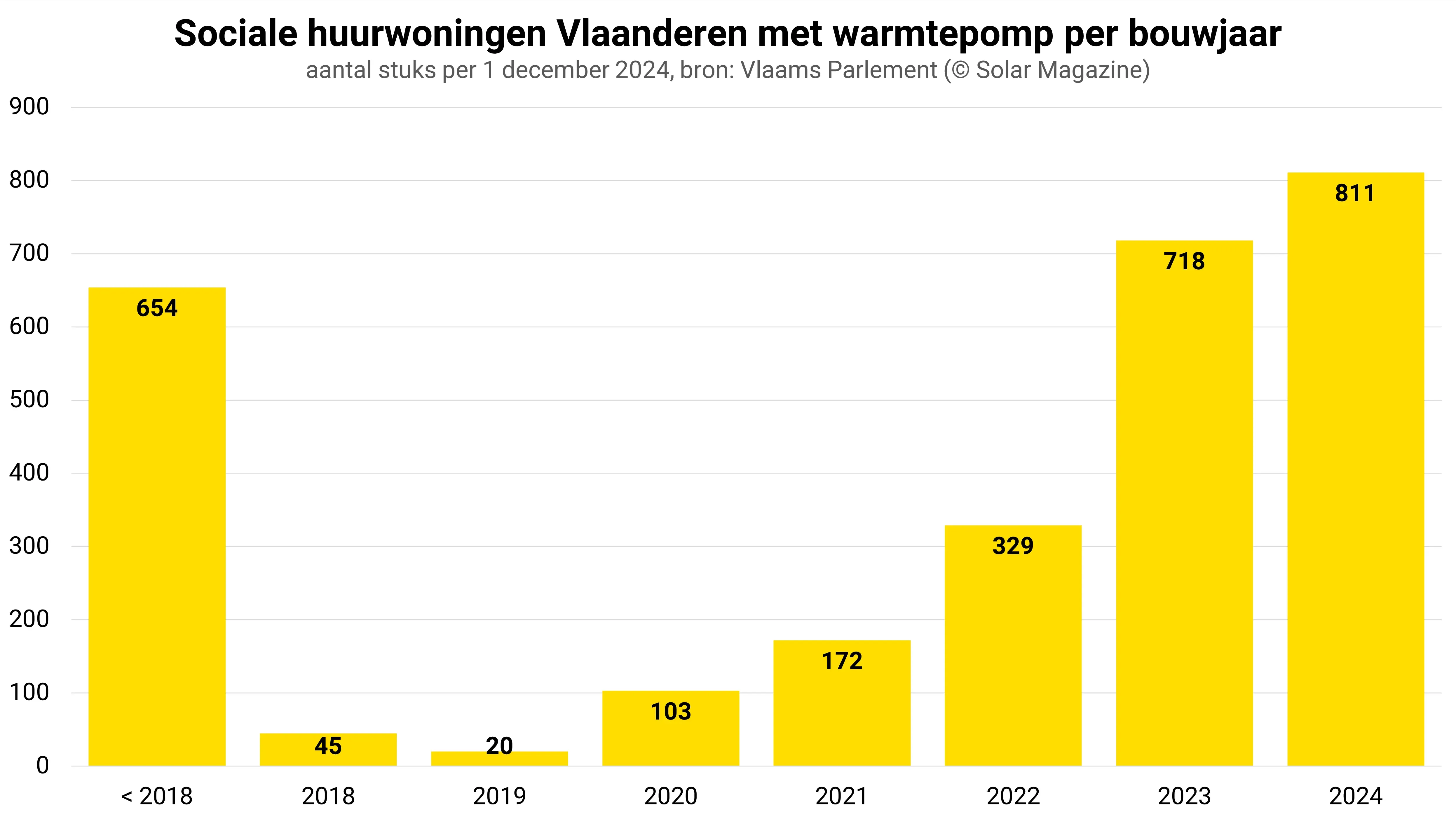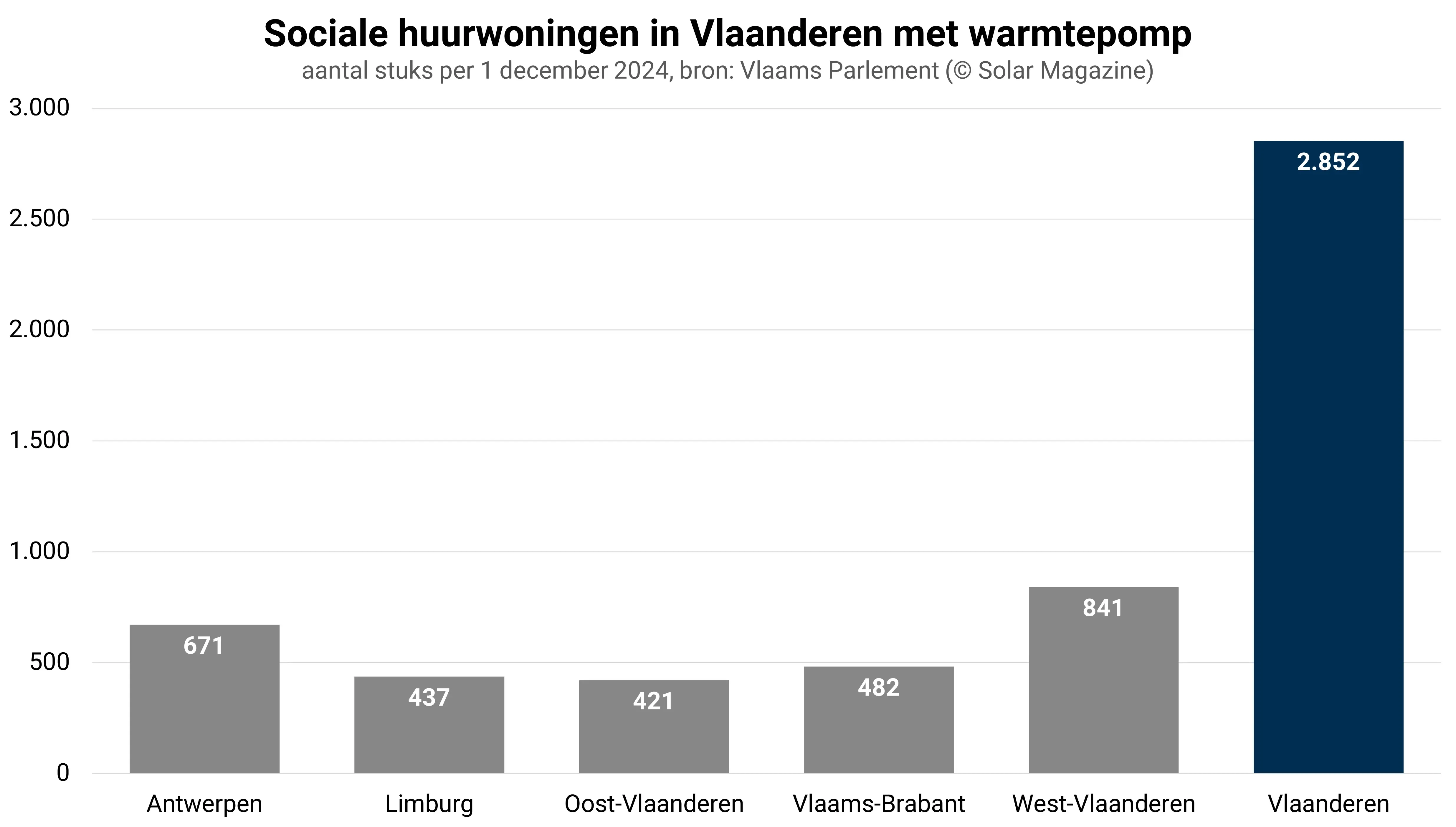 Minister Melissa Depraetere van Wonen & Energie en Klimaat heeft het Vlaams Parlement de nieuwste cijfers over de uitrol van warmtepompen, zonneboilers en zonnepanelen bij huisvestingsmaatschappijen (red. woningcorporaties) toegestuurd. Die tonen de stand van zaken per 1 december 2024. Het gaat daarbij wel om voorlopige cijfers die mogelijk later nog verhoogd zullen worden, omdat de huizen die in de tweede jaarhelft van zonnepanelen zijn voorzien nog niet volledig in de statistieken verwerkt zijn.