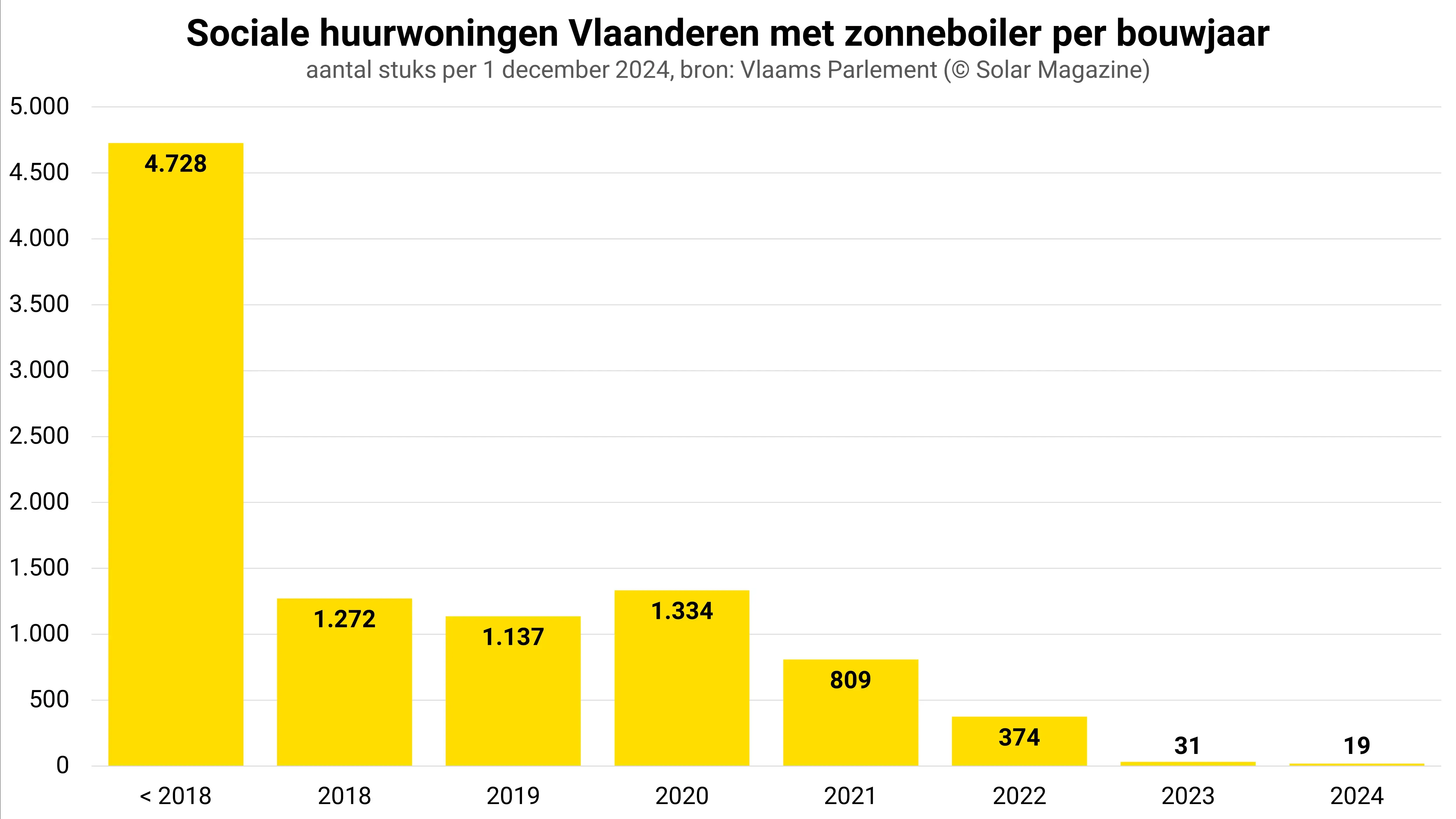 Afgelopen kalenderjaar werden volgens de voorlopige cijfers slechts 19 sociale nieuwbouwwoningen met een zonneboiler opgeleverd. Toch is het aantal woningen van de huisvestingsmaatschappijen dat een zonnewarmtesysteem heeft nog altijd groter dan dat met een zonnestroomsysteem. Bijna 6 procent van de woningen heeft namelijk zonnecollectoren.