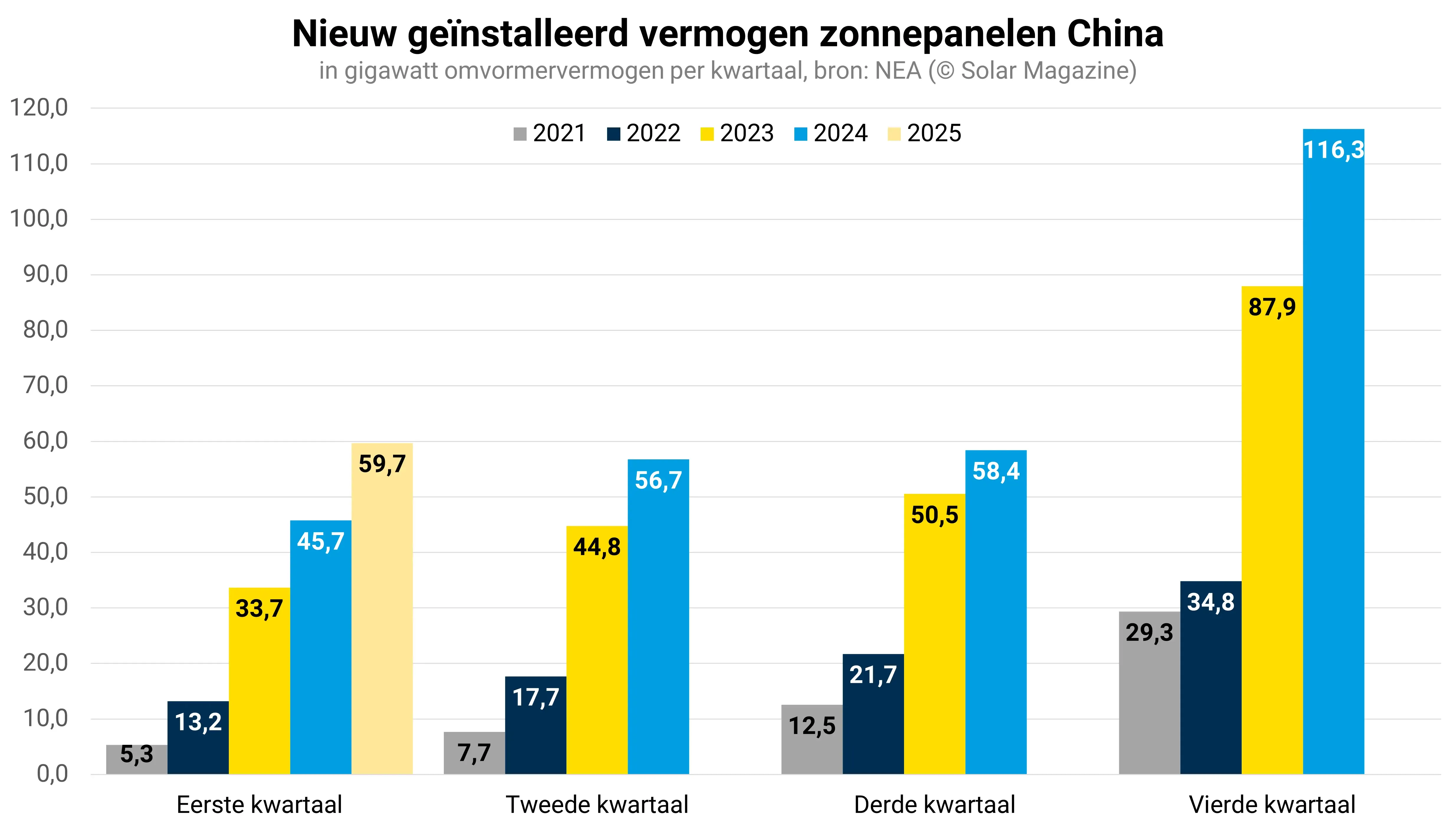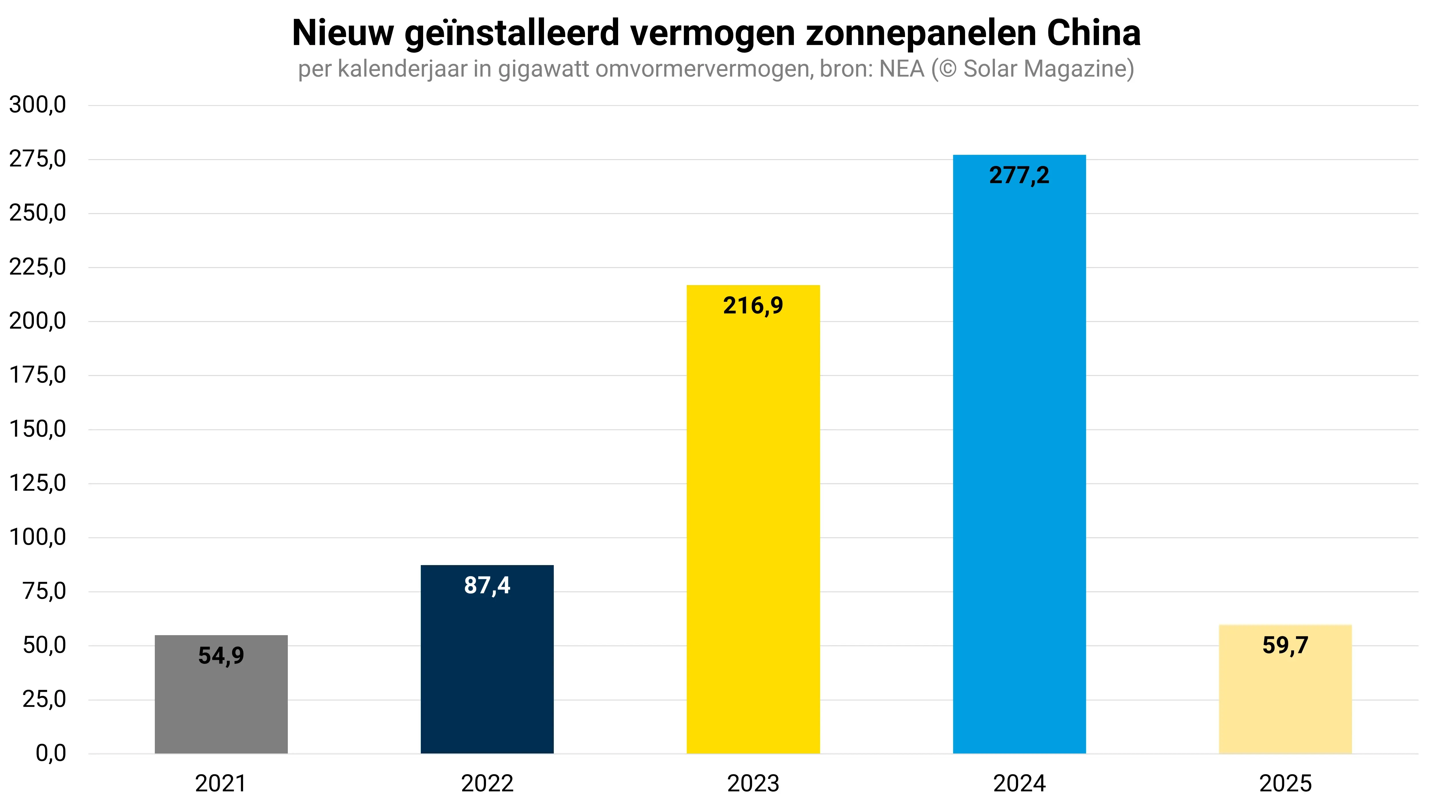 Ondanks de indrukwekkende groei van gemiddeld 20 gigawatt per maand in het eerste kwartaal, verwacht de Chinese brancheorganisatie CPIA dat de jaarlijkse groei dan ook zal vertragen. Voor het hele jaar 2025 wordt een totale installatie van 215 tot 255 gigawatt voorspeld, een daling na 6 opeenvolgende jaren van groei.