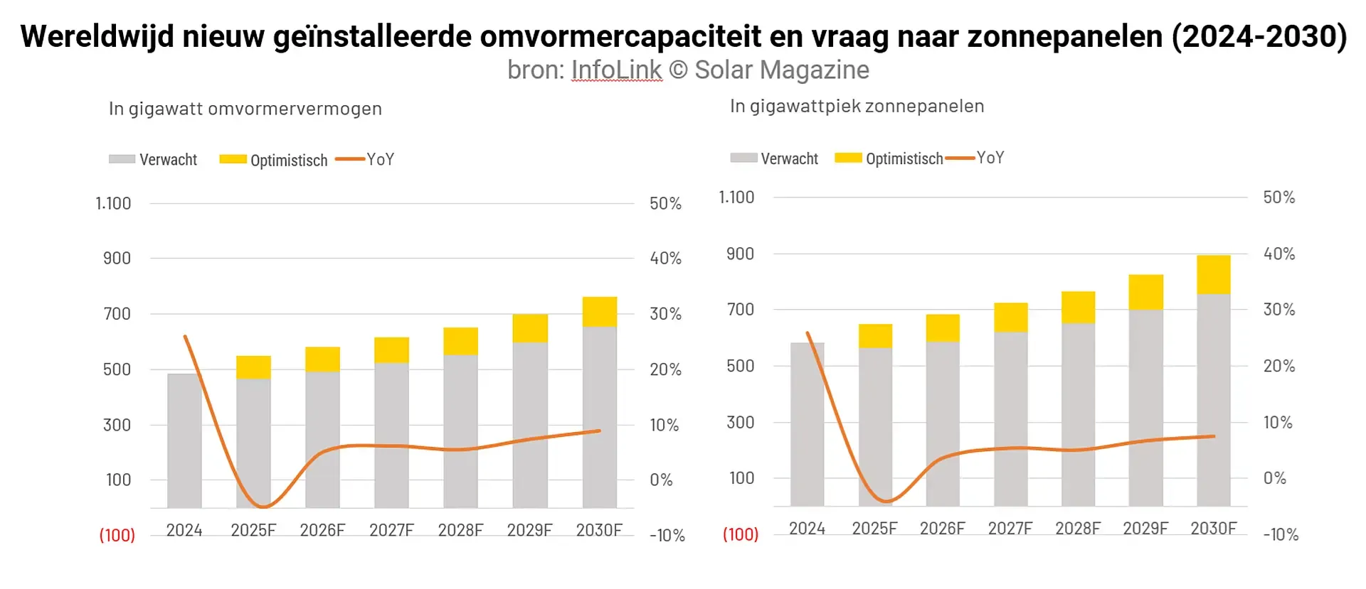 In een neutraal scenario kan de vraag volgens InfoLink met 3 procent dalen. In een optimistisch scenario kan de vraag met maximaal 11 procent groeien, met een gemiddelde groei van 4 procent. Tegen 2030 verwachten de analisten een marktomvang van 655 tot 763 gigawatt omvormervermogen en kan de vraag naar zonnepanelen stijgen tot 758 tot 895 gigawattpiek.