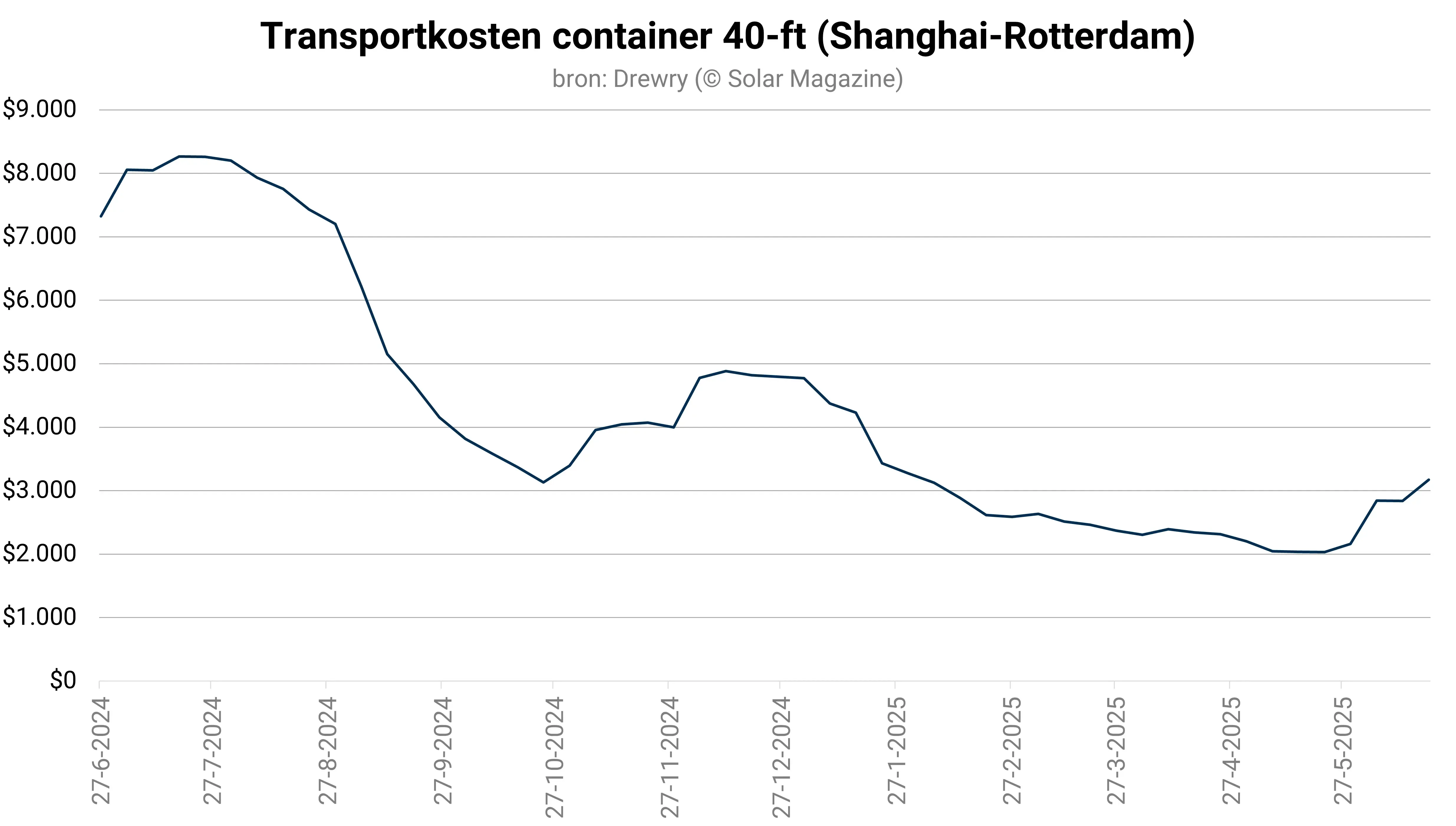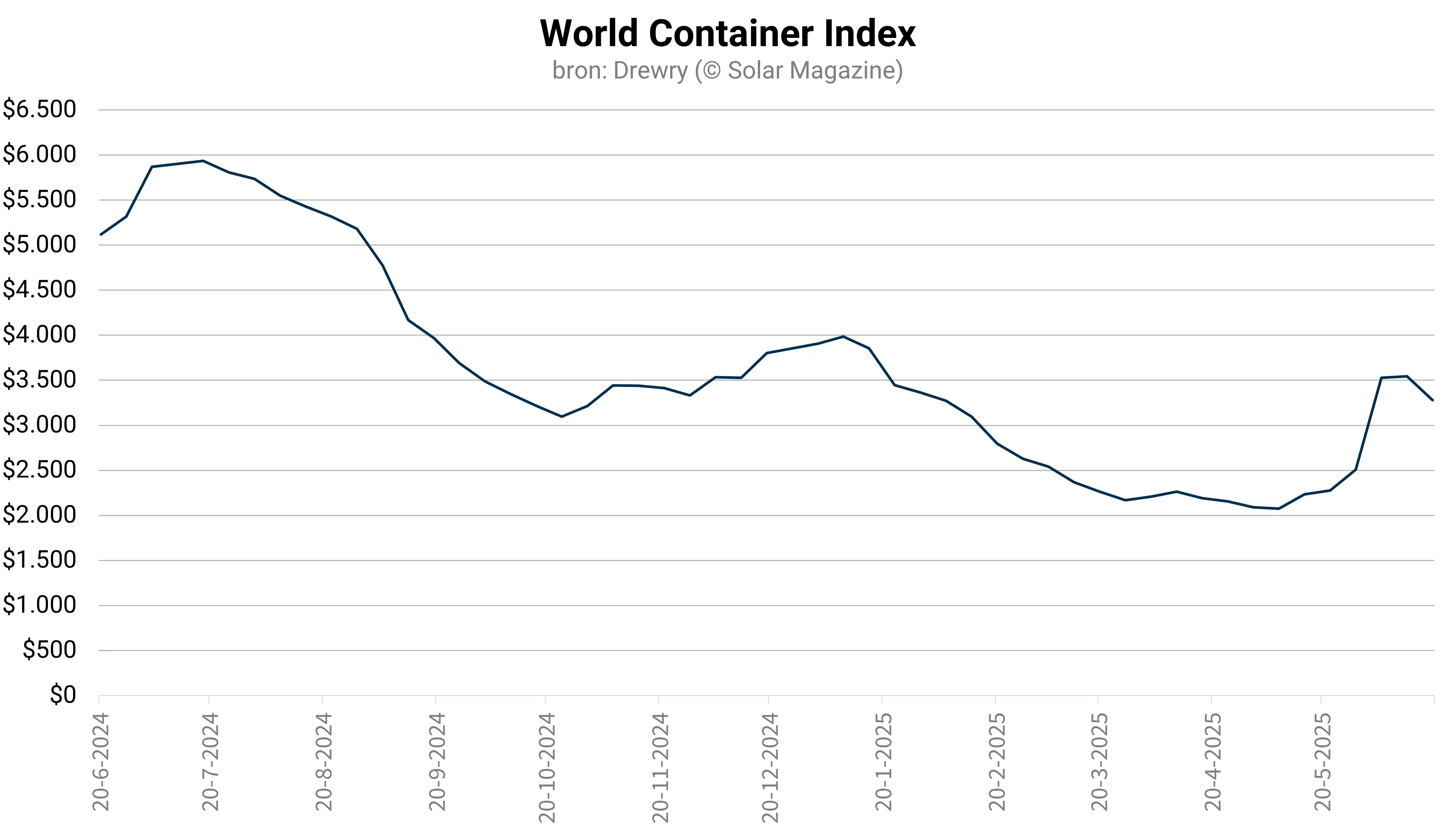 Terwijl de containervracht naar Rotterdam in prijs steeg, daalde Drewry’s World Container Index (WCI) – die de 8 belangrijkste vaarroutes ter wereld weerspiegelt – namelijk met 7 procent naar 3.279 Amerikaanse dollar per container van 40 voet. Deze daling volgt na 6 weken van stijgingen en wordt voornamelijk veroorzaakt door een afnemende vraag naar transport richting de Verenigde Staten.