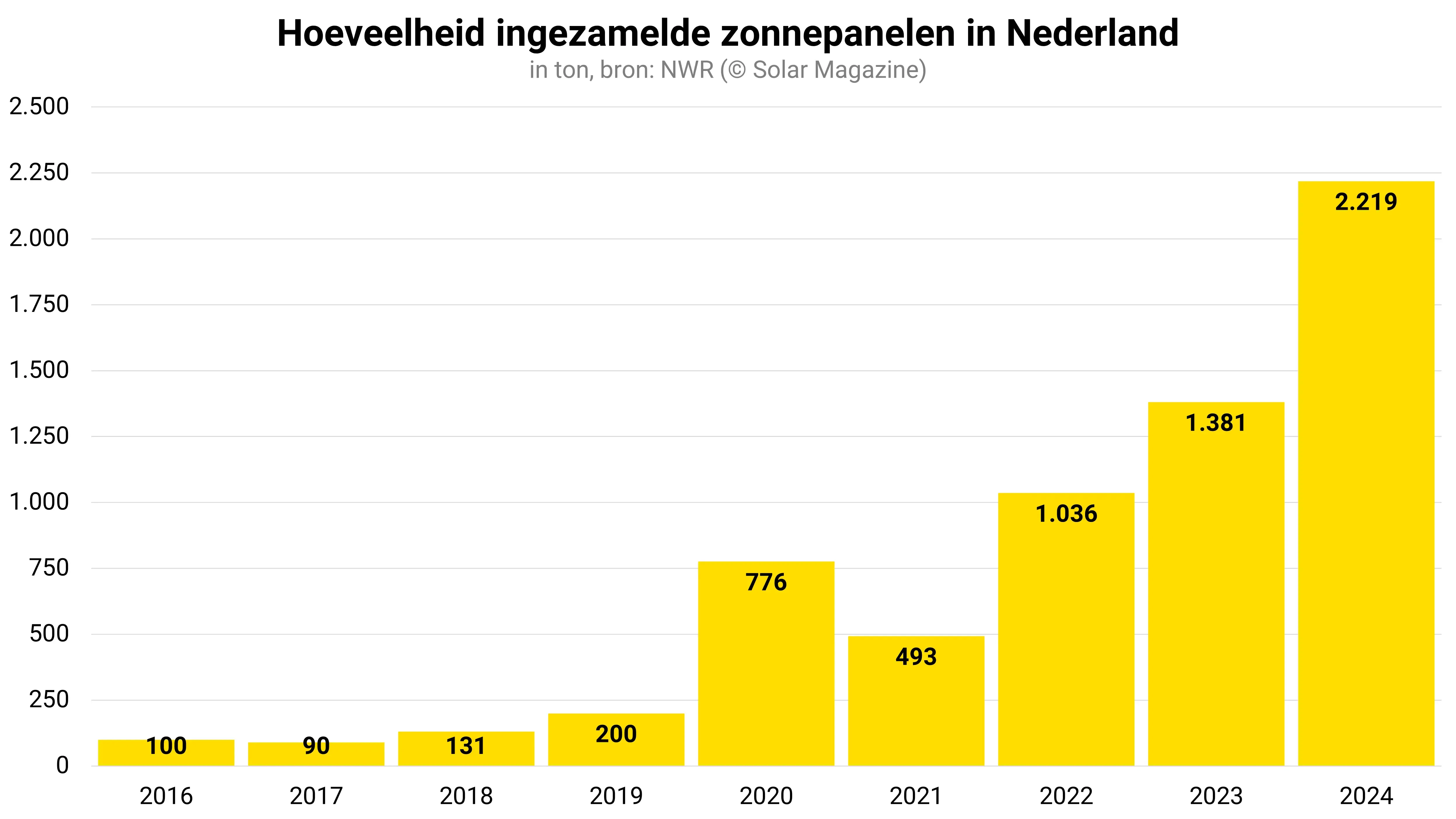 De Stichting OPEN meldde vorige maand al dat de hoeveelheid ingezamelde en afgedankte zonnepanelen met 66 procent was gegroeid tot 2.220 ton. Het NWR meldt nu dat het voor de totale markt om de inzameling van 2.219 ton zonnepanelen gaat.