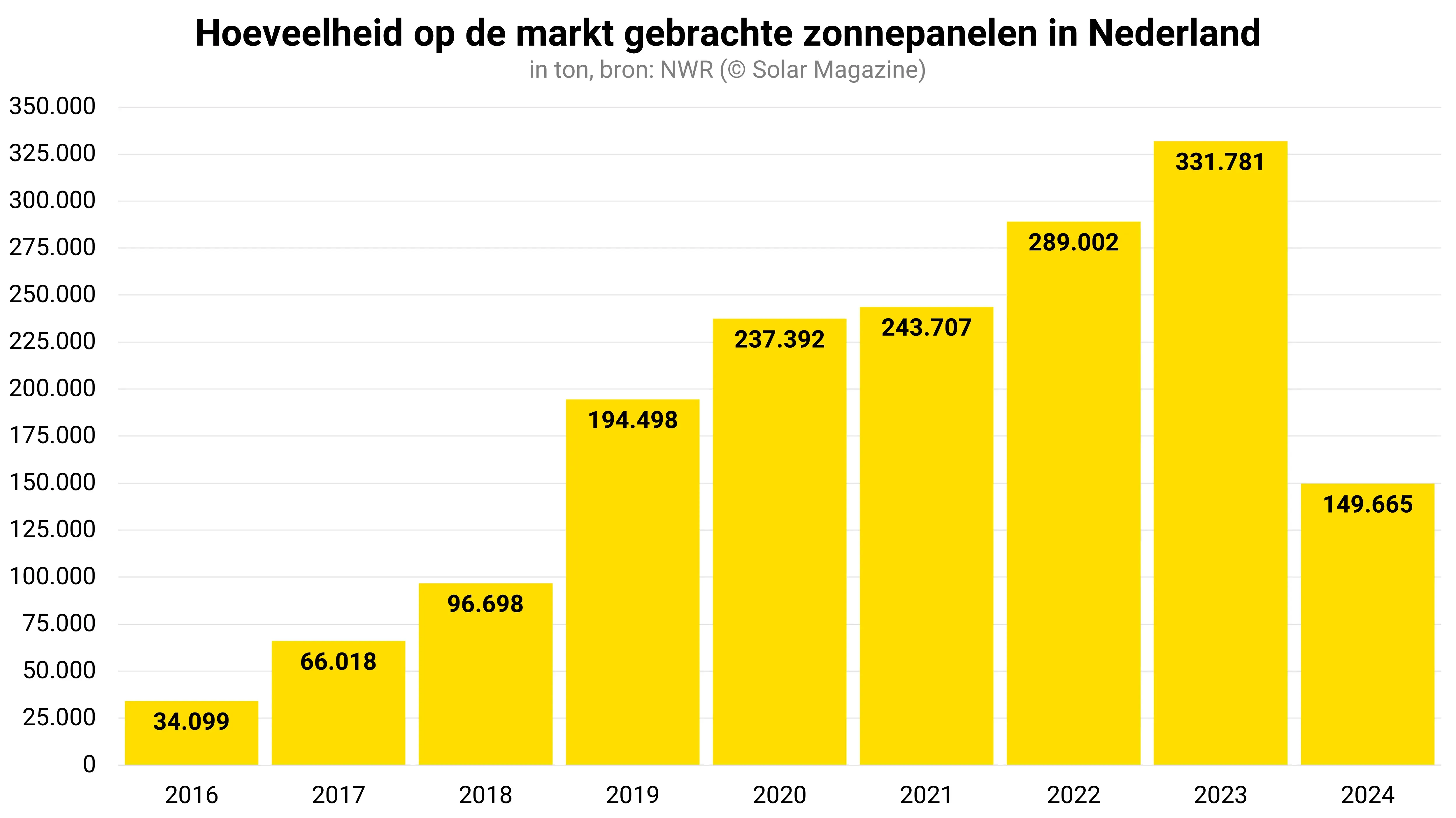 Waar in 2023 nog een recordhoeveelheid van 319.660 ton aan nieuwe zonnepanelen op de markt werd gebracht, is dat in 2024 met 55 procent gedaald tot 149.665 ton.