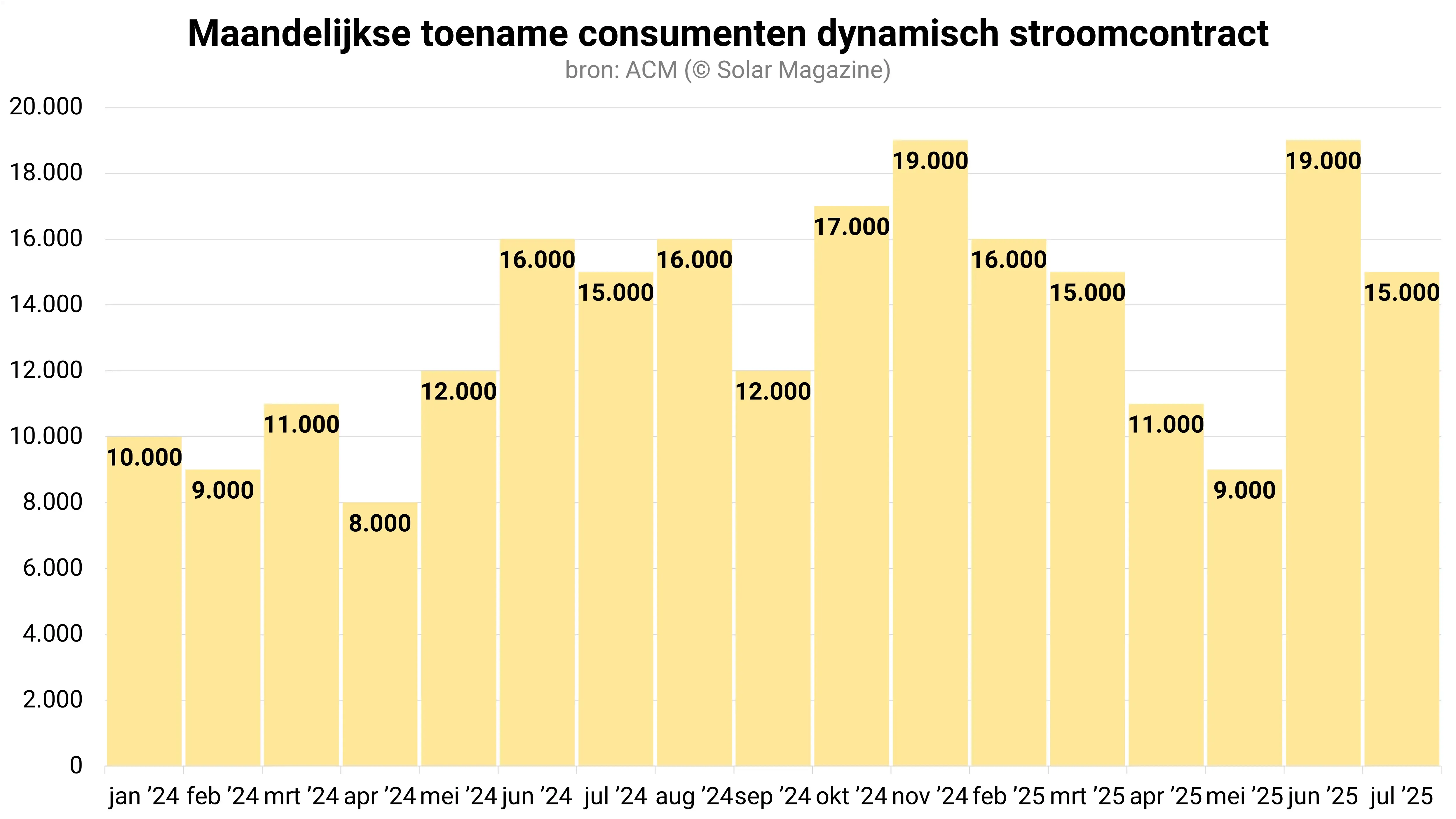 Waar de maandelijkse groei van het aantal dynamische stroomcontracten in 2024 op 12.583 stuks lag, ligt dat dit kalenderjaar op een niveau van 14.250 nieuwe dynamische stroomcontracten per maand oftewel zo’n 13 procent hoger.