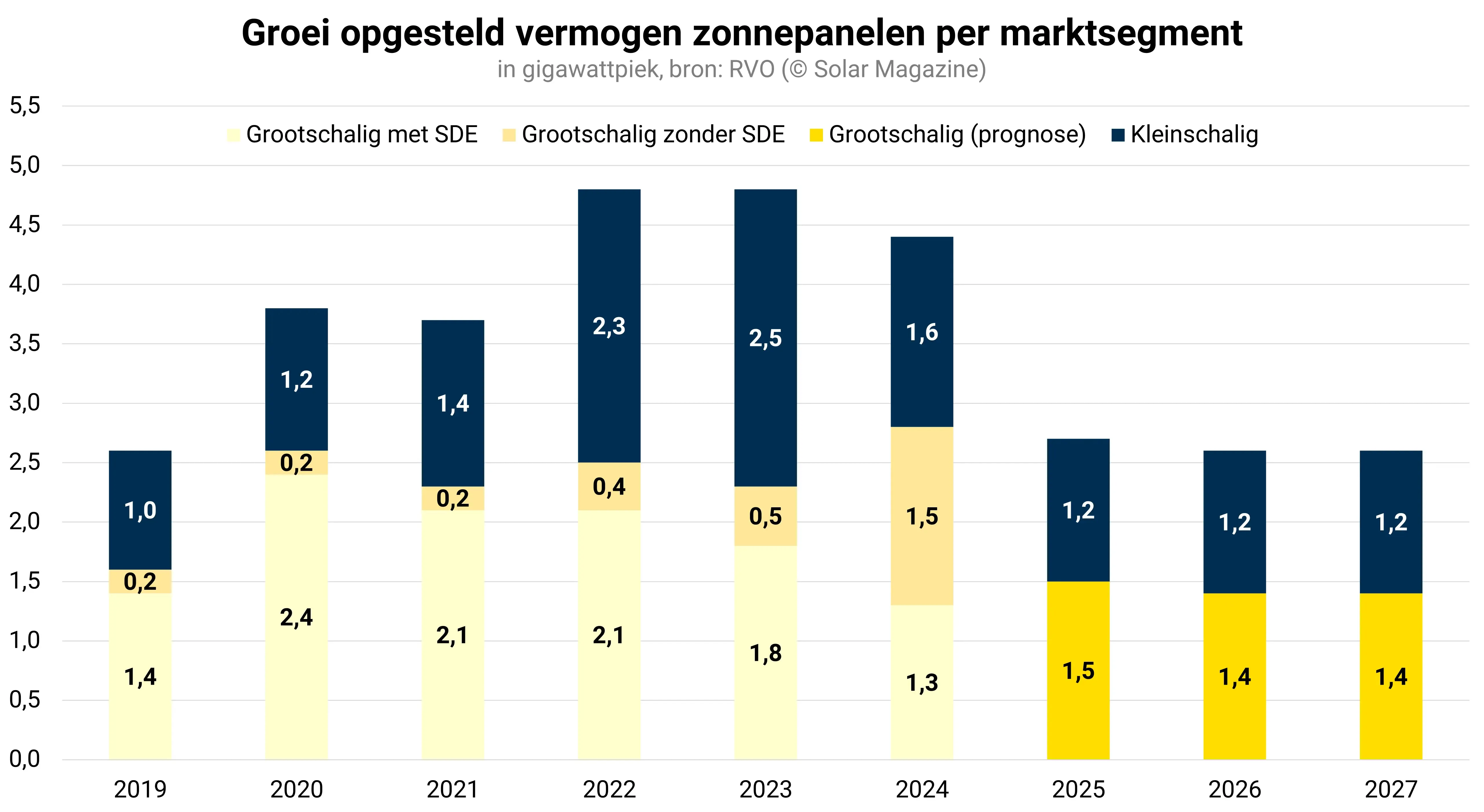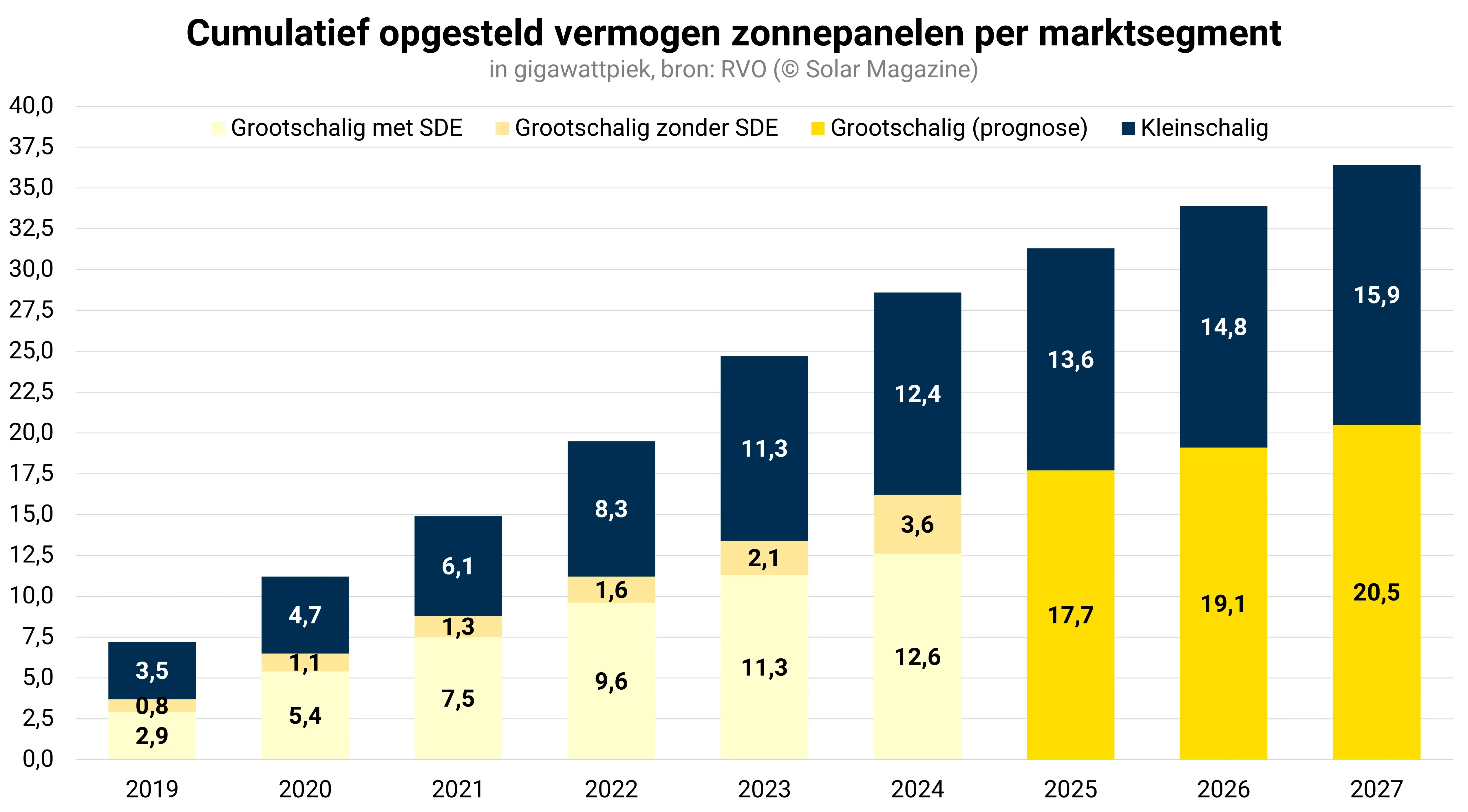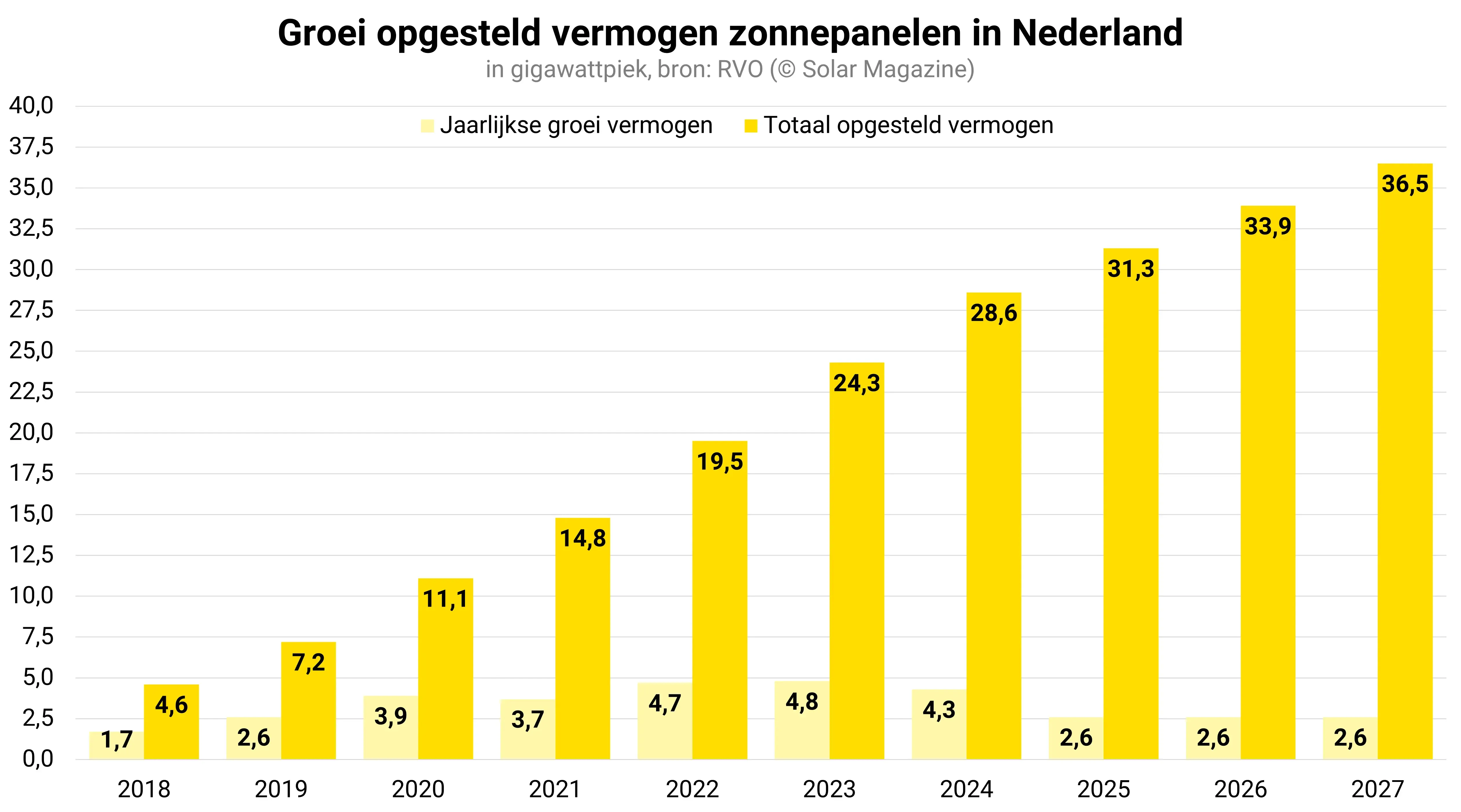 Voor de periode 2025-2027 verwacht de RVO een verdere afname naar gemiddeld 2,6 gigawattpiek nieuw geïnstalleerd pv-vermogen per jaar. Hiermee zou het totale opgestelde vermogen in 2027 uitkomen op ongeveer 36,5 gigawattpiek.