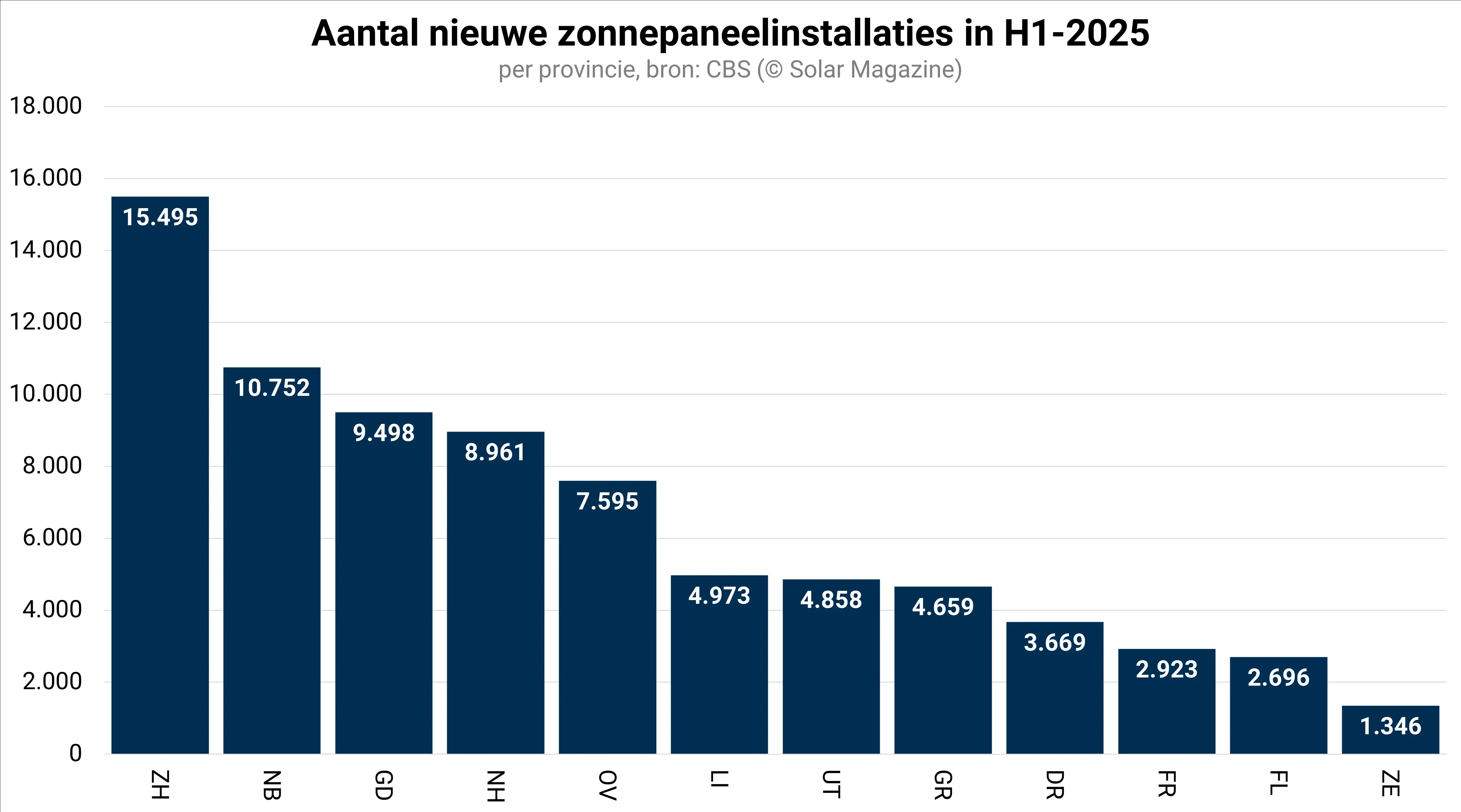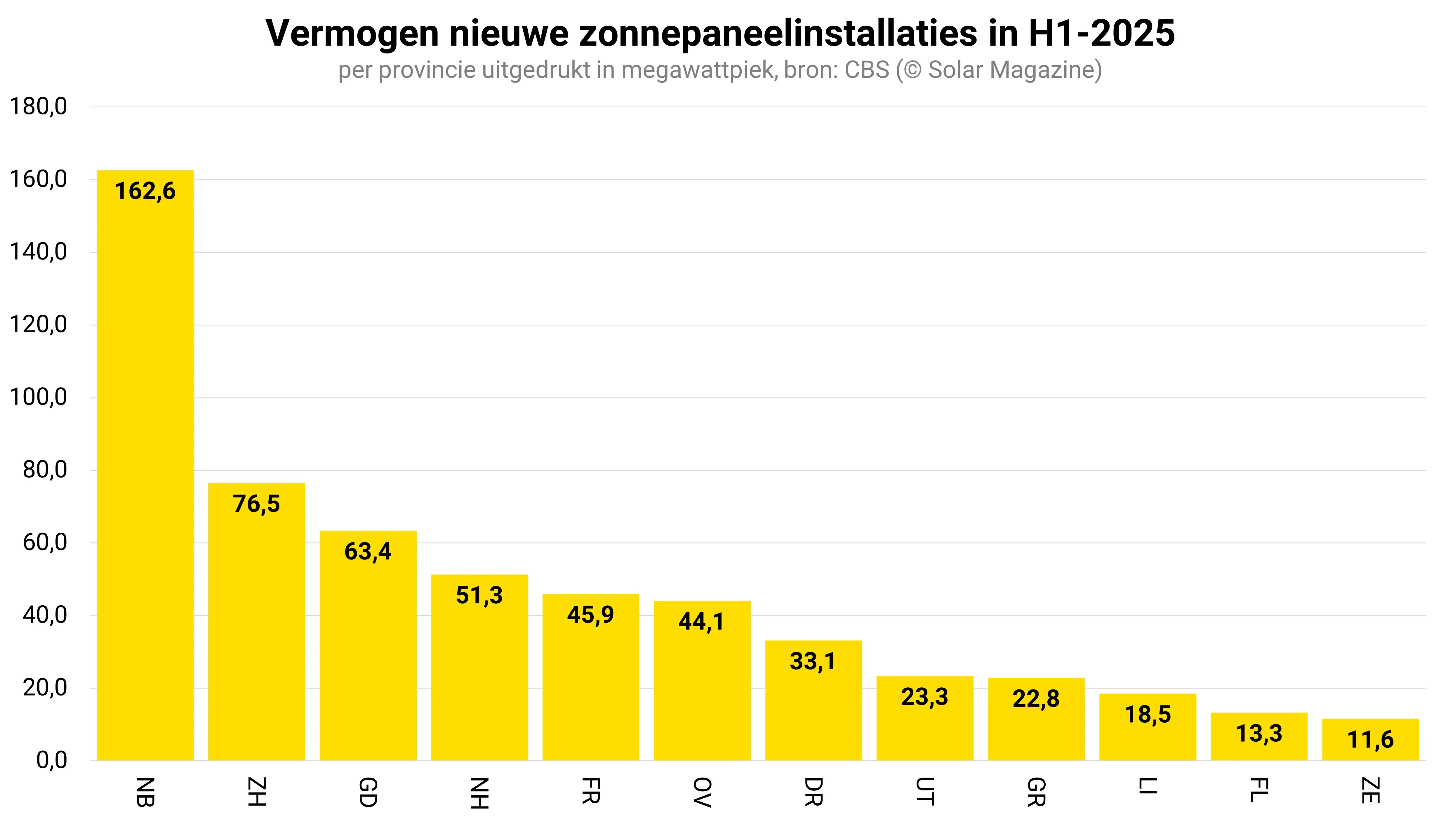 Noord-Brabant is de koploper qua nieuw geïnstalleerd zonnepaneelvermogen en Zuid-Holland voert de ranglijst aan qua aantal nieuwe zonnepaneelinstallaties. Noord-Brabant is in die lijst op de tweede plaats terug te vinden. Zuid-Holland heeft echter een ruime voorsprong en plaatste in de eerste helft van het kalenderjaar ruim 15.000 nieuwe pv-installaties. Zeeland is de rode- lantaarndrager.