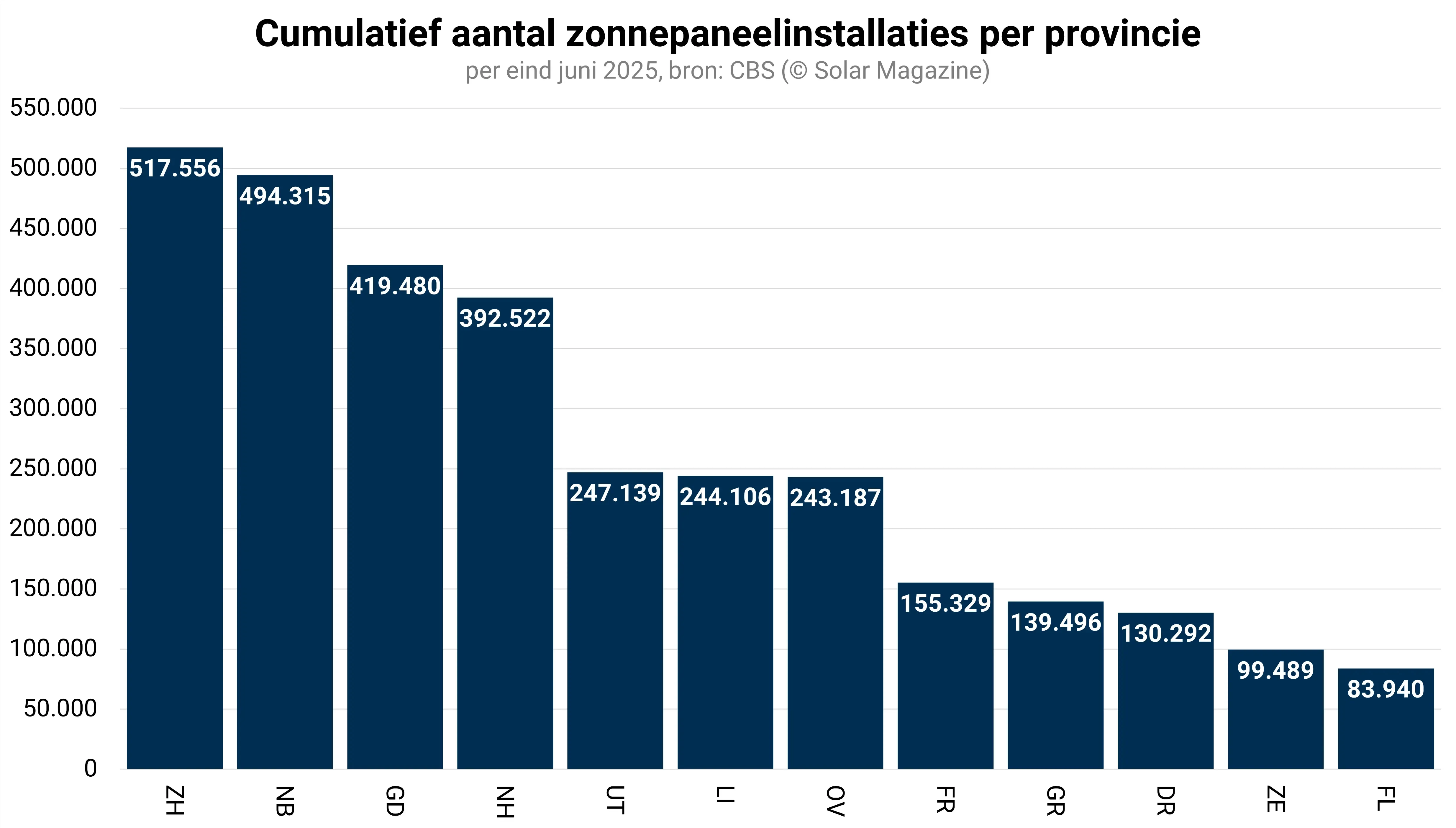Zuid-Holland is nog altijd de koploper qua cumulatief aantal zonnepaneelinstallaties en blijkt, door de correctie van de eerdere cijfers van het CBS, de enige provincie te zijn die de grens van een half miljoen zonnepaneelinstallaties is gepasseerd. Verder is er nu niet 1 maar zijn er 2 provincies die minder dan 100.000 zonnepaneelinstallaties hebben: Zeeland én Flevoland.