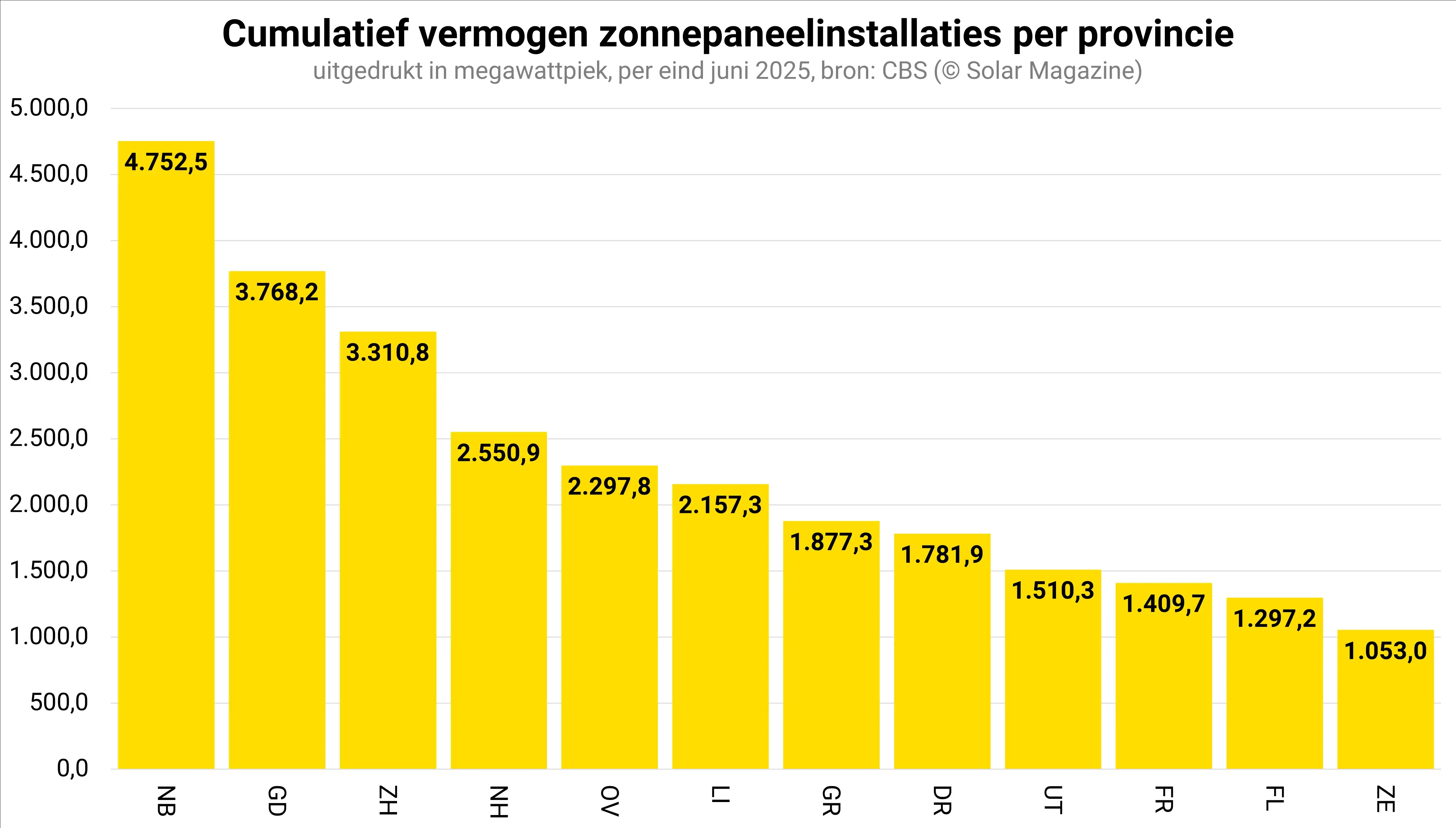 Noord-Brabant is tot slot nog altijd de enige provincie die de grens van 4 gigawattpiek opgesteld vermogen is gepasseerd en de grens van 5 gigawattpiek komt langzamerhand in zicht. Gelderland is de runner-up en Zuid-Holland completeert de top 3. Rodelantaarndrager Zeeland is inmiddels ook de grens van 1 gigawattpiek zonnepanelen gepasseerd.