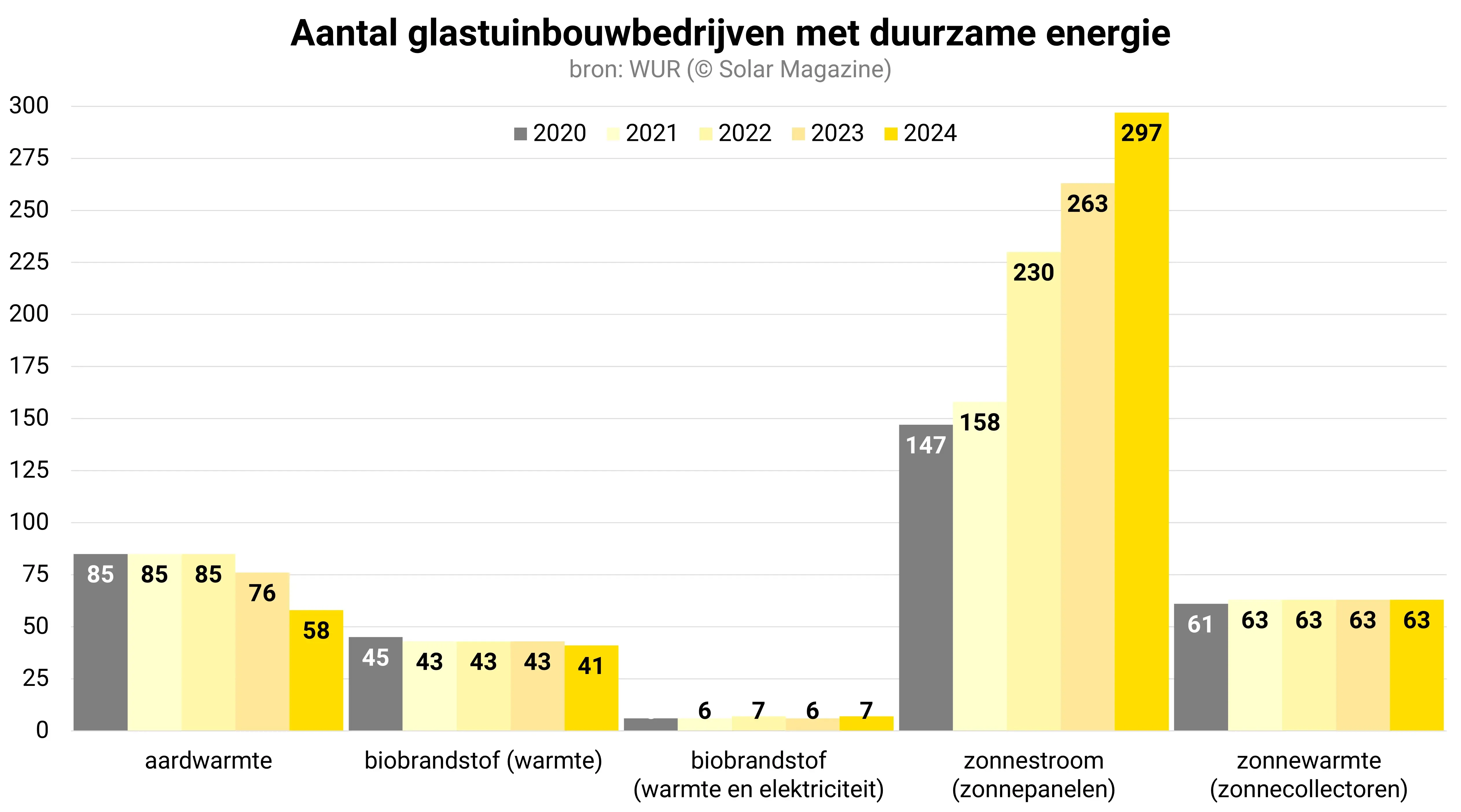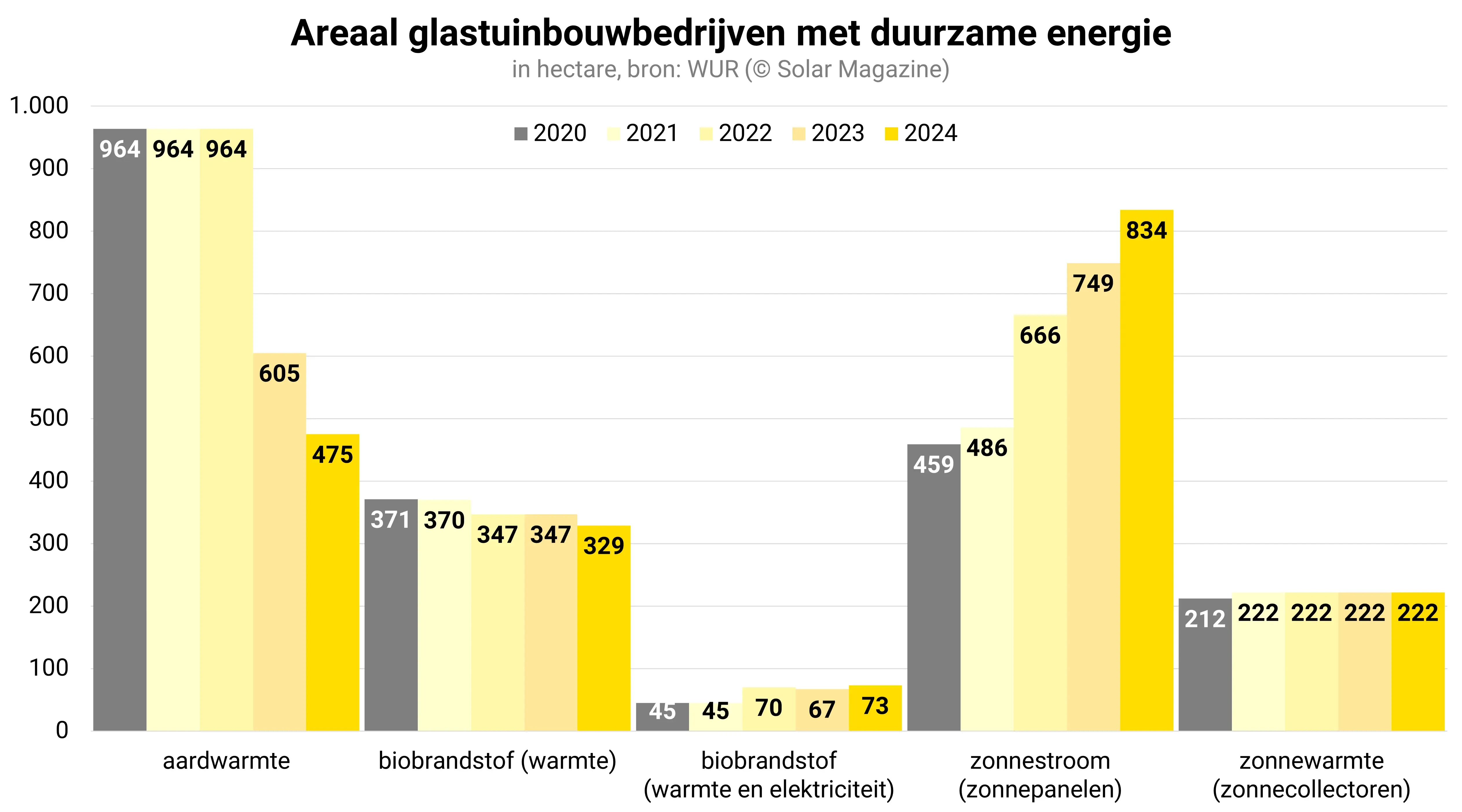 Door de groei van zonne-energie is aardwarmte sinds enkele jaren niet langer de belangrijkste duurzame energiebron voor de glastuinbouwsector. In 2024 maakten 58 bedrijven gebruik van aardwarmte, die samen 475 hectare aan kassen exploiteren tegenover 297 bedrijven met zonnepanelen die samen 834 hectare kassen exploiteren.