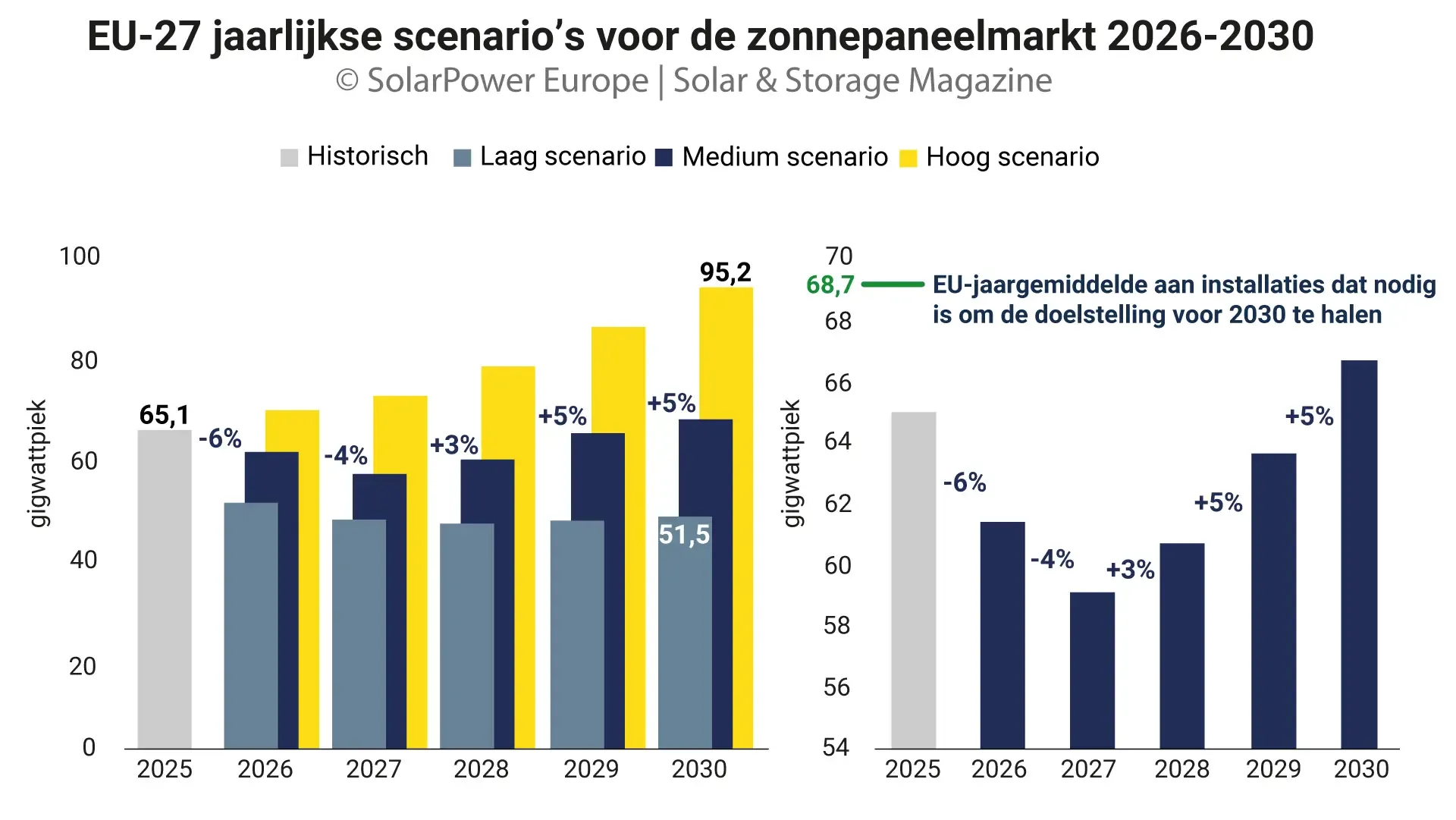 De vertraging zal zich volgens de onderzoekers de komende jaren voortzetten. SolarPower Europe verwacht voor 2026 en 2027 verdere dalingen van de zonnepaneelverkopen, met een verwacht herstel vanaf 2028 en 2029. Pas in 2030 keert de EU terug naar het installatieniveau van 2025 met ongeveer 67 gigawattpiek aan jaarlijkse toevoegingen. In het meest waarschijnlijke scenario – het mediumscenario – bereikt de EU een geïnstalleerd vermogen van 718 gigawattpiek in 2030, waarmee de doelstelling van 750 gigawattpiek met ruim 30 gigawattpiek wordt gemist.