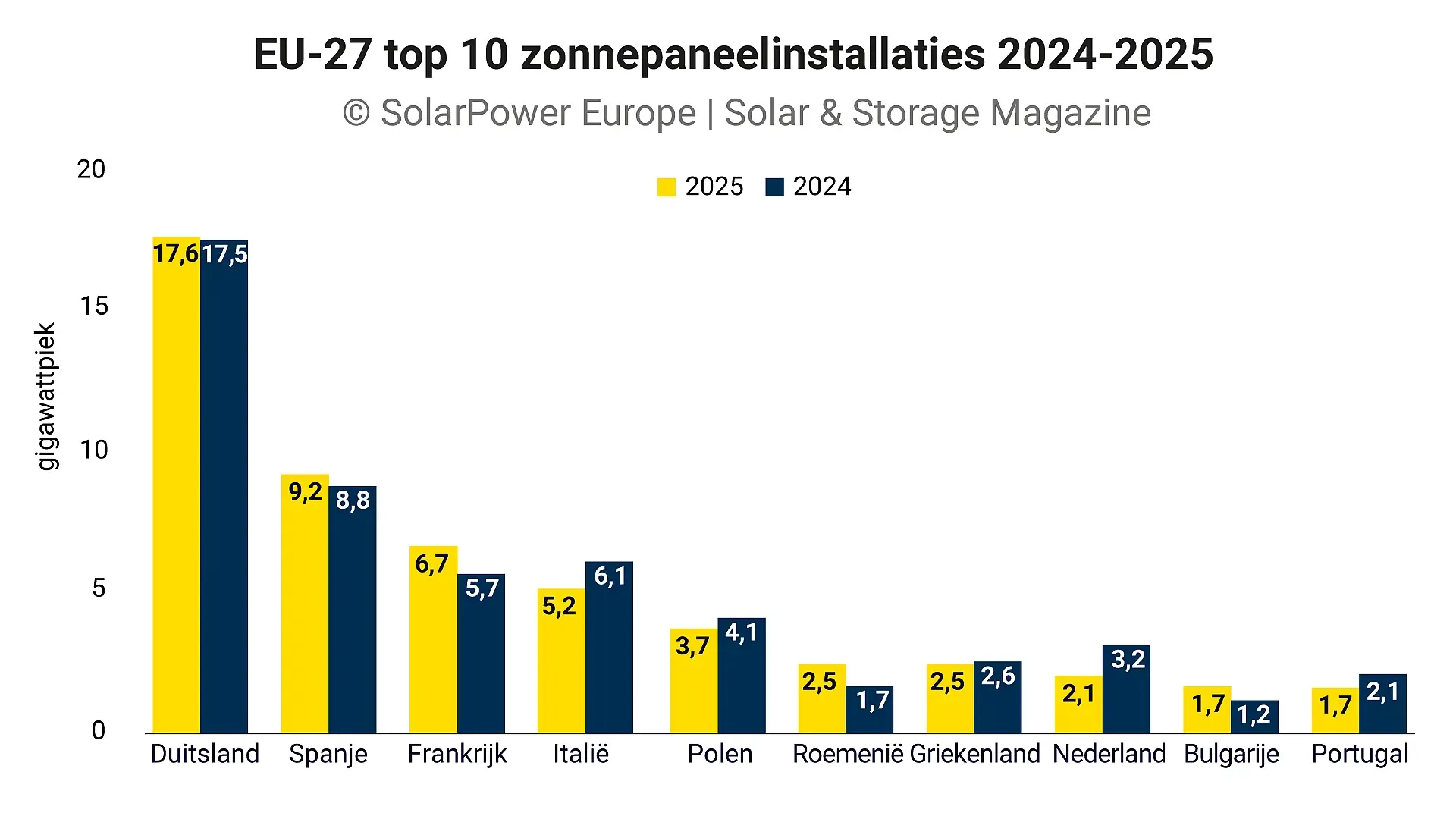 De Europese consumentenmarkt voor zonnepanelen is sterk gekrompen. Waren huishoudens in 2023 nog goed voor 28 procent van de geïnstalleerde capaciteit in de EU, in 2025 is dat gedaald naar slechts 14 procent. In 2024 zagen 17 markten de residentiële verkopen dalen, in 2025 steeg dit aantal naar 19 landen. Dit staat in schril contrast met 2023, toen slechts 6 consumentenmarkten een daling kenden.