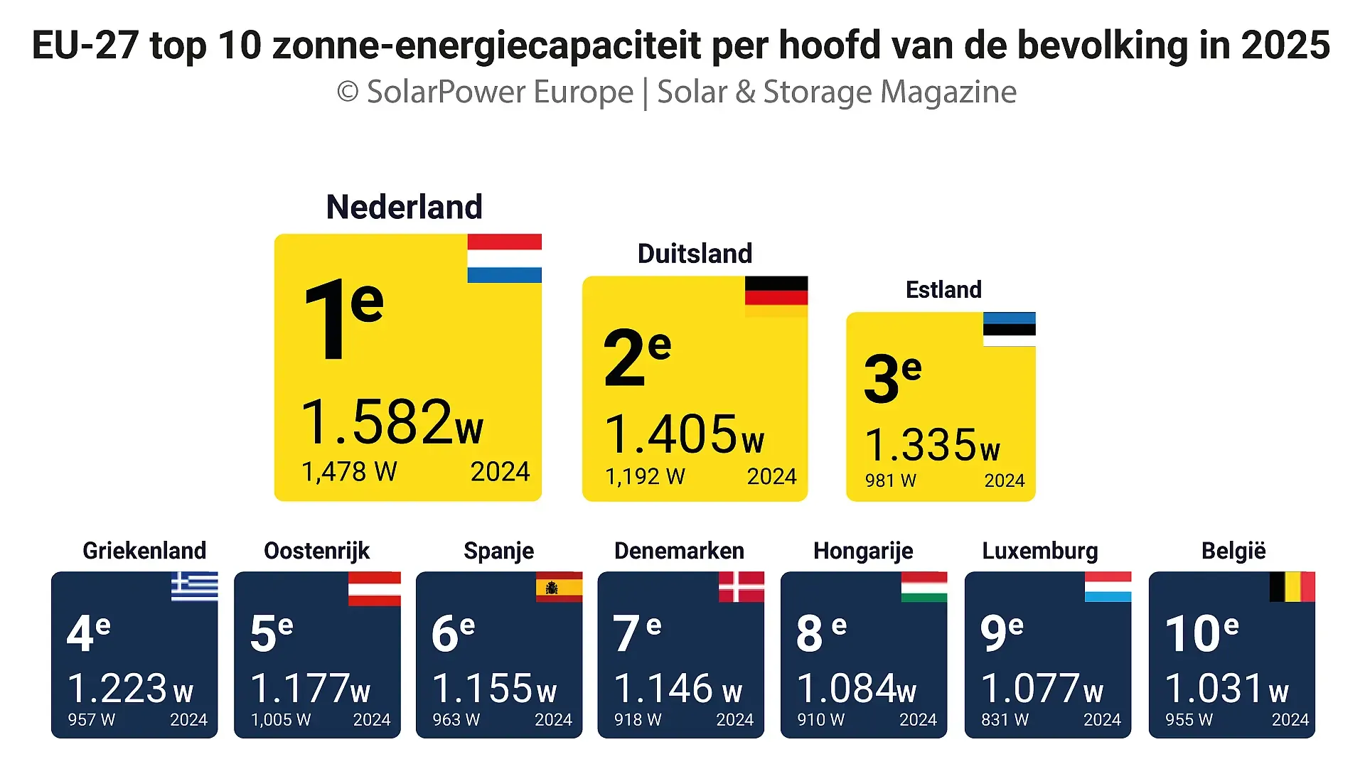 Nederland blijft koploper met een zonnepaneelvermogen van 1,6 kilowattpiek per inwoner, gevolgd door Duitsland met 1,4 kilowattpiek per inwoner.