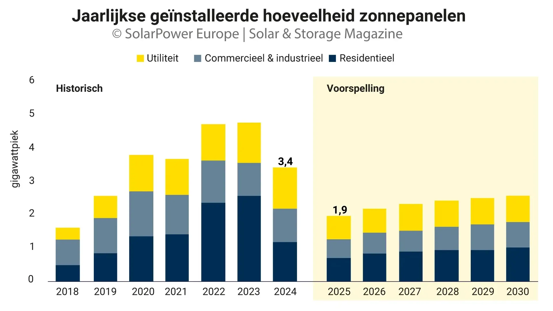 Ondanks de gekrompen markt haalt Nederland eind 2025 volgens Holland Solar wel de mijlpaal van 30 gigawattpiek geïnstalleerd vermogen. De markt stabiliseert zich volgens de brancheverenigingen in de periode tot 2030 naar een niveau van 2 à 3 gigawattpiek per jaar.