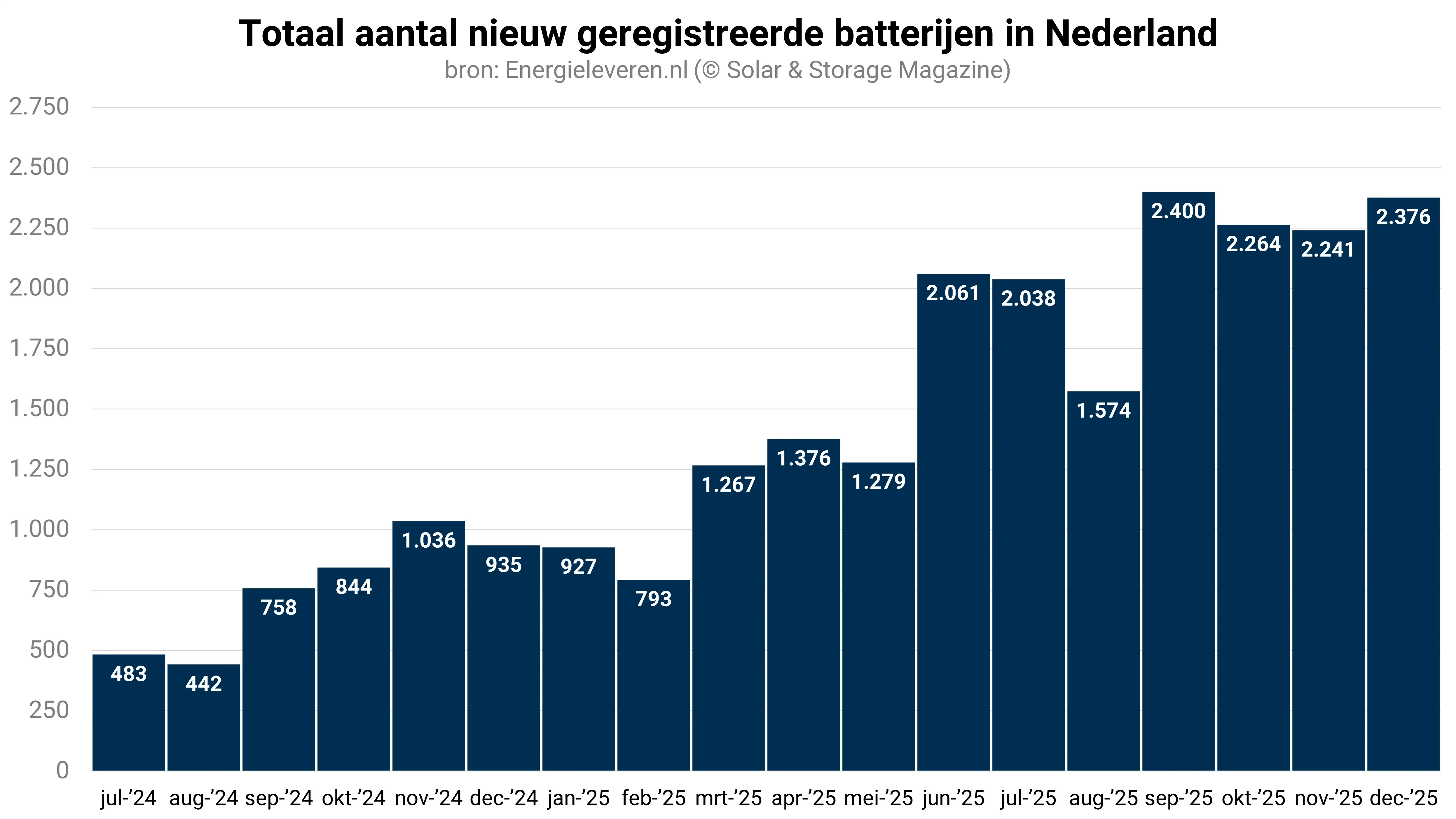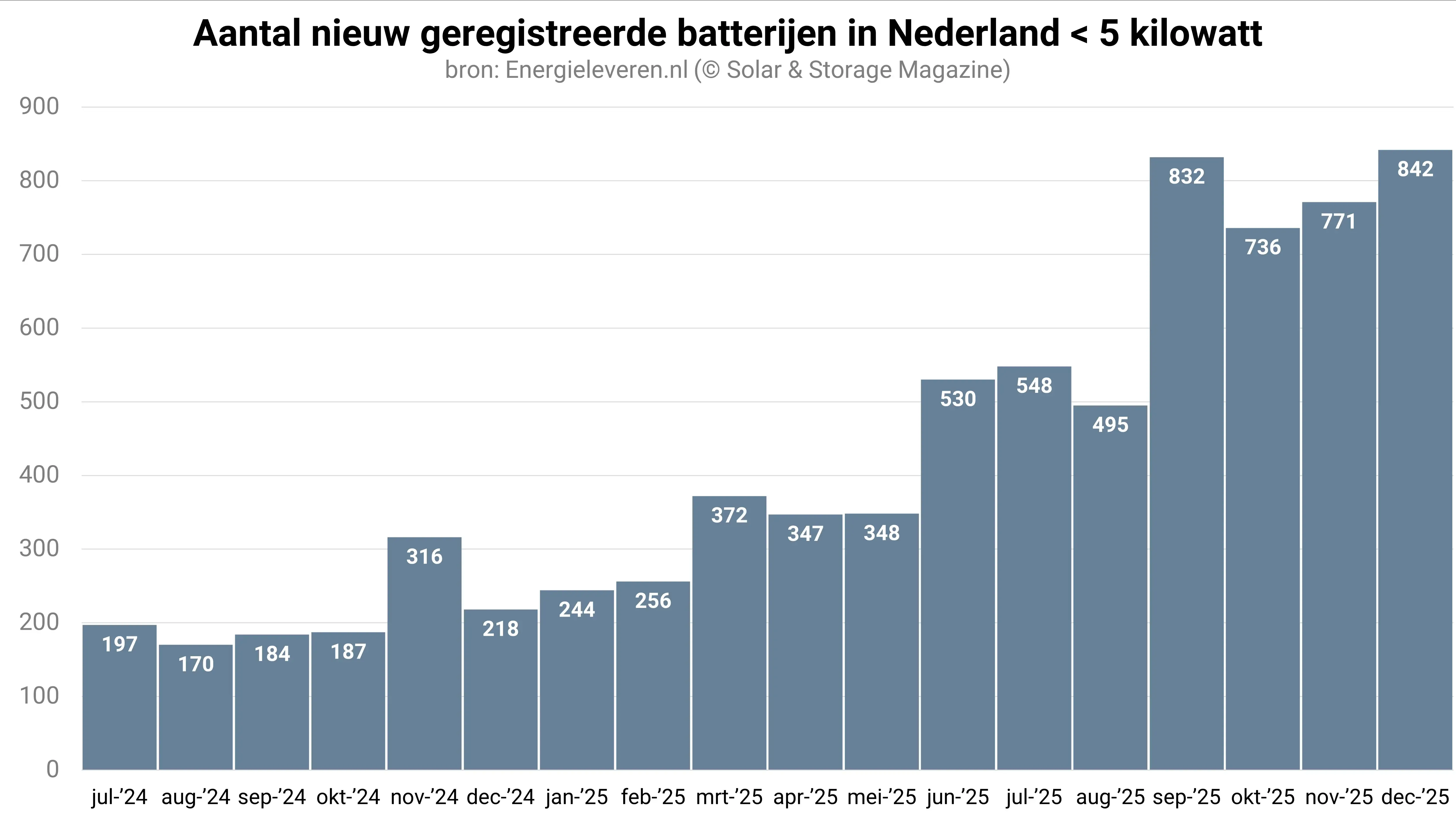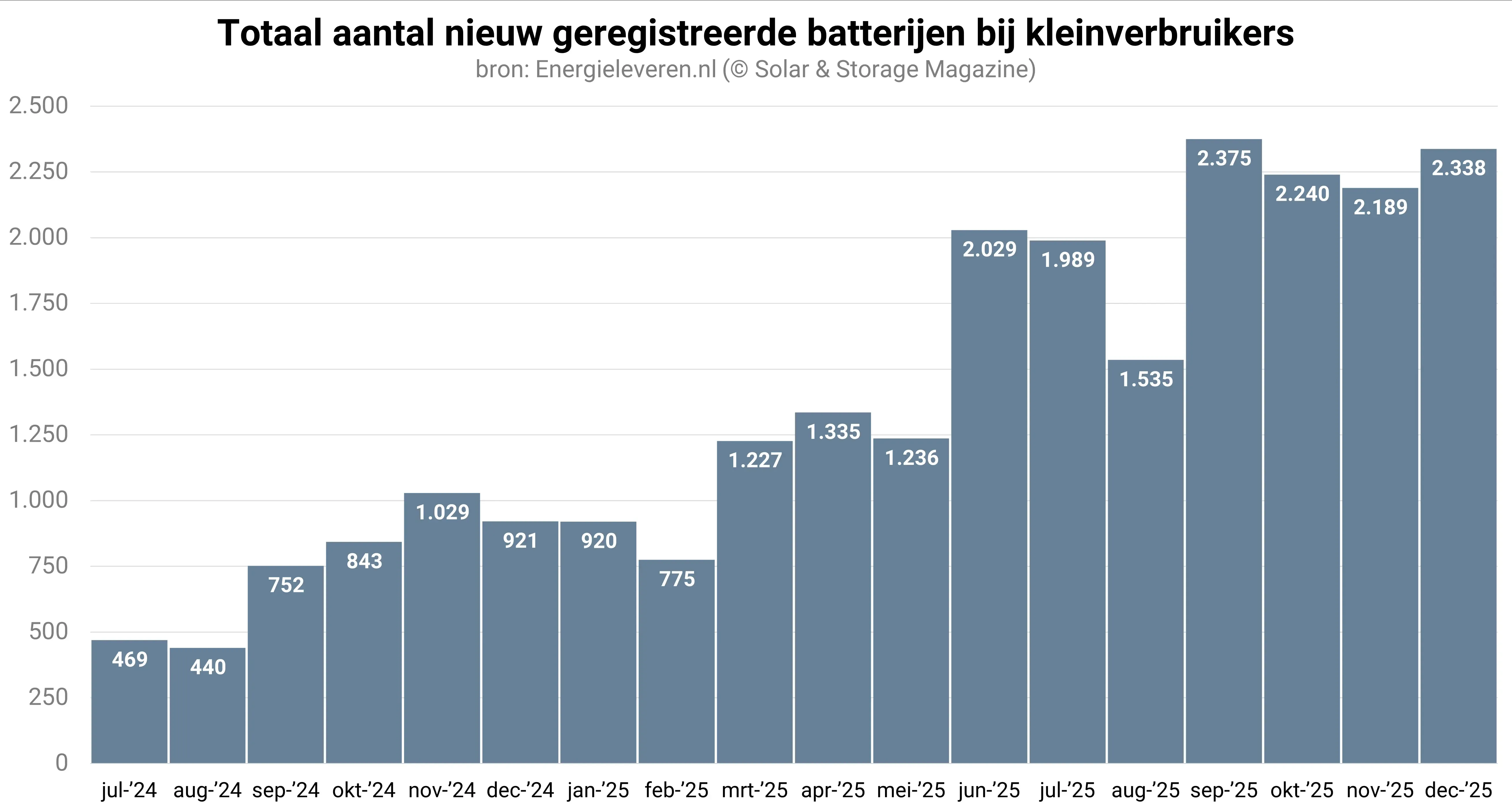 Belangrijk om in ogenschouw te nemen bij de registratiecijfers van de netbeheerders, is dus dat deze een onderschatting van de werkelijke hoeveelheid geïnstalleerde batterijen zijn. Uit de cijfers blijkt dat de netbeheerders sinds de maand juni gemiddeld zo’n 2.100 batterijen per maand registreren. In de eerste helft van 2025 waren dat nog geen 1.300 batterijen per maand. In de maand december groeide het aantal nieuw geregistreerde batterijen daarbij tot net geen 2.400 stuks.