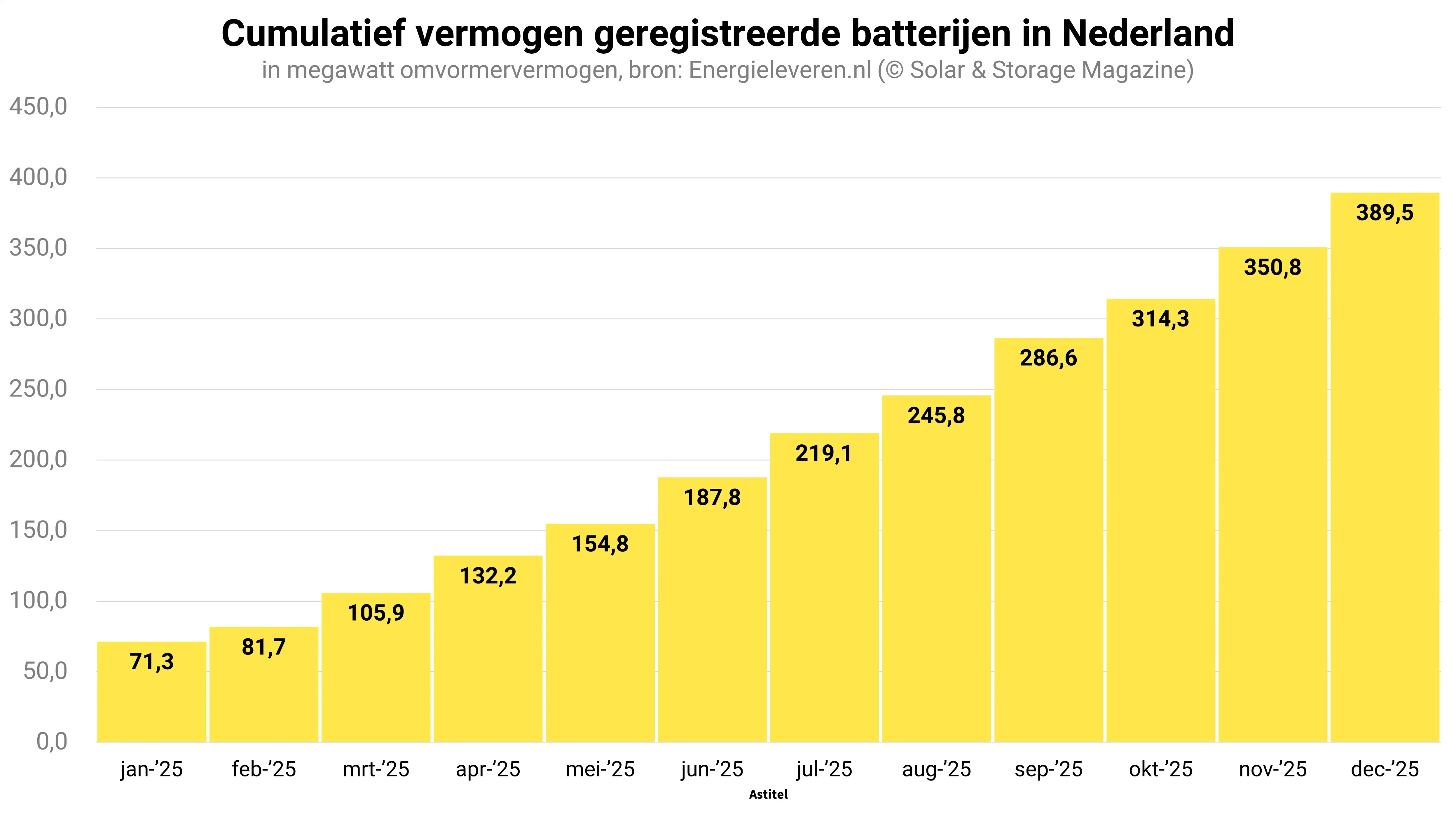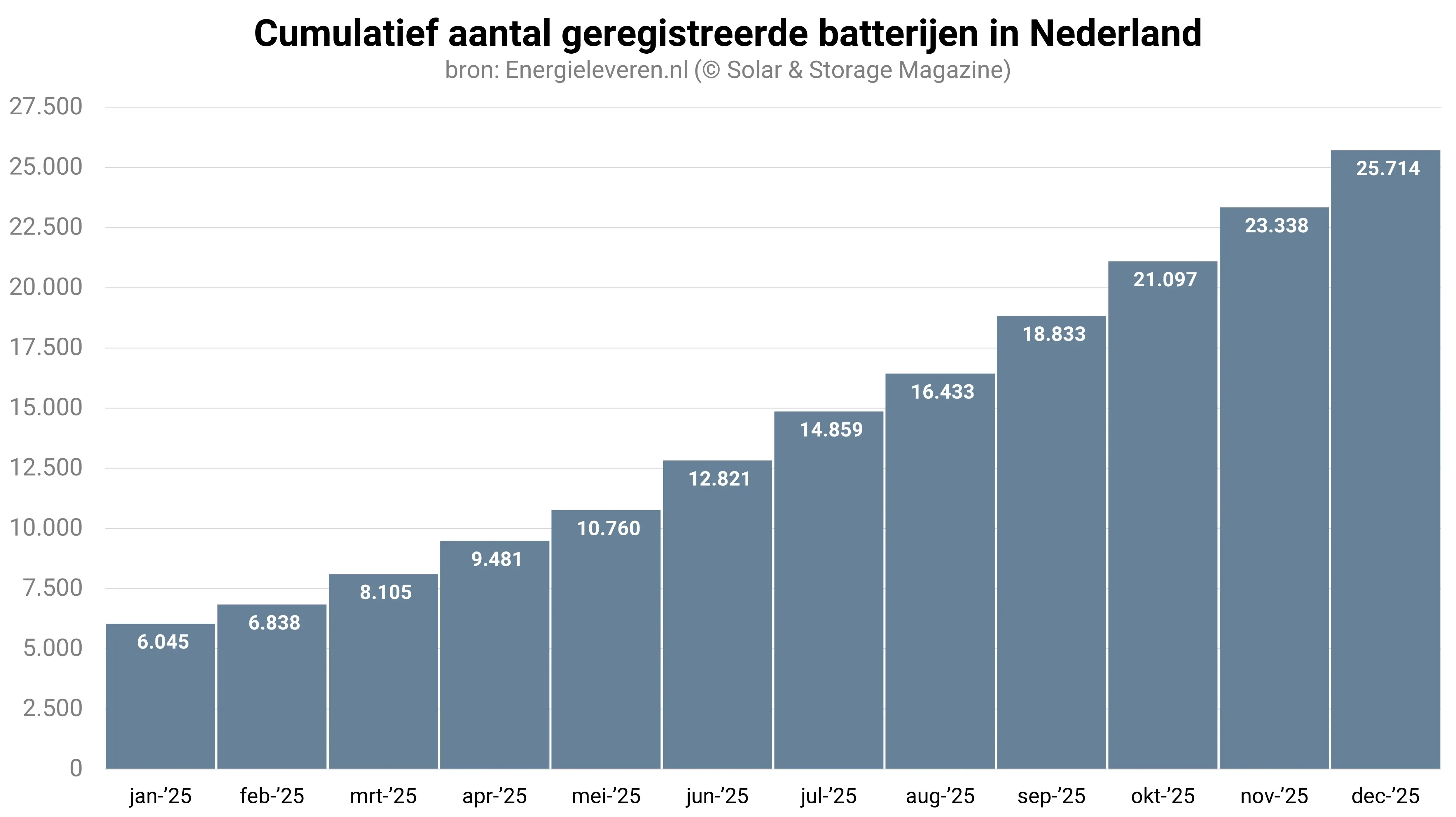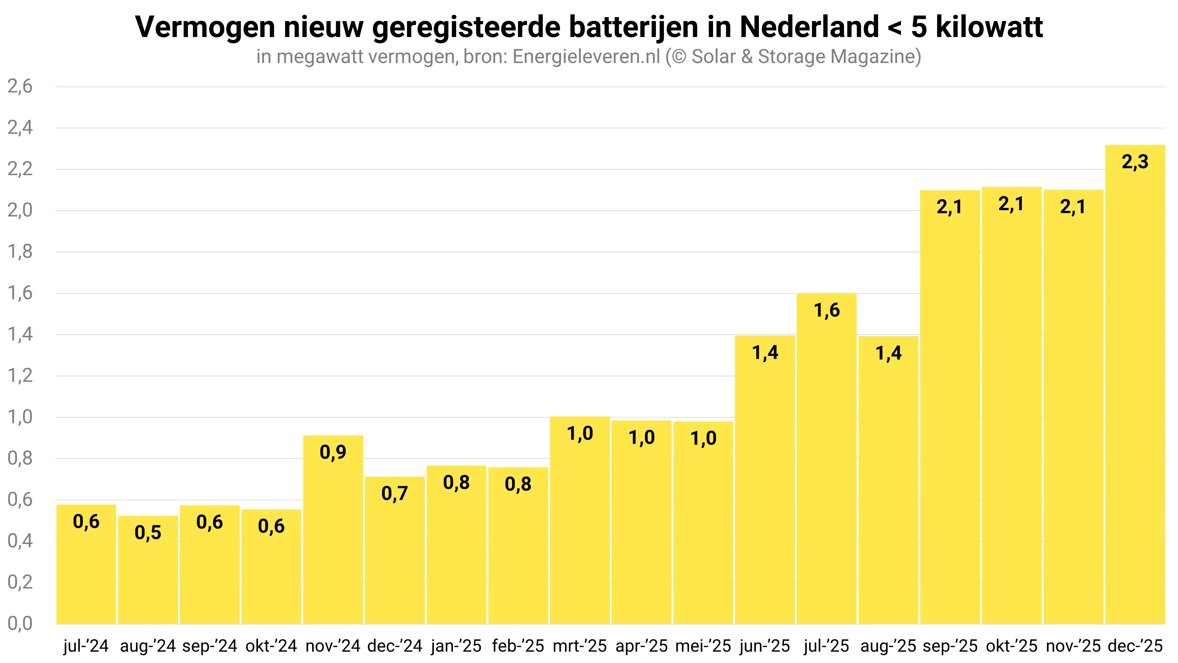 Belangrijk om in ogenschouw te nemen bij de registratiecijfers van de netbeheerders, is dus dat deze een onderschatting van de werkelijke hoeveelheid geïnstalleerde batterijen zijn. Uit de cijfers blijkt dat de netbeheerders sinds de maand juni gemiddeld zo’n 2.100 batterijen per maand registreren. In de eerste helft van 2025 waren dat nog geen 1.300 batterijen per maand. In de maand december groeide het aantal nieuw geregistreerde batterijen daarbij tot net geen 2.400 stuks.