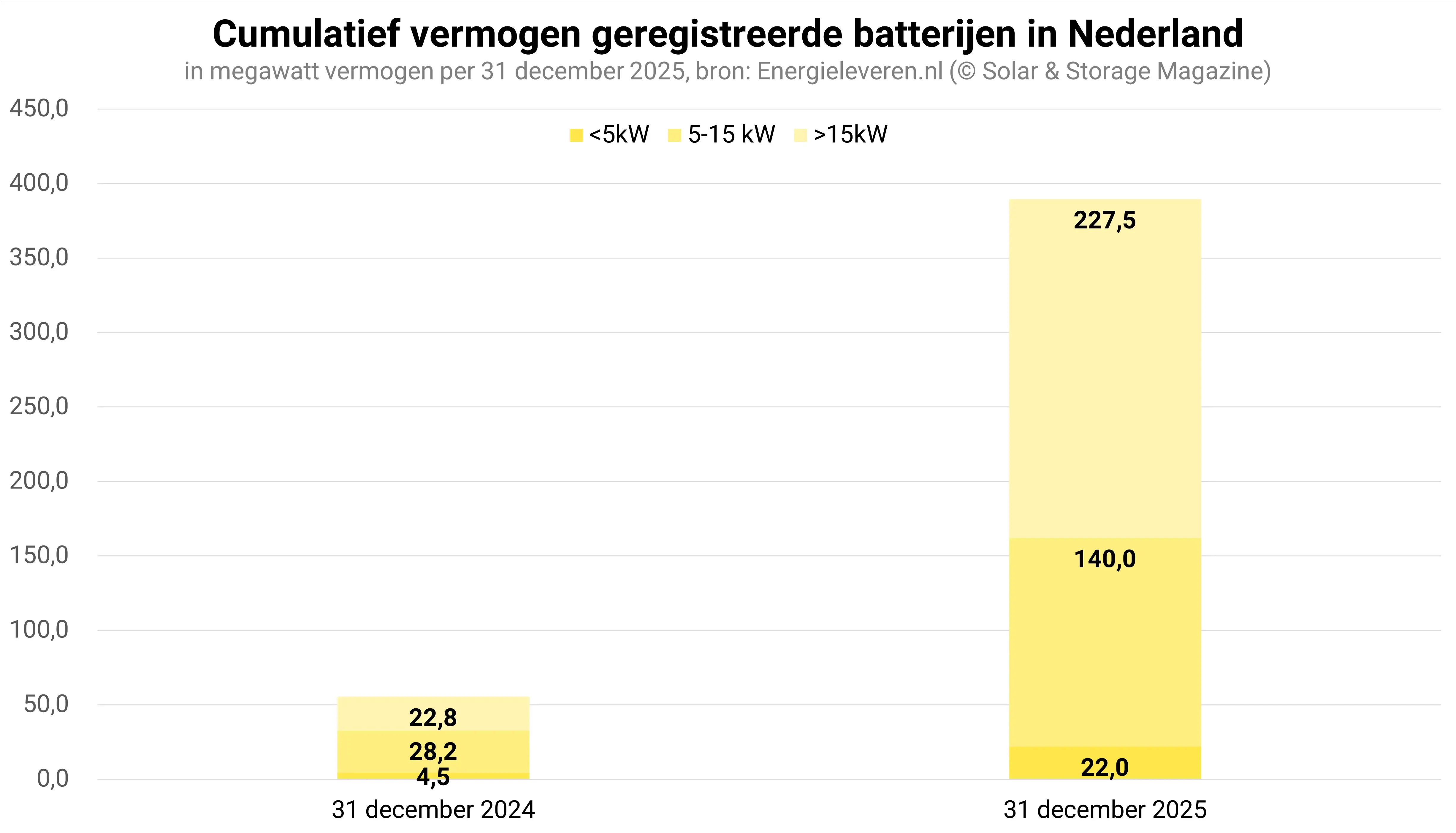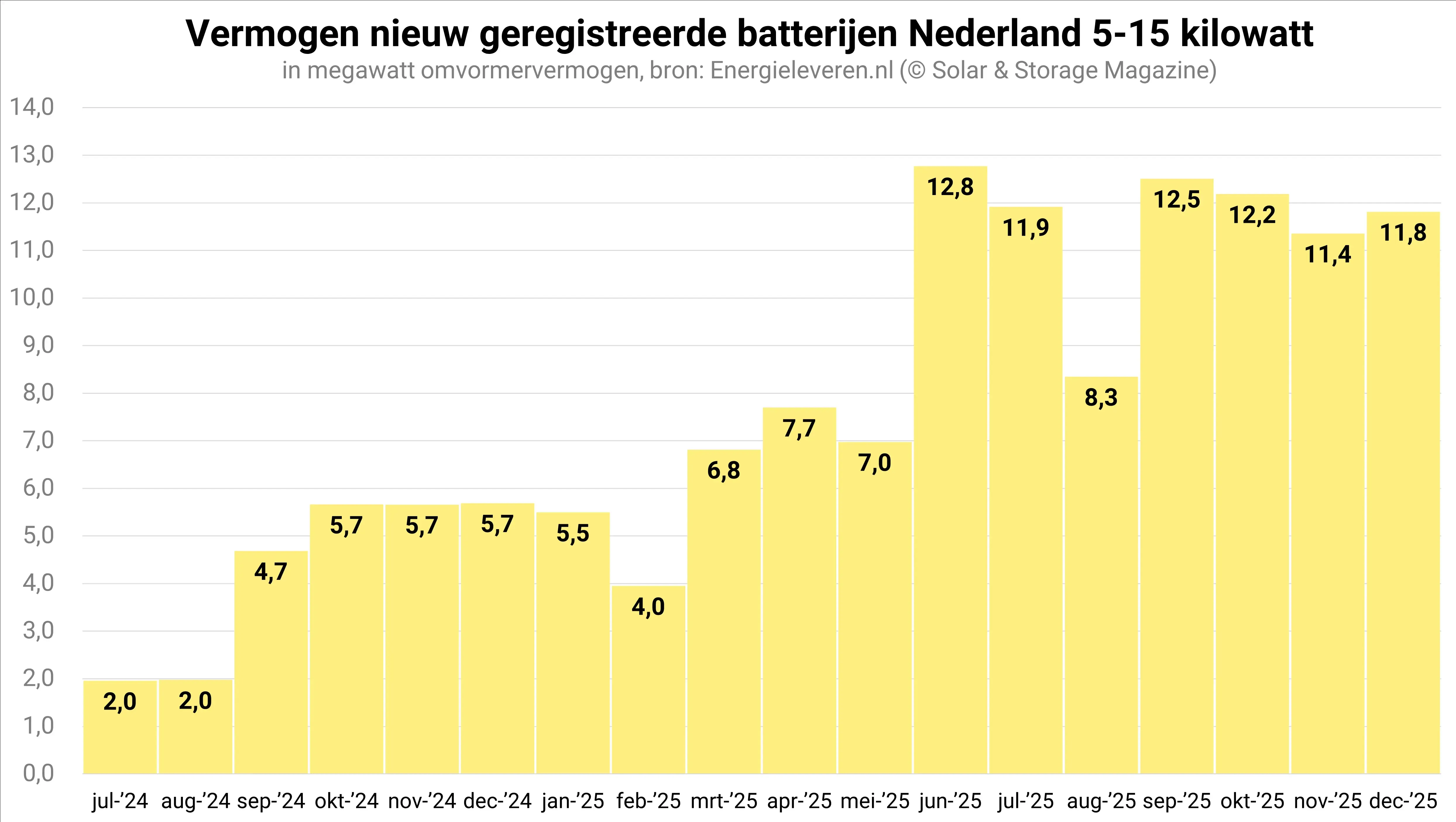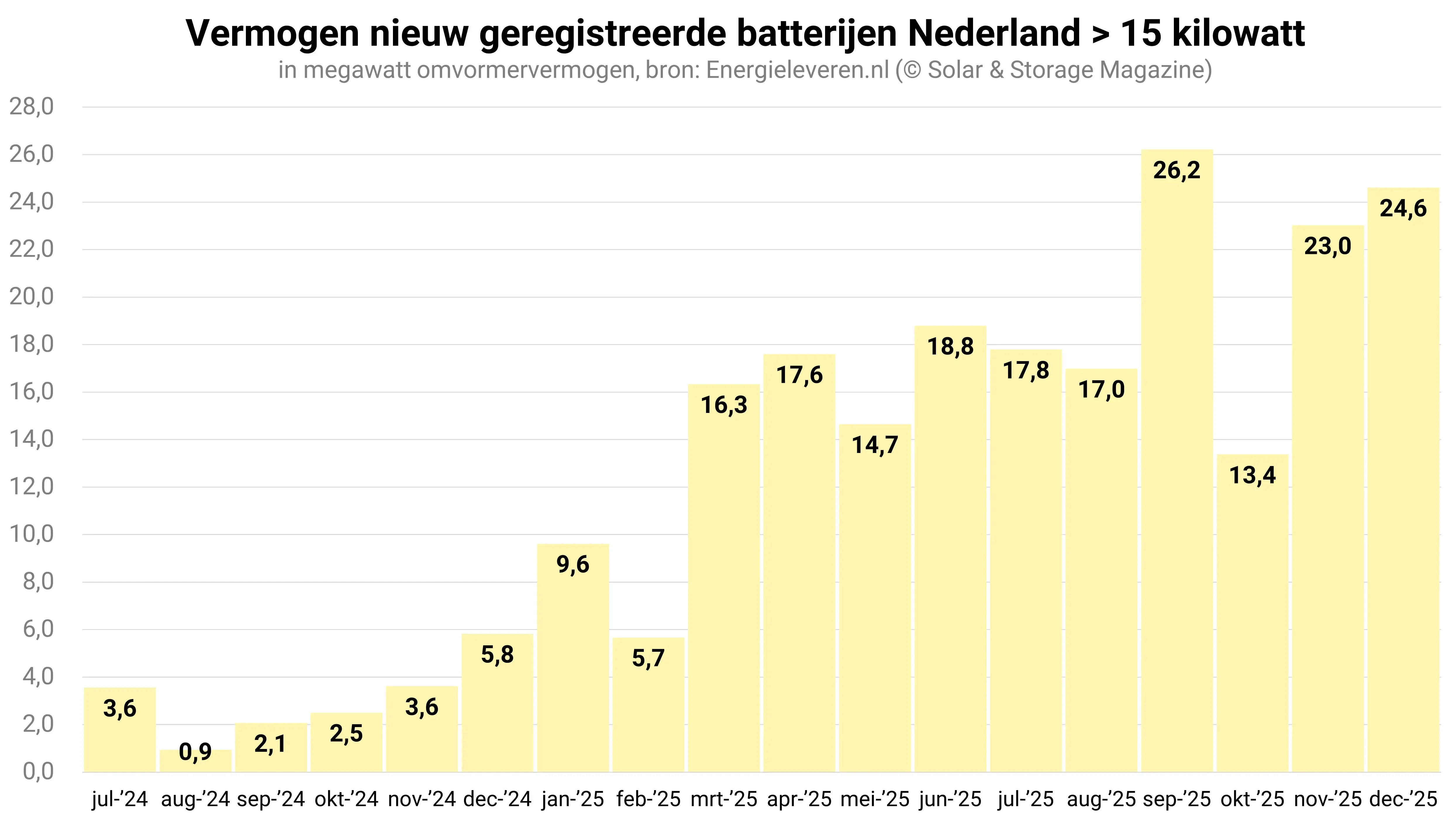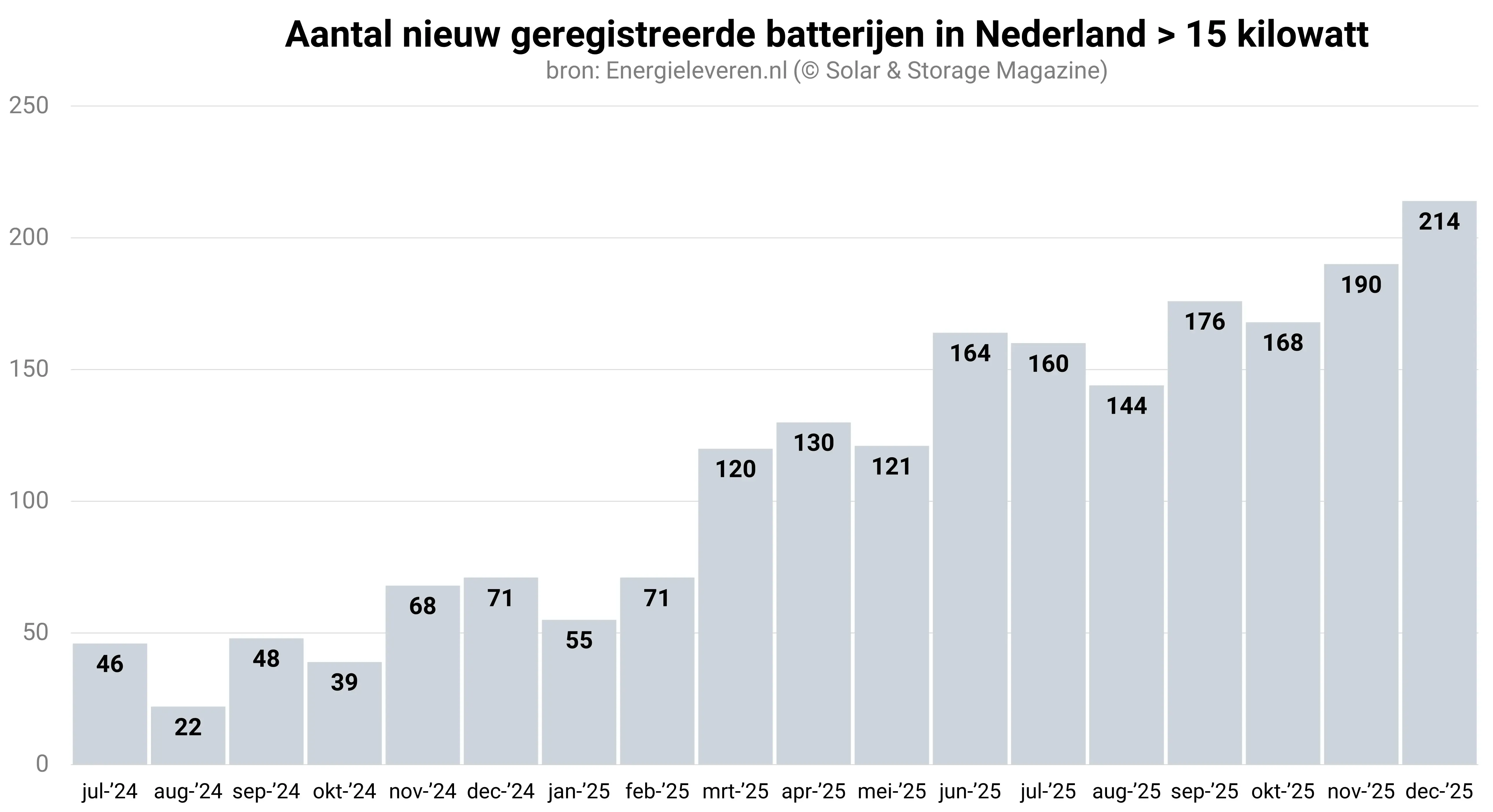 De categorie van de grotere batterijen – die met een vermogen boven de 15 kilowatt maar onder 1 megawatt – laat een vrijwel onophoudelijke groei zien. In de maand december werd daarbij in deze categorie een recordaantal van 214 batterijen geregistreerd. Ter vergelijking: dat zijn er ruim 3 keer zoveel als in december vorig jaar. Deze batterijen bevinden zich vermoedelijk bijna allemaal in het zakelijke segment, waar onder meer agrariërs en bedrijven die met netcongestie kampen de batterij massaal omarmen.