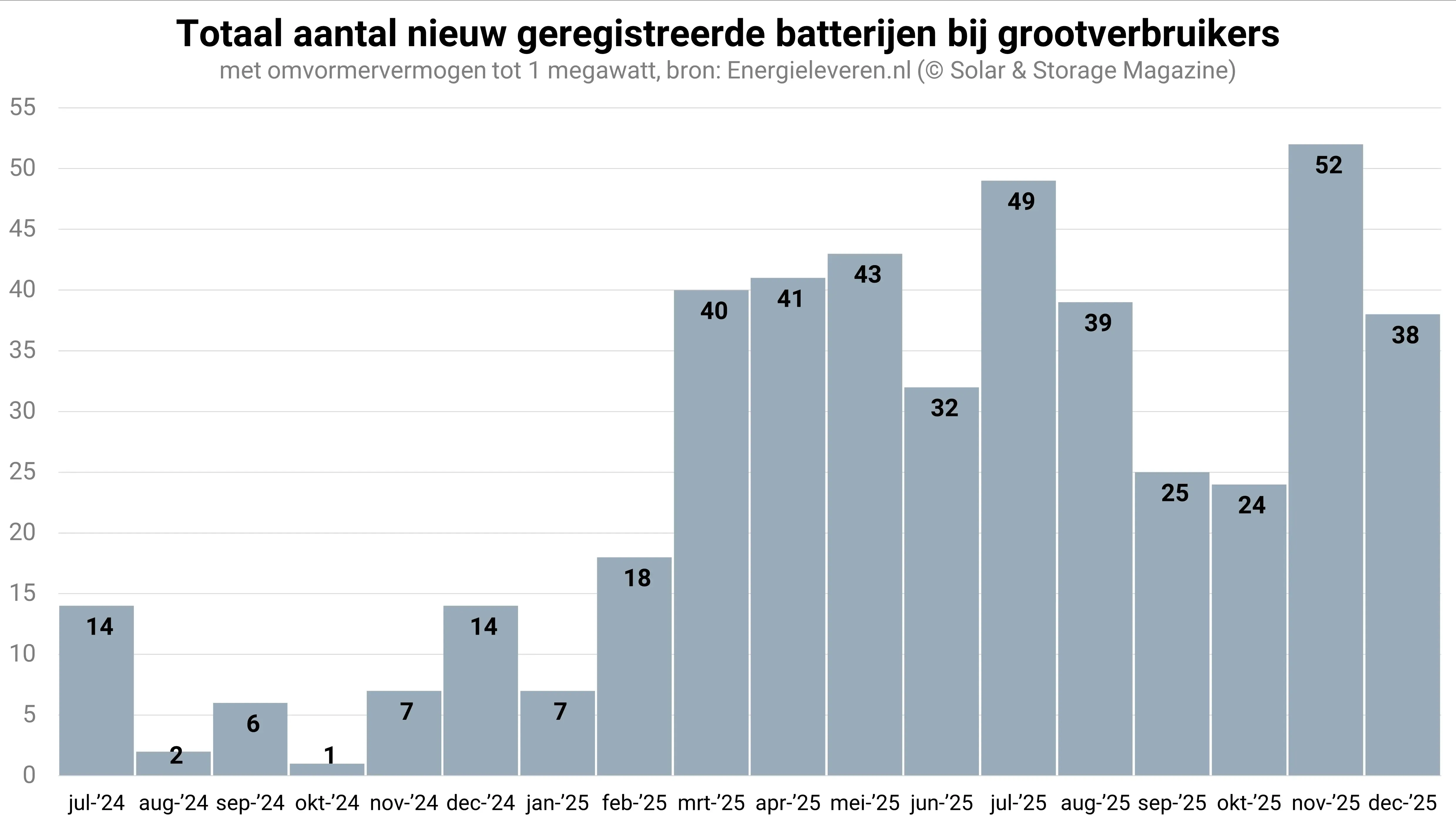 Bij grootverbruikers vormden de maanden september en oktober juist een negatieve uitzondering en werd in november een recordaantal van 52 batterijen geregistreerd. In december ging het om 38 batterijen.