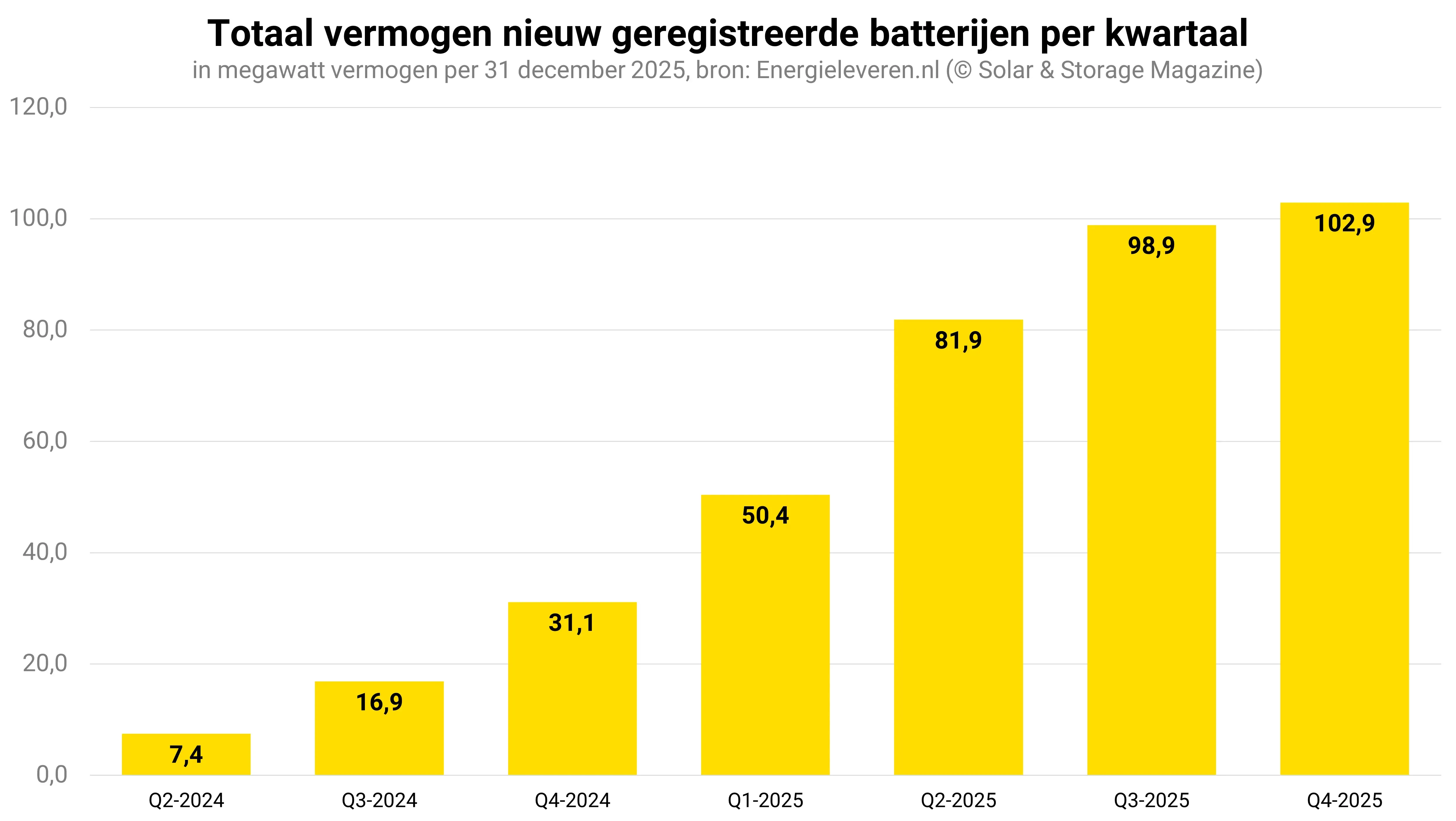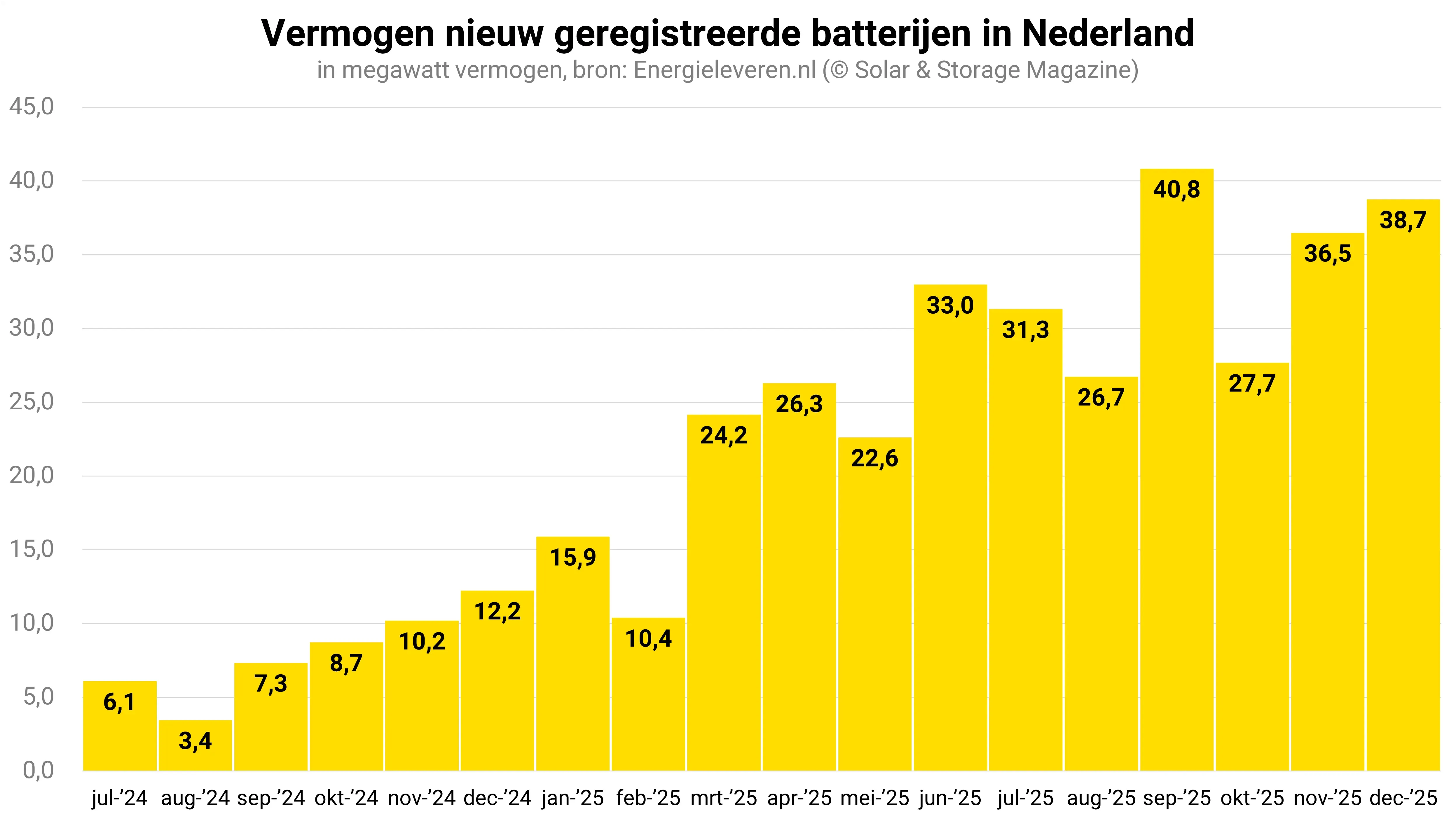 De totale capaciteit van de nieuw geregistreerde batterijen, gemeten in megawatt vermogen, ligt sinds de zomer op gemiddeld 33,6 megawatt. In de eerste helft van 2025 lag dat nog op 22,0 megawatt per maand. Hoeveel opslagcapaciteit – uitgedrukt in kilowattuur – met het geregistreerde batterijvermogen gemoeid is, is niet bekend.
