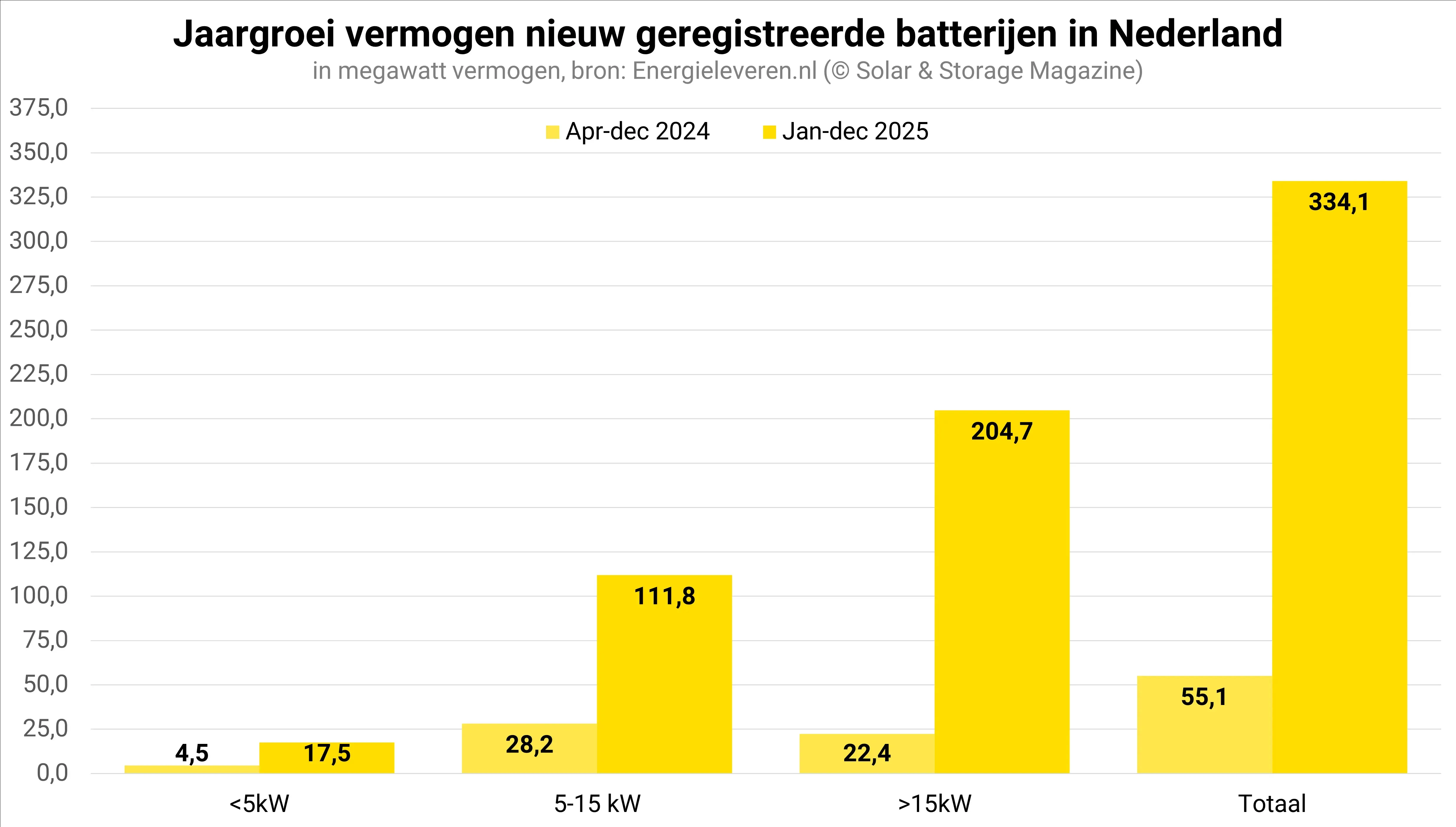 Gekeken naar de totale hoeveelheid nieuw geregistreerd batterijvermogen in 2025, dan is het meeste vermogen geregistreerd in de categorie van de grootste batterijen – die met een vermogen boven de 15 kilowatt. Deze categorie heeft in totaal 204,7 megawatt aan nieuw geregistreerd vermogen opgeleverd.