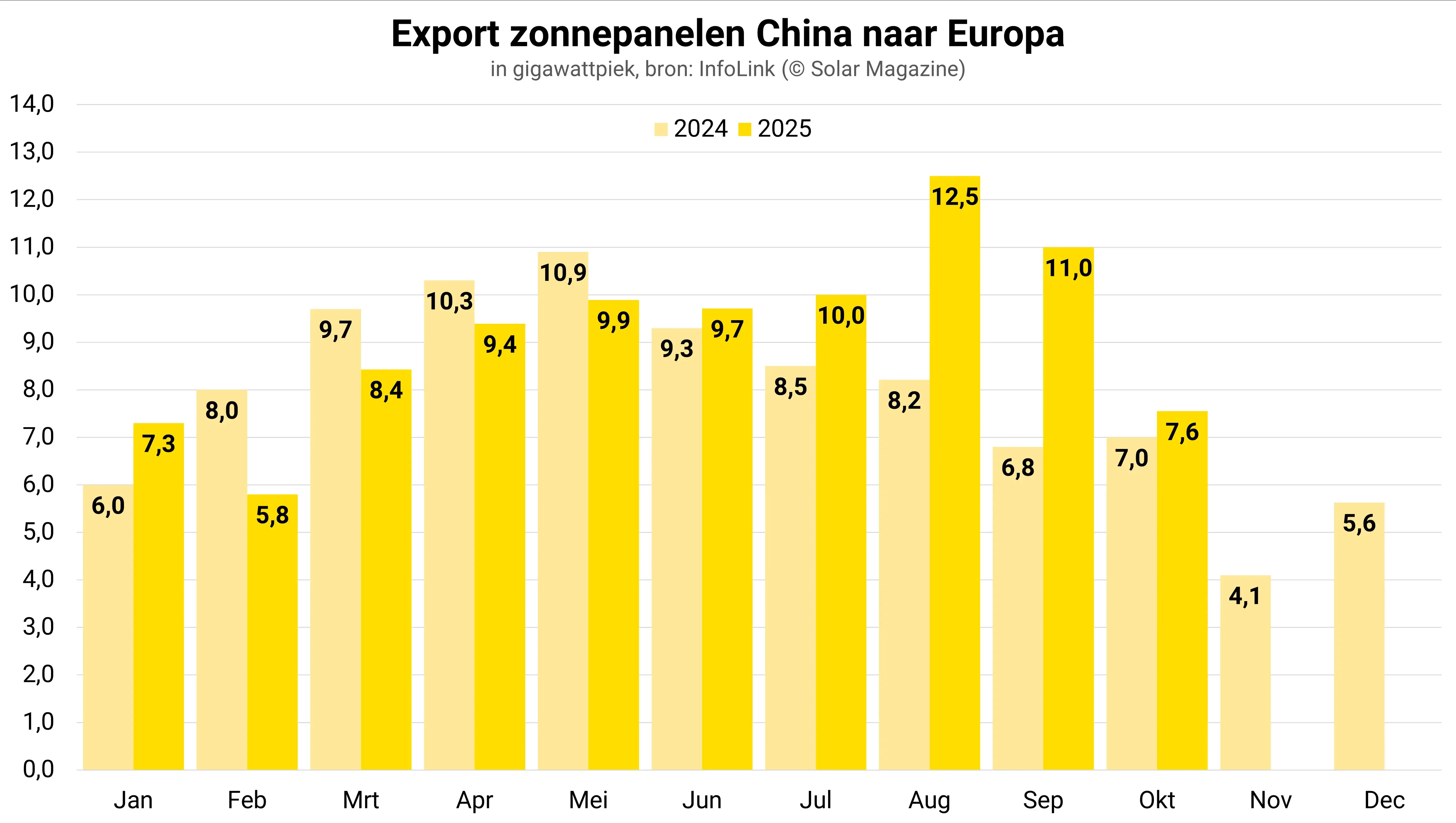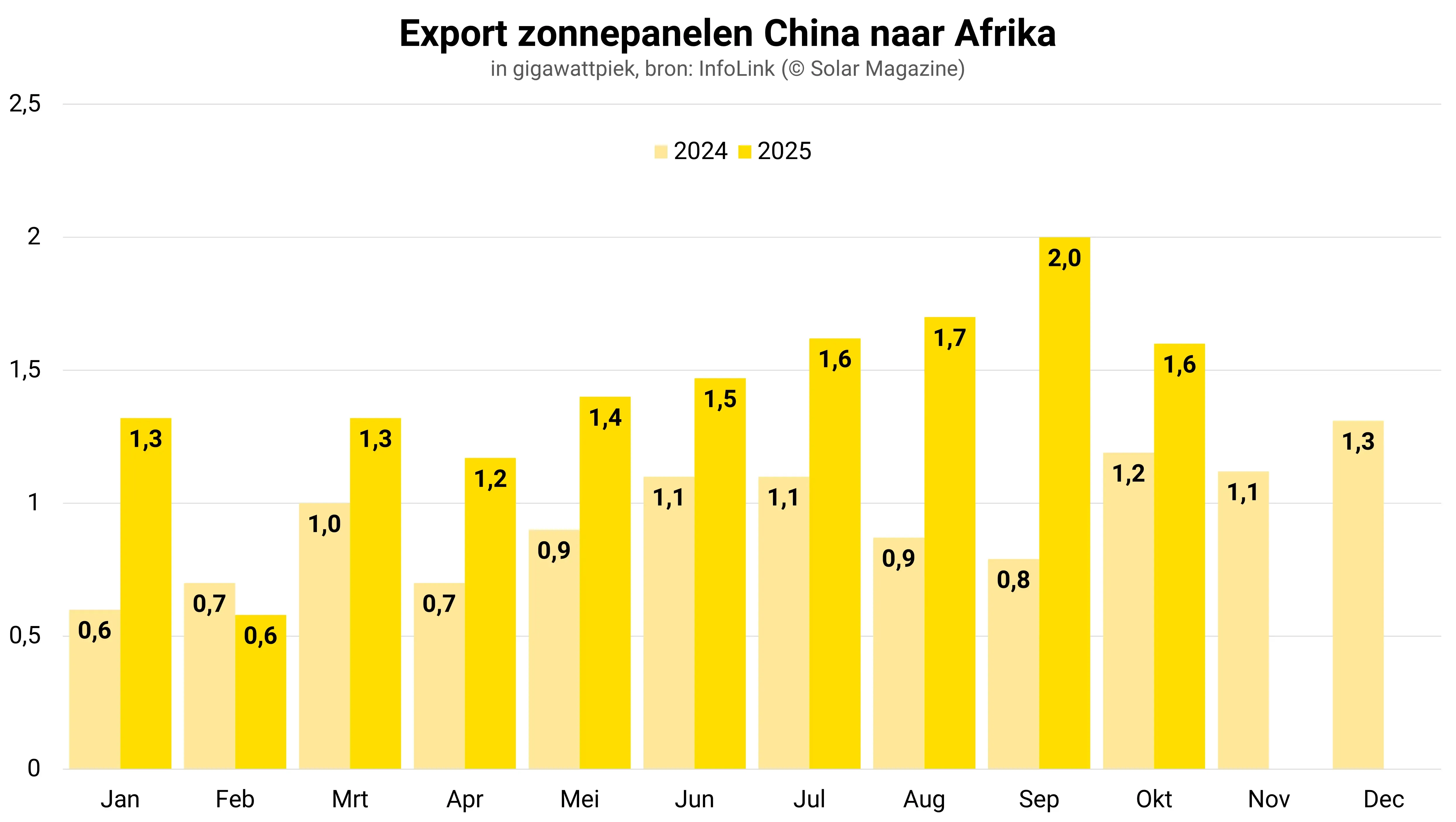 Afrika importeerde in oktober 1,6 gigawattpiek uit China, een daling van 22 procent op maandbasis en een groei van 30 procent op jaarbasis. Van januari tot oktober bereikte de cumulatieve import een niveau van 14,17 gigawattpiek, een sterke stijging van 57 procent vergeleken met vorig jaar.