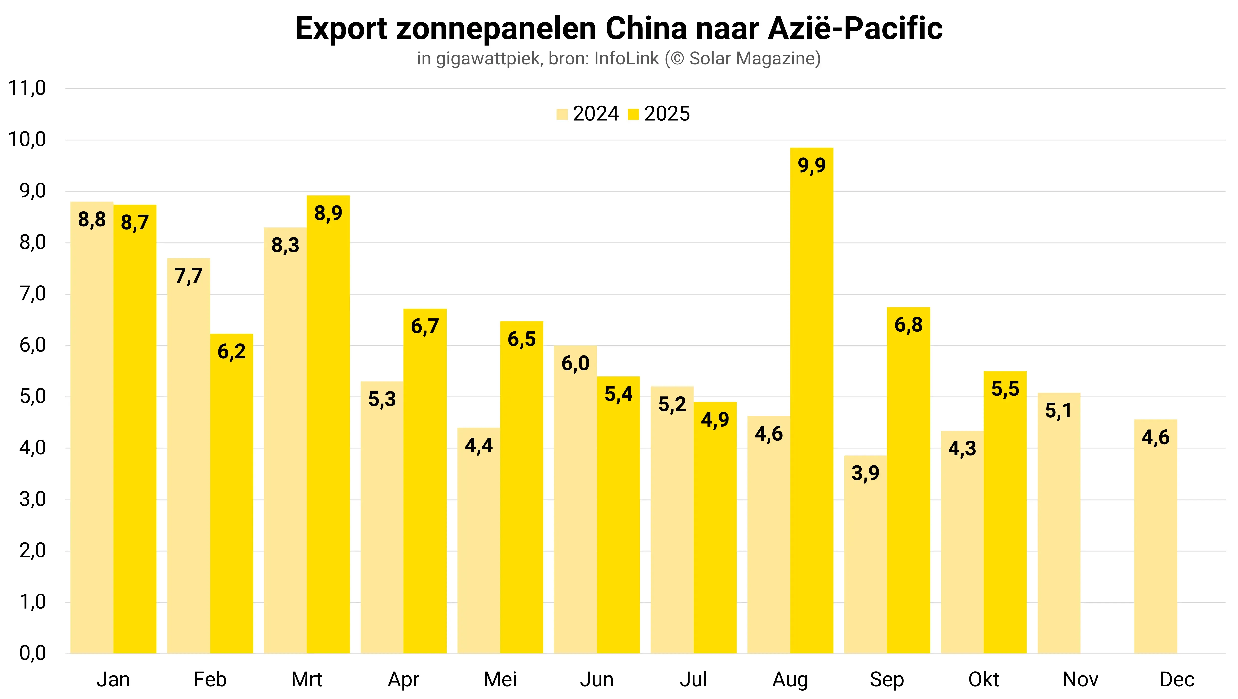 De Aziatisch-Pacifische regio importeerde in oktober 5,5 gigawattpiek, een daling van 17 procent op maandbasis maar een groei van 27 procent op jaarbasis. Van januari tot oktober bereikte de totale import naar de regio een niveau van 69 gigawattpiek, 18 procent meer dan vorig jaar. Japan werd in oktober de grootste importeur in de regio door Pakistan te overtreffen. Vereenvoudigde goedkeuringsprocedures voor kleine en middelgrote projecten hebben de vraag in Japan aangewakkerd. Bovendien ondersteunen beleidsmaatregelen die zonnepanelen op daken van nieuwe gebouwen in Tokyo verplichten de vraag verder. In oktober bedroeg de Japanse import 0,63 gigawattpiek, wat 11 procent van de Aziatisch-Pacifische markt vertegenwoordigt.