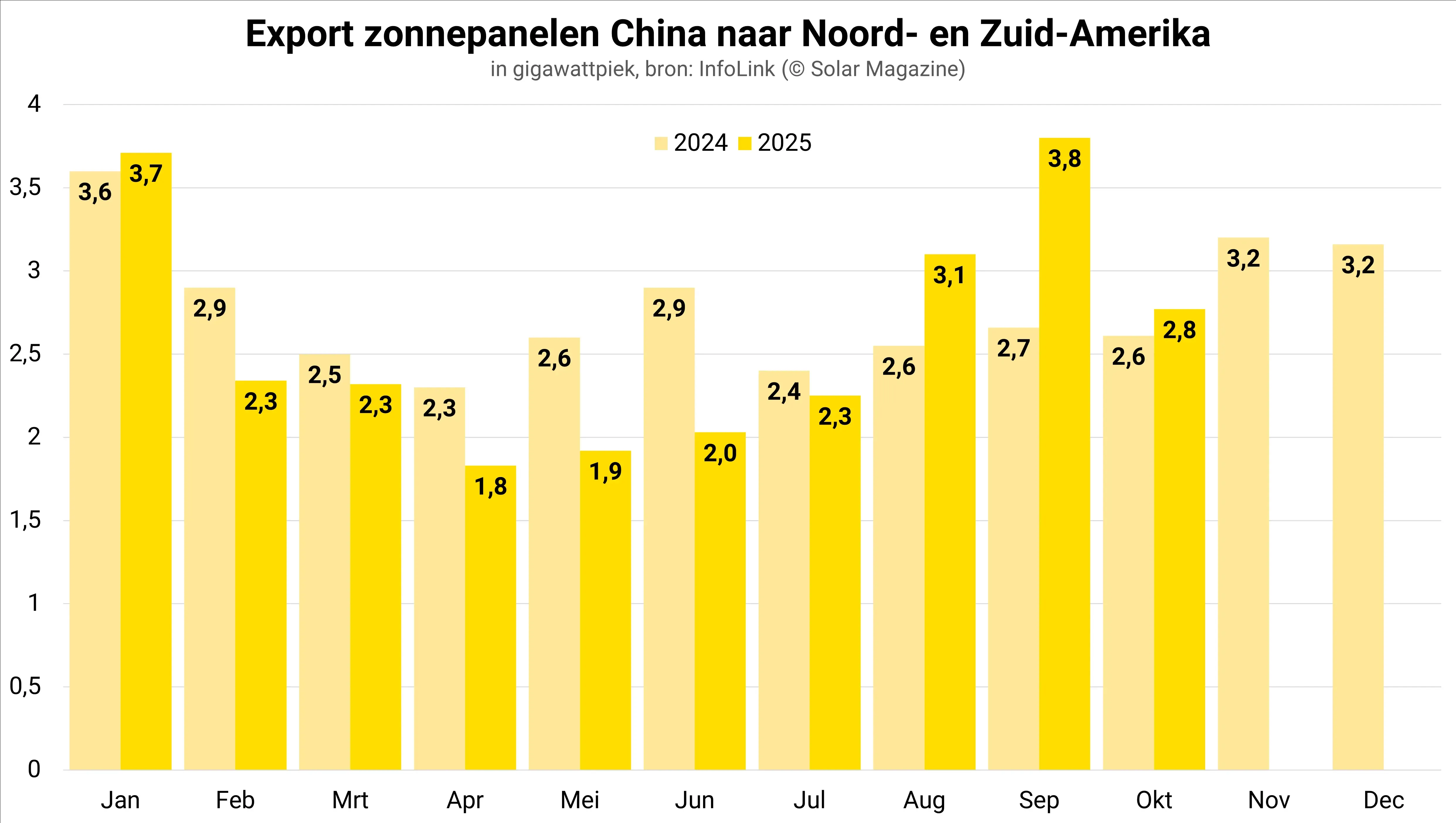 Noord- en Zuid-Amerika importeerden in oktober 2,77 gigawattpiek aan zonnepanelen uit China, een daling van 27 procent ten opzichte van september en een groei van 6 procent op jaarbasis. Van januari tot oktober 2025 bedroeg de totale import naar Amerika’s 26 gigawattpiek, een lichte daling van 4 procent vergeleken met vorig jaar.