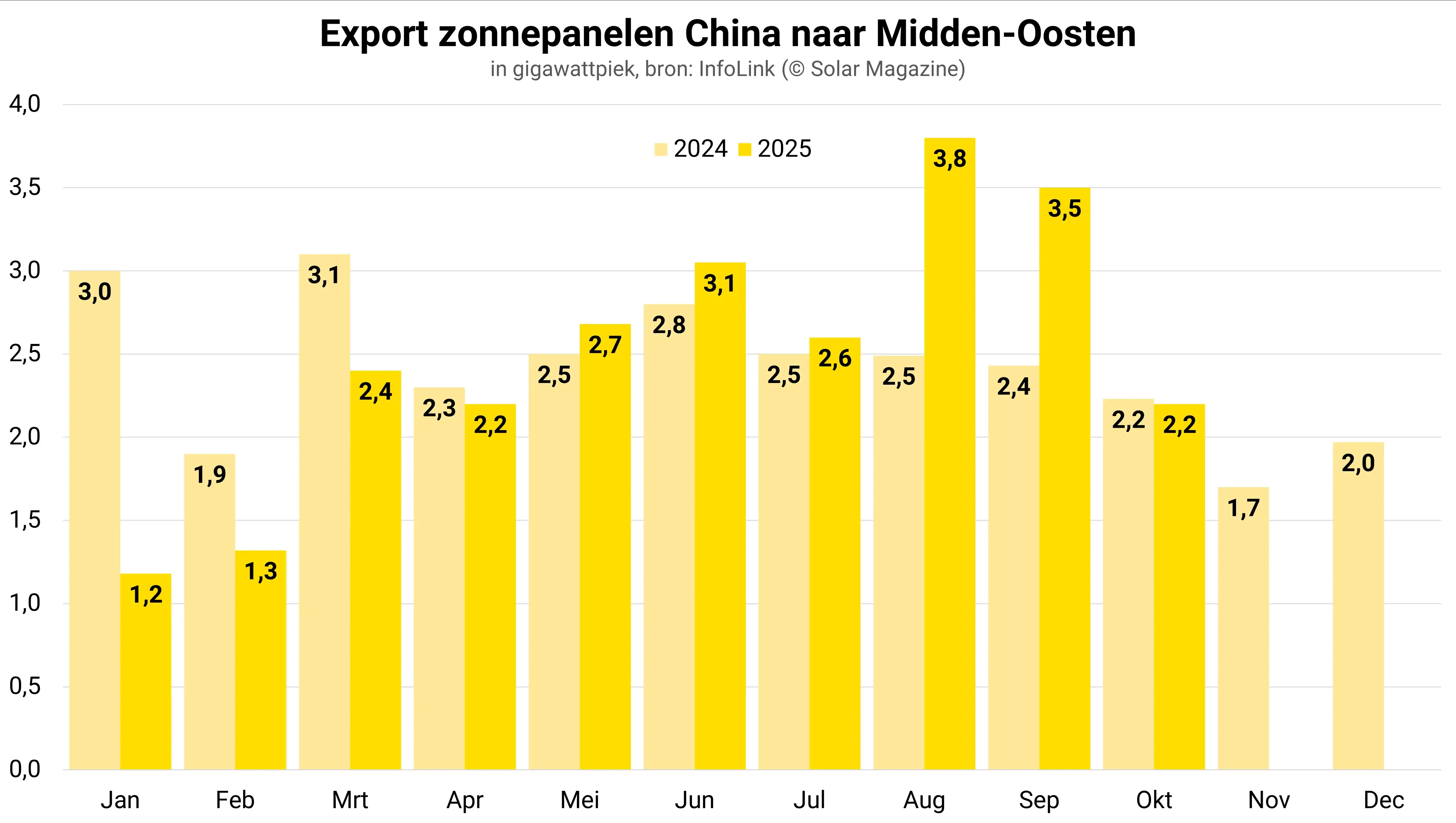 Het Midden-Oosten importeerde in oktober 2,93 gigawattpiek aan zonnepanelen uit China, een daling van 14 procent ten opzichte van september maar een groei van 33 procent vergeleken met 2024. Van januari tot oktober bedroeg de cumulatieve import 25,6 gigawattpiek, een lichte stijging van 2 procent op jaarbasis.