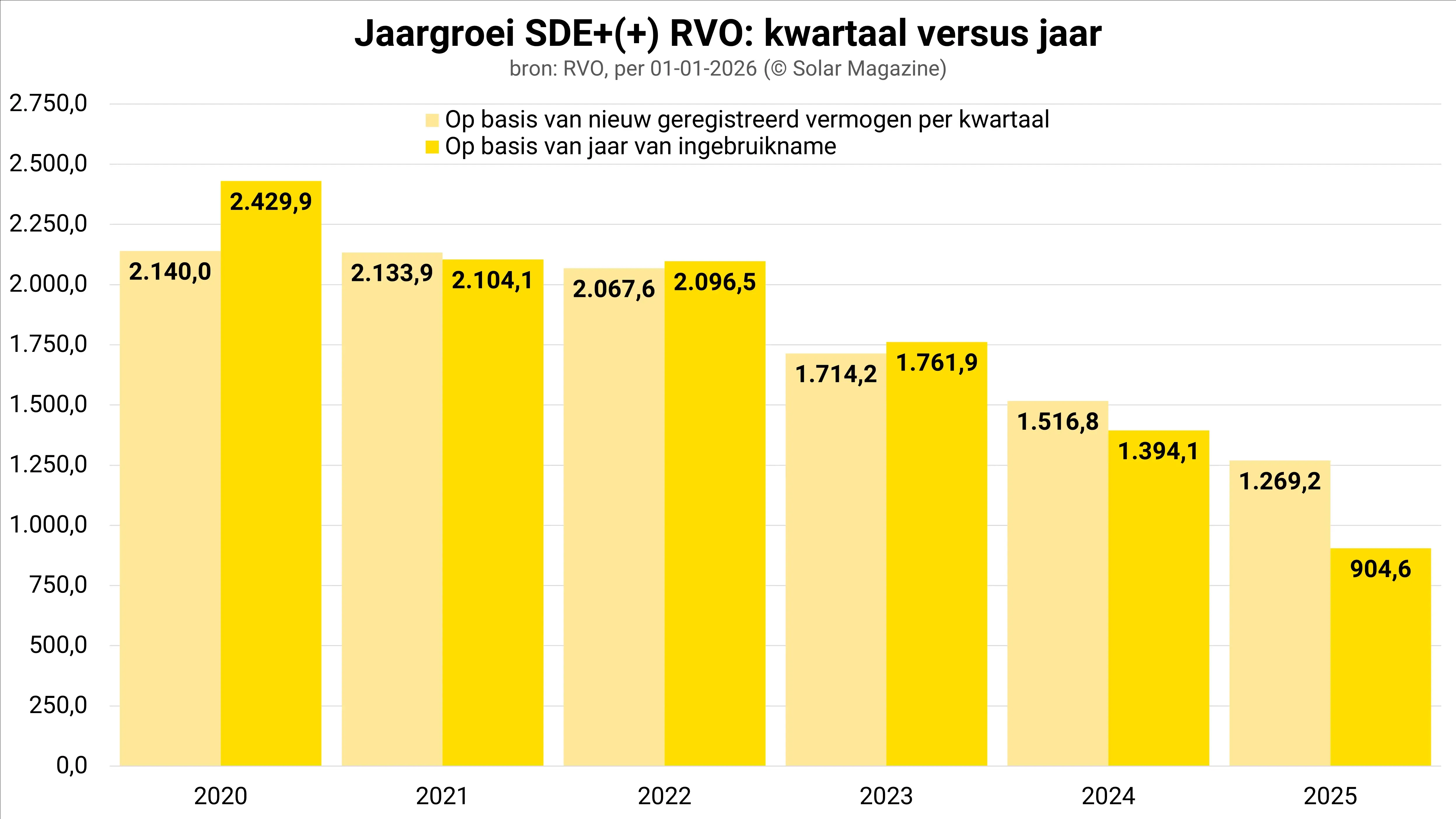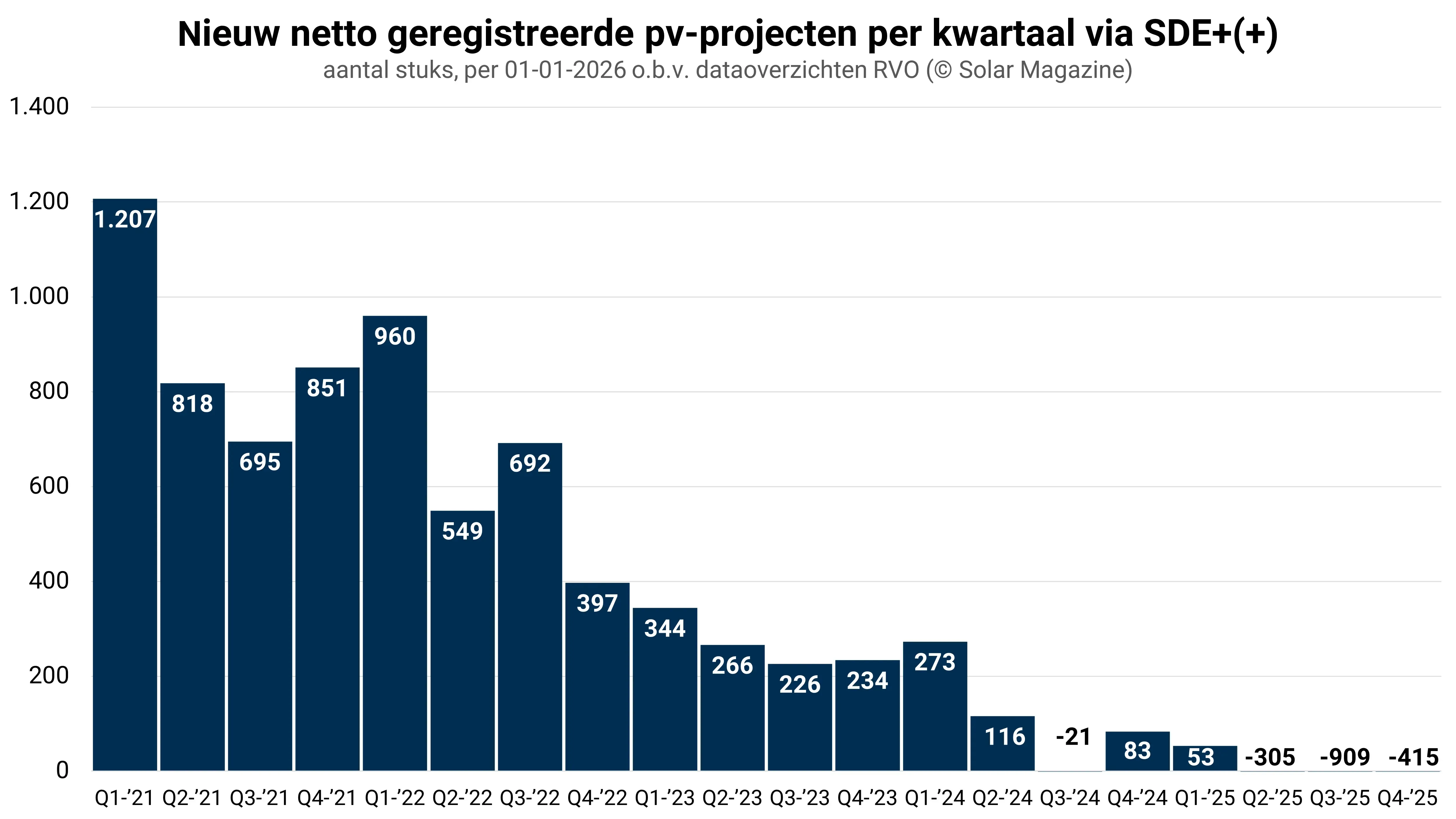 Het nog te installeren vermogen bedraagt volgens RVO per 1 januari 2026 nog ruim 5,2 gigawattpiek. Dat is wel zo’n 1,2 gigawattpiek minder dan op 1 januari 2025. Dit komt mede doordat het afgelopen kwartaal van maar liefst 906,5 megawattpiek aan projecten de beschikking is vervallen.
