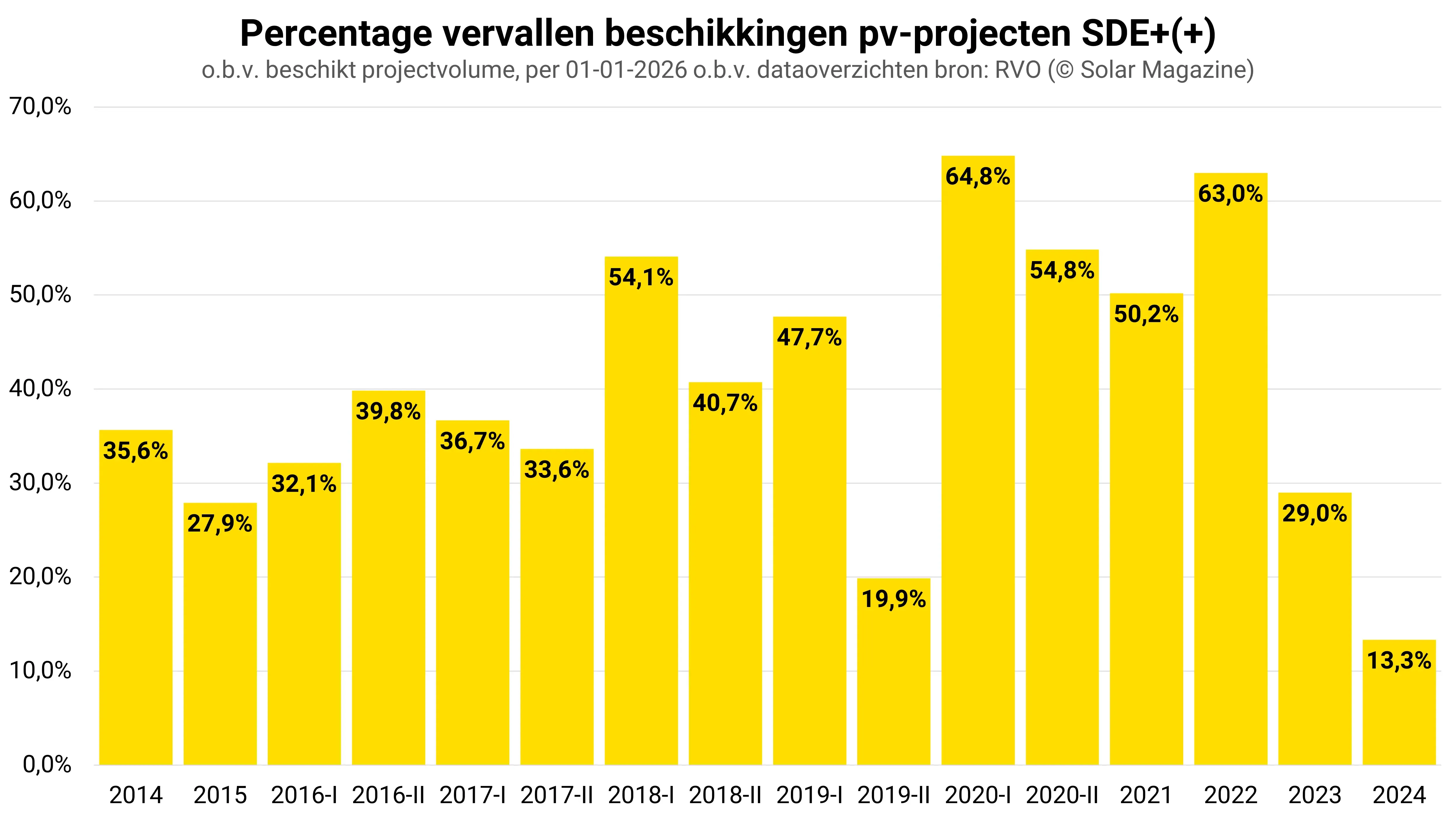 Inmiddels is uit de subsidierondes 2014-2022 bijna 14,5 gigawattpiek aan pv-projecten vervallen; oftewel bijna 44 procent van het totaal beschikte projectvolume in die periode.
