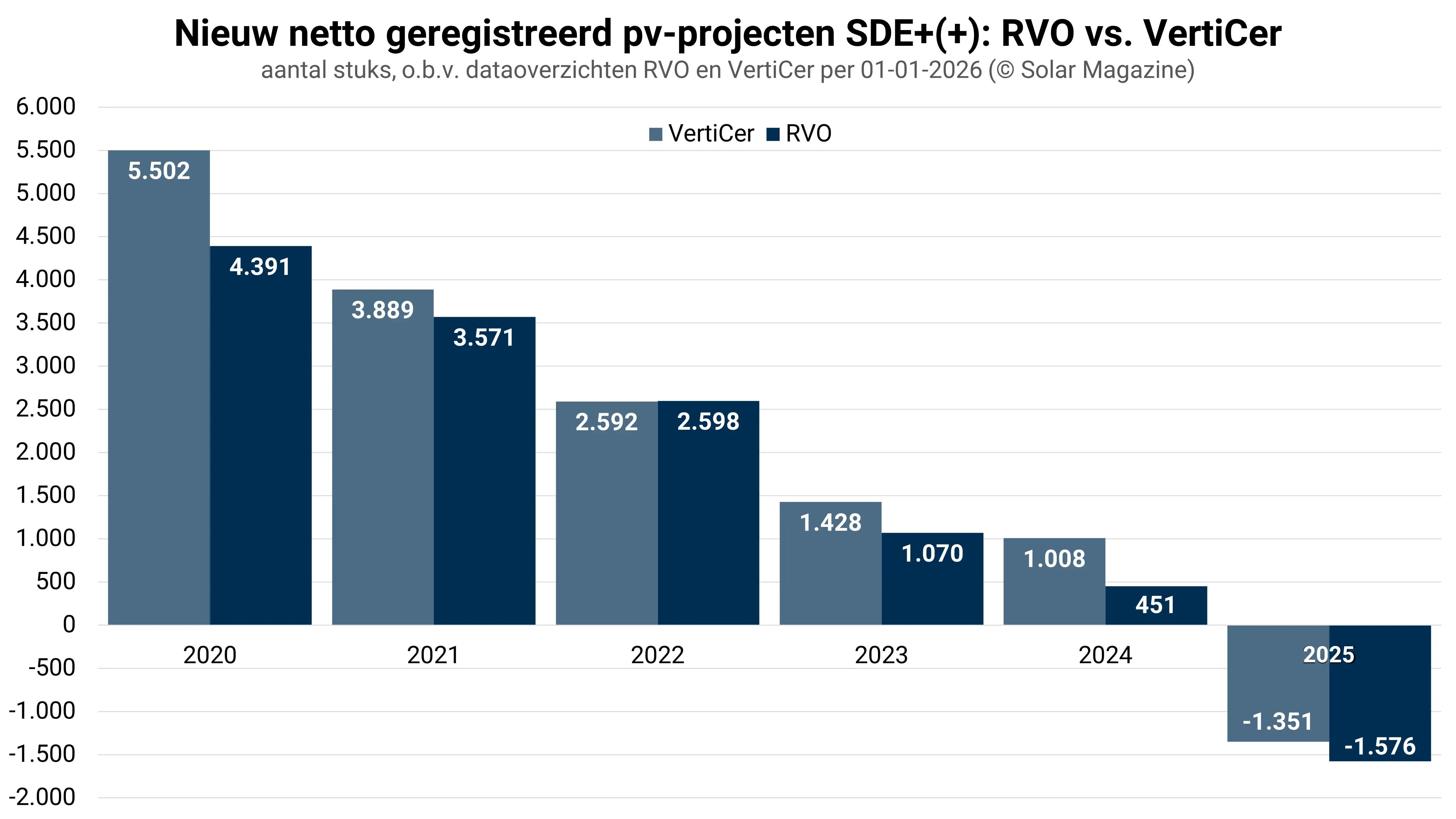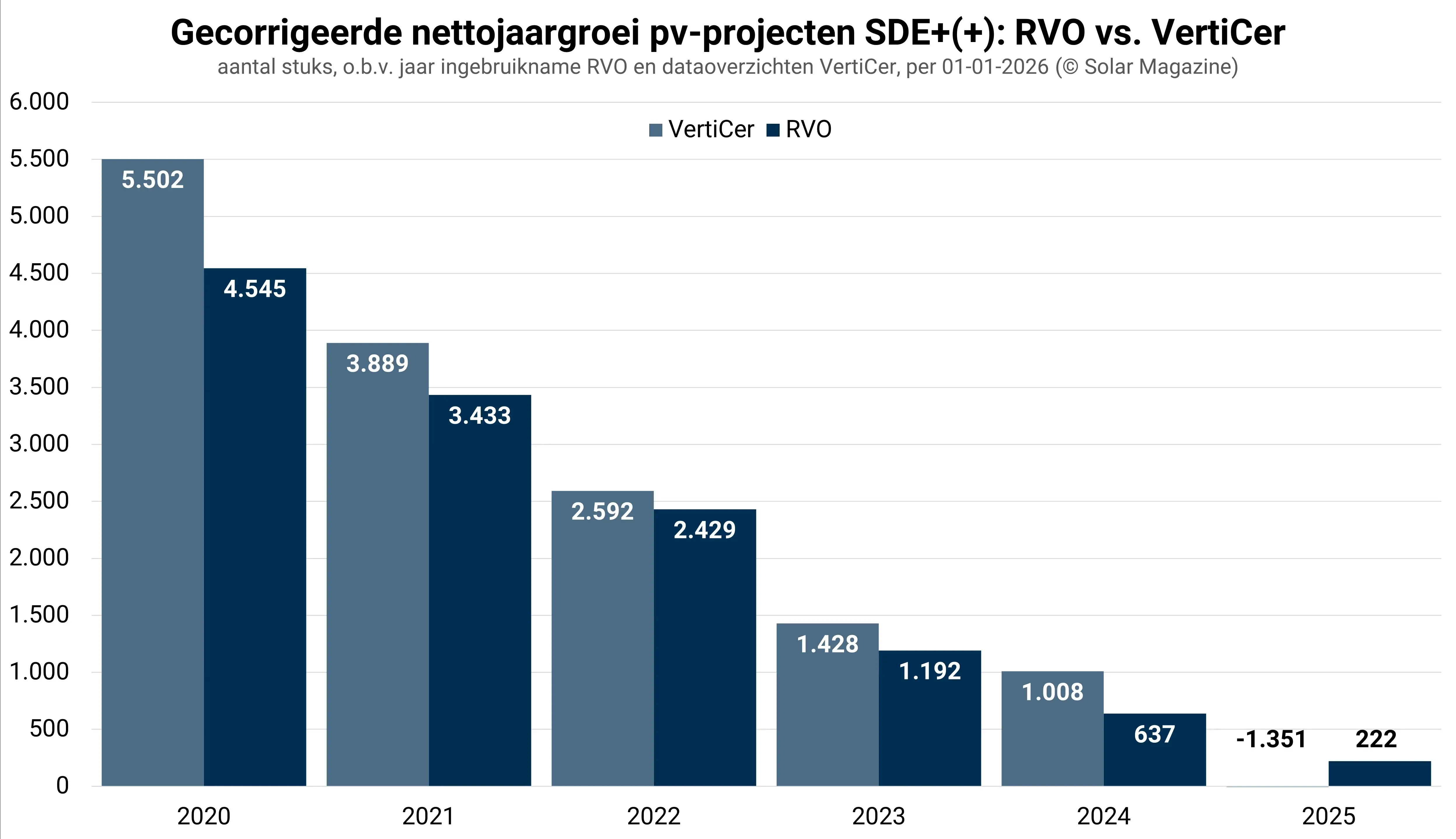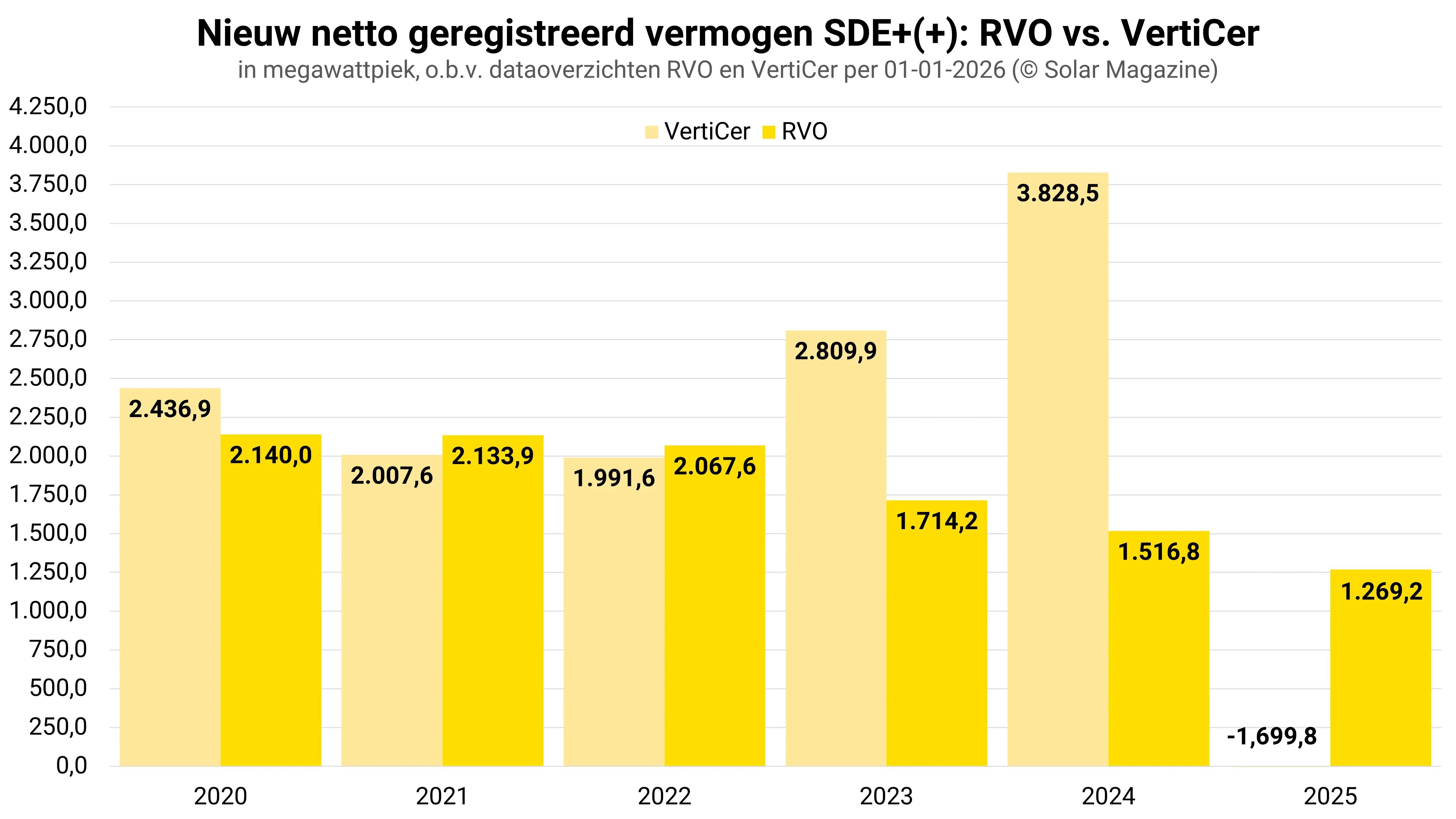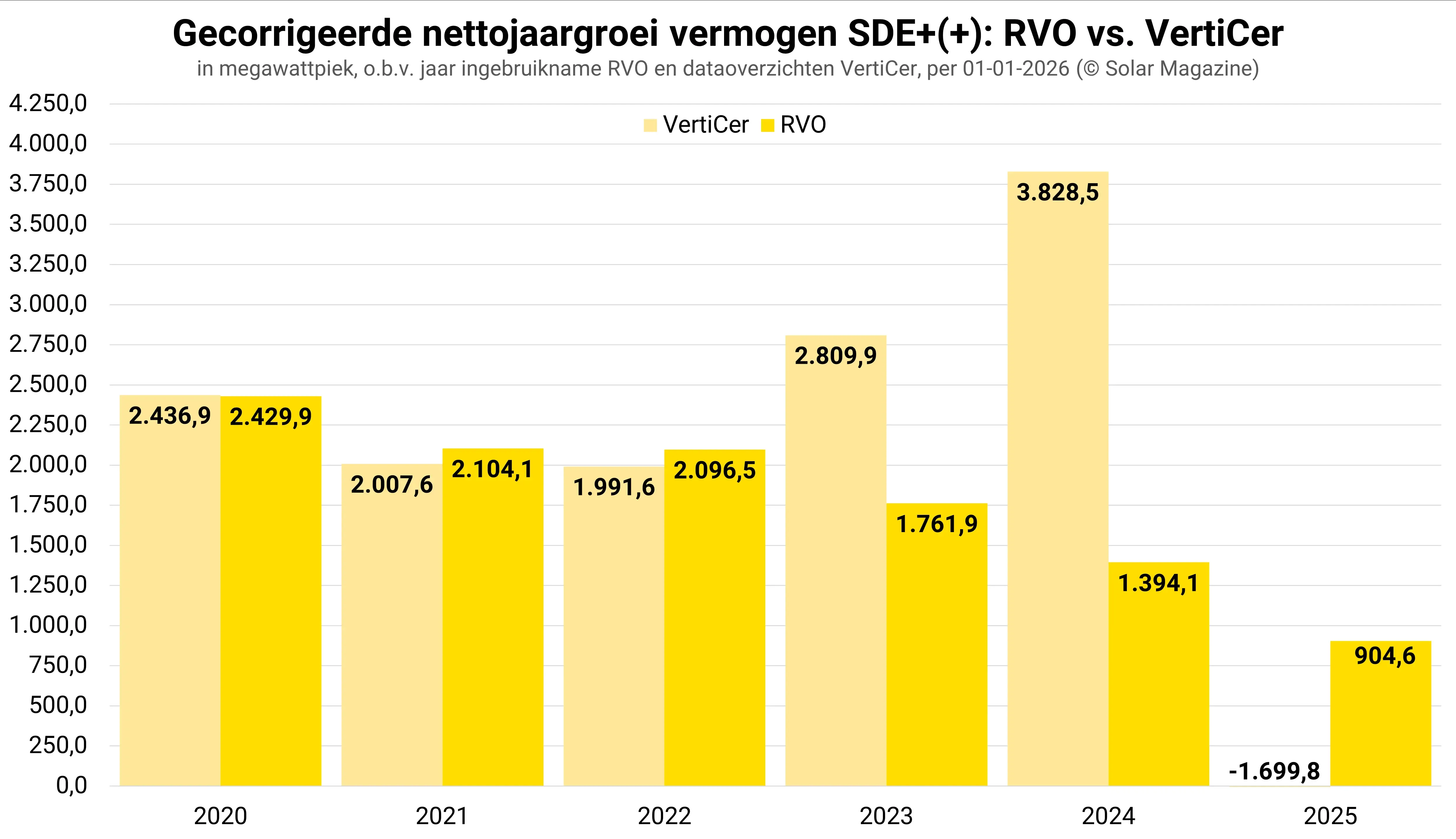 Ondanks de correcties voor eerdere jaren loopt de door RVO geregistreerde jaargroei voor het kalenderjaar 2023 qua gerealiseerd volume in megawattpiek nog altijd fors achter op die van VertiCer. Het verschil tussen de cijfers van VertiCer en RVO voor 2023 bedraagt inmiddels zelfs ruim 1 gigawattpiek, voor 2024 is er bovendien een onverklaarbaar verschil van ruim 2,5 gigawattpiek. De groeicijfers voor de kalenderjaren 2020, 2021 en 2022 liggen een stuk dichter bij elkaar en krijgen steeds meer een definitief karakter.